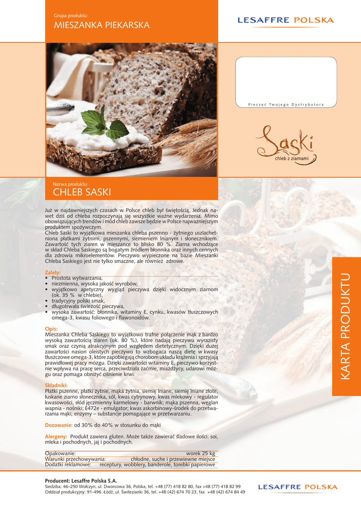 Grupa produktu: MIESZANKA PIEKARSKA P i e c z ´ ç Tw o j e g o D y s t r y b u t o r a Nazwa produktu: CHLEB SASKI Zalety: • Prostota wytwarzania, • niezmienna, wysoka jakoÊç wyrobów, • wyjàtkowo apetyczny wyglàd pieczywa dzi´ki widocznym ziarnom (ok. 35 % w chlebie), • tradycyjny polski smak, • d∏ugotrwa∏a Êwie˝oÊç pieczywa, • wysoka zawartoÊç: b∏onnika, witaminy E, cynku, kwasów t∏uszczowych omega-3, kwasu foliowego i flawonoidów. Opis: Mieszanka Chleba Saskiego to wyjàtkowo trafne po∏àczenie màk z bardzo wysokà zawartoÊcià ziaren (ok. 80 %), które nadajà pieczywu wyrazisty smak oraz czynià atrakcyjnym pod wzgl´dem dietetycznym. Dzi´ki du˝ej zawartoÊci nasion oleistych pieczywo to wzbogaca naszà diet´ w kwasy t∏uszczowe omega-3, które zapobiegajà chorobom uk∏adu krà˝enia i sprzyjajà prawid∏owej pracy mózgu. Dzi´ki zawartoÊci witaminy E, pieczywo korzystnie wp∏ywa na prac´ serca, przeciwdzia∏a zaçmie, mia˝d˝ycy, udarowi mózgu oraz pomaga obni˝yç ciÊnienie krwi. Sk∏adniki: P∏atki pszenne, p∏atki ˝ytnie, màka ˝ytnia, siemi´ lniane, siemi´ lniane z∏ote, ∏uskane ziarno s∏onecznika, sól, kwas cytrynowy, kwas mlekowy - regulator kwasowoÊci, s∏ód j´czmienny karmelowy - barwnik; màka pszenna, w´glan wapnia - noÊniki; E472e - emulgator; kwas askorbinowy-Êrodek do przetwarzania màki; enzymy – substancje pomagajàce w przetwarzaniu. Dozowanie: od 30% do 40% w stosunku do màki Alergeny: Produkt zawiera gluten. Mo˝e tak˝e zawieraç Êladowe iloÊci: soi, mleka i pochodnych, jaj i pochodnych. Opakowanie: worek 25 kg Warunki przechowywania: ch∏odne, suche i przewiewne miejsce Dodatki reklamowe: receptury, wobblery, banderole, torebki papierowe Producent: Lesaffre Polska S.A. Siedziba: 46–250 Wo∏czyn, ul. Dworcowa 36, Polska, tel. +48 (77) 418 82 80, fax +48 (77) 418 82 99 Oddzia∏ produkcyjny: 91-496 ¸ódê, ul. Âwitezianki 36, tel. +48 (42) 674 70 23, fax +48 (42) 674 84 49 KARTA PRODUKTU Ju˝ w najdawniejszych czasach w Polsce chleb by∏ Êwi´toÊcià. Jednak nawet dziÊ od chleba rozpoczynajà si´ wszystkie wa˝ne wydarzenia. Mimo obowiàzujàcych trendów i mód chleb zawsze b´dzie w Polsce najwa˝niejszym produktem spo˝ywczym. Chleb Saski to wyjàtkowa mieszanka chleba pszenno - ˝ytniego uszlachetniona p∏atkami ˝ytnimi, pszennymi, siemieniem lnianym i s∏onecznikiem. ZawartoÊç tych ziaren w mieszance to blisko 80 %. Ziarna wchodzàce w sk∏ad Chleba Saskiego sà bogatym êród∏em b∏onnika oraz innych cennych dla zdrowia mikroelementów. Pieczywo wypieczone na bazie Mieszanki Chleba Saskiego jest nie tylko smaczne, ale równie˝ zdrowe. Grupa produktu: MIESZANKA PIEKARSKA P i e c z ´ ç Tw o j e g o D y s t r y b u t o r a Nazwa produktu: CHLEB SASKI Receptura na chleb Saski Receptura na bu∏ki Saskie Sk∏adniki Surowce w gramach Sk∏adniki Surowce w gramach Màka pszenna T750 6 000 Màka pszenna T550 7 000 MIESZANKA 4 000 MIESZANKA 3 000 Dro˝d˝e 300 Dro˝d˝e 300 Woda 6 200 Sól 40 Woda 5 800 RECEPTURA Receptura na chleb Saski z dodatkiem naturalnego zakwasu Sk∏adniki Surowce w gramach Màka pszenna T750 6 000 Màka ˝ytnia T720* 1 000 MIESZANKA 3 000 Dro˝d˝e 300 Woda 6 300 Sól 40 Wytwarzanie: Mieszank´ chleba Saskiego zalaç wodà. Po 10 minutach dodaç pozosta∏e sk∏adniki i miesiç do ˝àdanej konsystencji. Po wst´pnej fermentacji odwa˝yç k´sy i uformowaç. Uformowane k´sy obtoczyç w Posypce Ziarenka Lesaffre. Garowaç ok. 40-50 minut. Piec z parà. Temperatura wypieku:230°C®180°C Czas wypieku: 35-40 minut Temperatura wypieku:210-220°C Czas wypieku: oko∏o 15 minut *1 kg màki ˝ytniej to ok.1.6 kg naturalnego kwasu piekarskiego, w recepturze odliczamy wówczas wod´ zawartà w kwasie. Producent: Lesaffre Polska S.A. Siedziba: 46–250 Wo∏czyn, ul. Dworcowa 36, Polska, tel. +48 (77) 418 82 80, fax +48 (77) 418 82 99 Oddzia∏ produkcyjny: 91-496 ¸ódê, ul. Âwitezianki 36, tel. +48 (42) 674 70 23, fax +48 (42) 674 84 49