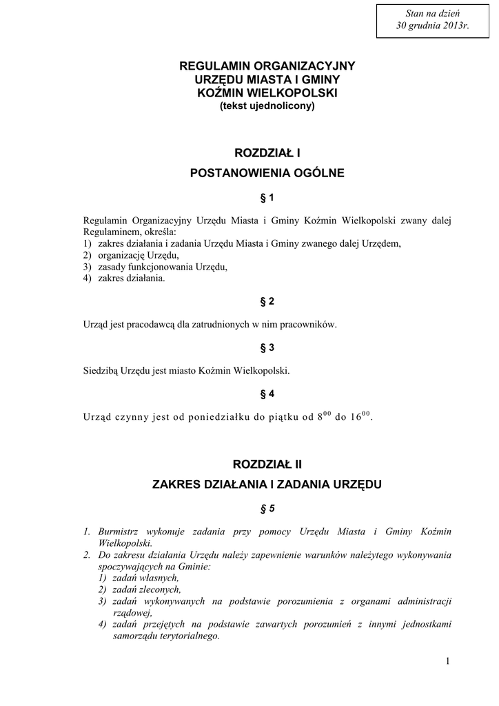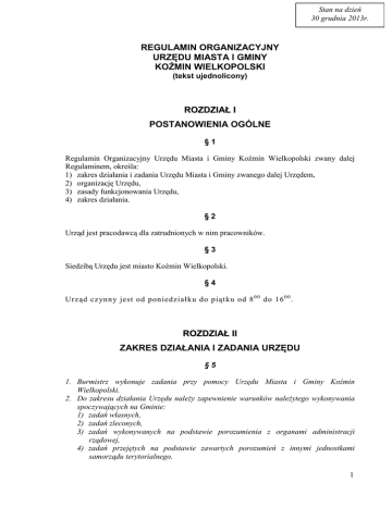 Stan na dzień 30 grudnia 2013r. REGULAMIN ORGANIZACYJNY URZĘDU MIASTA I GMINY KOŹMIN WIELKOPOLSKI (tekst ujednolicony) ROZDZIAŁ I POSTANOWIENIA OGÓLNE §1 Regulamin Organizacyjny Urzędu Miasta i Gminy Koźmin Wielkopolski zwany dalej Regulaminem, określa: 1) zakres działania i zadania Urzędu Miasta i Gminy zwanego dalej Urzędem, 2) organizację Urzędu, 3) zasady funkcjonowania Urzędu, 4) zakres działania. §2 Urząd jest pracodawcą dla zatrudnionych w nim pracowników. §3 Siedzibą Urzędu jest miasto Koźmin Wielkopolski. §4 Urząd cz ynn y jest od poniedziałku do piątku od 8 0 0 do 16 0 0 . ROZDZIAŁ II ZAKRES DZIAŁANIA I ZADANIA URZĘDU §5 1. Burmistrz wykonuje zadania przy pomocy Urzędu Miasta i Gminy Koźmin Wielkopolski. 2. Do zakresu działania Urzędu naleŜy zapewnienie warunków naleŜytego wykonywania spoczywających na Gminie: 1) zadań własnych, 2) zadań zleconych, 3) zadań wykonywanych na podstawie porozumienia z organami administracji rządowej, 4) zadań przejętych na podstawie zawartych porozumień z innymi jednostkami samorządu terytorialnego. 1 §6 W szczególności do zadań Urzędu naleŜy: 1) przygotowywanie materiałów niezbędnych do podejmowania uchwał, wydawania decyzji, postanowień i innych aktów z zakresu administracji publicznej oraz podejmowania innych czynności prawnych przez organy Gminy, 2) zapewnienie Burmistrzowi moŜliwości przyjmowania, rozpatrywania oraz załatwiania skarg i wniosków, 3) przygotowywanie materiałów do projektu budŜetu oraz jego realizacja, 4) realizacja uchwał Rady Miejskiej i zarządzeń Burmistrza, 5) zapewnienie warunków do odbywania sesji Rady Miejskiej, posiedzeń jej komisji, 6) udostępnia nieodpłatnie Dziennik Ustaw i Monitor Polski lub zawarte w nich akty normatywne i inne akty prawne, w tym orzeczenia: 1/ do wglądu i do pobrania w formie dokumentu elektronicznego, 2/ w postaci elektronicznej do powszechnego wglądu w godzinach pracy Urzędu, 7) wykonywanie prac kancelaryjnych zgodnie z obowiązującymi w tym zakresie przepisami prawa, a w szczególności: a) przyjmowanie, rozdział, przekazywanie i wysyłanie korespondencji, b) prowadzenie wewnętrznego obiegu akt, c) przechowywanie akt, d) brakowanie akt lub przekazywanie do archiwum, 8) realizacja obowiązków i uprawnień Urzędu jako pracodawcy – zgodnie z obowiązującymi w tym zakresie przepisami prawa pracy. ROZDZIAŁ III ORGANIZACJA URZĘDU §7 1. W skład Urzędu wchodzą: 1) Referat Podatków i Księgowość (PiK) − kierowany przez Skarbnika Gminy 2) Referat Inwestycji i Gospodarki Komunalnej (GK) − kierowany przez Zastępcę Burmistrza 3) Referat Organizacyjny i Spraw Obywatelskich (OSO) − kierowany przez Sekretarza Gminy 4) Referat Oświaty (RO) 5) Urząd Stanu Cywilnego (USC) 6) radca prawny (RP) 7) pełnomocnik ochrony informacji niejawnych (OIN) 8) stanowisko ds. audytu wewnętrznego (AW) 9) samodzielne stanowisko do spraw archiwum zakładowego (AZ) 2. Referatem Oświaty kieruje kierownik 3. Schemat organizacyjny Urzędu Miasta i Gminy Koźmin Wielkopolski przedstawia załącznik Nr 2 do regulaminu 2 ROZDZIAŁ IV ZASADY FUNKCJONOWANIA URZĘDU §8 1. Urzędem kieruje Burmistrz przy pomocy Zastępcy, Sekretarza i Skarbnika, którzy ponoszą odpowiedzialność przed Burmistrzem za realizację swoich zadań 2. Kierownicy referatów kierują i zarządzają nimi w sposób zapewniający optymalną realizację zadań referatów i ponoszą za to odpowiedzialność przed Burmistrzem. 3. Zasady podpisywania pism określa załącznik nr 1 Regulaminu. 4. W Urzędzie prowadzona jest kontrola wewnętrzna przez Sekretarza Gminy, Skarbnika Gminy i Kierownika Referatu Oświaty. Z kontroli sporządza się sprawozdania. 5. Burmistrz Miasta i Gminy Koźmin Wielkopolski przyjmuje w sprawie skarg i wniosków w poniedziałki od godz. 900 do 1700. 6. Skargi i wnioski przyjmuje i koordynuje ich rozpatrywanie stanowisko ds. organizacyjnych i kadr. ROZDZIAŁ V ZADANIA BURMISTRZA, ZASTĘPCY BURMISTRZA ORAZ KOMÓREK ORGANIZACYJNYCH I STANOWISK PRACY §9 Do zadań Burmistrza naleŜy: 1) reprezentowanie gminy na zewnątrz, 2) wykonywanie uprawnień zwierzchnika słuŜbowego w stosunku do pracowników Urzędu, 3) zatrudnianie i zwalnianie kierowników gminnych jednostek organizacyjnych, 4) określanie sposobu wykonywania uchwał Rady Miejskiej, 5) udzielanie odpowiedzi na interpelacje radnych, 6) kierowanie bieŜącymi sprawami gminy, a w szczególności w zakresie: a) oświaty, b) kultury, c) pomocy społecznej, d) kultury fizycznej, e) ładu przestrzennego, gospodarki nieruchomościami, f) porządku publicznego i bezpieczeństwa obywateli oraz ochrony przeciwpoŜarowej, przeciwpowodziowej, g) utrzymania gminnych obiektów i urządzeń uŜyteczności publicznej oraz obiektów administracyjnych, h) promocji gminy, 7) kierowanie monitorowaniem, planowaniem, reagowaniem i usuwaniem skutków zagroŜeń na terenie miasta i gminy. 3 § 10 Zastępca Burmistrza kieruje bieŜącymi sprawami gminy, a w szczególności w zakresie: 1) wodociągów i zaopatrzenia w wodę, kanalizacji, usuwania i oczyszczania ścieków komunalnych, utrzymania czystości i porządku oraz urządzeń sanitarnych, odbioru i zagospodarowania odpadów komunalnych, 2) ochrony środowiska i przyrody oraz gospodarki wodnej, 3) zieleni gminnej i zadrzewień, 4) gminnych dróg, ulic, mostów, placów oraz organizacji ruchu drogowego, 5) targowisk, 6) kieruje Referatem Inwestycji i Gospodarki Komunalnej, 7) kierowanie pracami Gminnego Zespołu Zarządzania Kryzysowego. § 11 Do zadań Sekretarza Gminy naleŜy zapewnienie sprawnego funkcjonowania Urzędu, a w szczególności: 1) opracowywanie projektów regulaminu organizacyjnego i jego zmian, 2) nadzór nad organizacją pracy w Urzędzie i przedkładanie Burmistrzowi propozycji dotyczących usprawnienia pracy Urzędu, 3) opracowywanie zakresów czynności dla kierowników referatów i pracowników na samodzielnych stanowiskach pracy, 4)