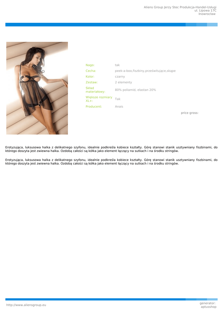Aliens Group Jerzy Stec Produkcja-Handel-Usługi ul. Lipowa 17C Inowrocław Nago: tak Cecha: peek-a-boo,fiszbiny,prześwitujące,skąpe Kolor: czarny Zestaw: 2 elementy Skład materiałowy: 80% poliamid, elastan 20% Większe rozmiary Tak XL+: Producent: Anais price gross: Erotyzująca, luksusowa halka z delikatnego szyfonu, idealnie podkreśla kobiece kształty. Górę stanowi stanik usztywniany fiszbinami, do którego doszyta jest zwiewna halka. Ozdobą całości są kółka jako element łączący na sutkach i na środku stringów. Erotyzująca, luksusowa halka z delikatnego szyfonu, idealnie podkreśla kobiece kształty. Górę stanowi stanik usztywniany fiszbinami, do którego doszyta jest zwiewna halka. Ozdobą całości są kółka jako element łączący na sutkach i na środku stringów. http://www.aliensgroup.eu generator: aptusshop