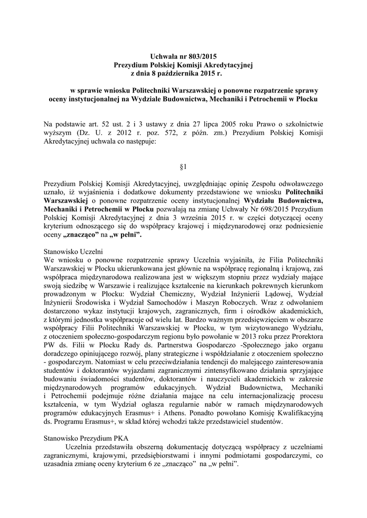 Uchwała nr 803/2015 Prezydium Polskiej Komisji Akredytacyjnej z dnia 8 października 2015 r. w sprawie wniosku Politechniki Warszawskiej o ponowne rozpatrzenie sprawy oceny instytucjonalnej na Wydziale Budownictwa, Mechaniki i Petrochemii w Płocku Na podstawie art. 52 ust. 2 i 3 ustawy z dnia 27 lipca 2005 roku Prawo o szkolnictwie wyższym (Dz. U. z 2012 r. poz. 572, z późn. zm.) Prezydium Polskiej Komisji Akredytacyjnej uchwala co następuje: §1 Prezydium Polskiej Komisji Akredytacyjnej, uwzględniając opinię Zespołu odwoławczego uznało, iż wyjaśnienia i dodatkowe dokumenty przedstawione we wniosku Politechniki Warszawskiej o ponowne rozpatrzenie oceny instytucjonalnej Wydziału Budownictwa, Mechaniki i Petrochemii w Płocku pozwalają na zmianę Uchwały Nr 698/2015 Prezydium Polskiej Komisji Akredytacyjnej z dnia 3 września 2015 r. w części dotyczącej oceny kryterium odnoszącego się do współpracy krajowej i międzynarodowej oraz podniesienie oceny „znacząco” na „w pełni”. Stanowisko Uczelni We wniosku o ponowne rozpatrzenie sprawy Uczelnia wyjaśniła, że Filia Politechniki Warszawskiej w Płocku ukierunkowana jest głównie na współpracę regionalną i krajową, zaś współpraca międzynarodowa realizowana jest w większym stopniu przez wydziały mające swoją siedzibę w Warszawie i realizujące kształcenie na kierunkach pokrewnych kierunkom prowadzonym w Płocku: Wydział Chemiczny, Wydział Inżynierii Lądowej, Wydział Inżynierii Środowiska i Wydział Samochodów i Maszyn Roboczych. Wraz z odwołaniem dostarczono wykaz instytucji krajowych, zagranicznych, firm i ośrodków akademickich, z którymi jednostka współpracuje od wielu lat. Bardzo ważnym przedsięwzięciem w obszarze współpracy Filii Politechniki Warszawskiej w Płocku, w tym wizytowanego Wydziału, z otoczeniem społeczno-gospodarczym regionu było powołanie w 2013 roku przez Prorektora PW ds. Filii w Płocku Rady ds. Partnerstwa Gospodarczo -Społecznego jako organu doradczego opiniującego rozwój, plany strategiczne i współdziałanie z otoczeniem społeczno - gospodarczym. Natomiast w celu przeciwdziałania tendencji do malejącego zainteresowania studentów i doktorantów wyjazdami zagranicznymi zintensyfikowano działania sprzyjające budowaniu świadomości studentów, doktorantów i nauczycieli akademickich w zakresie międzynarodowych programów edukacyjnych. Wydział Budownictwa, Mechaniki i Petrochemii podejmuje różne działania mające na celu internacjonalizację procesu kształcenia, w tym Wydział ogłasza regularnie nabór w ramach międzynarodowych programów edukacyjnych Erasmus+ i Athens. Ponadto powołano Komisję Kwalifikacyjną ds. Programu Erasmus+, w skład której wchodzi także przedstawiciel studentów. Stanowisko Prezydium PKA Uczelnia przedstawiła obszerną dokumentację dotyczącą współpracy z uczelniami zagranicznymi, krajowymi, przedsiębiorstwami i innymi podmiotami gospodarczymi, co uzasadnia zmianę oceny kryterium 6 ze „znacząco” na „w pełni”. §2 Uchwałę Prezydium Polskiej Komisji Akredytacyjnej otrzymują: 1. Minister Nauki i Szkolnictwa Wyższego, 2. Rektor Politechniki Warszawskiej. §3 Uchwała wchodzi w życie z dniem podjęcia. PRZEWODNICZĄCY POLSKIEJ KOMISJI AKREDYTACYJNEJ Marek Rocki