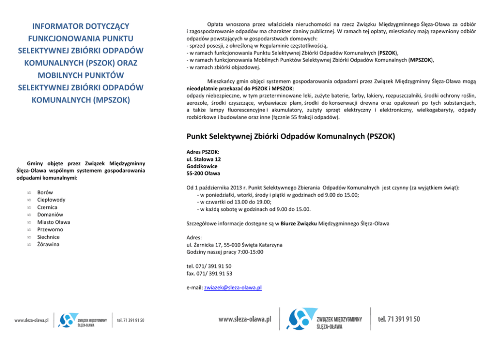 INFORMATOR DOTYCZĄCY FUNKCJONOWANIA PUNKTU SELEKTYWNEJ ZBIÓRKI ODPADÓW KOMUNALNYCH (PSZOK) ORAZ MOBILNYCH PUNKTÓW SELEKTYWNEJ ZBIÓRKI ODPADÓW KOMUNALNYCH (MPSZOK) Opłata wnoszona przez właściciela nieruchomości na rzecz Związku Międzygminnego Ślęza-Oława za odbiór i zagospodarowanie odpadów ma charakter daniny publicznej. W ramach tej opłaty, mieszkańcy mają zapewniony odbiór odpadów powstających w gospodarstwach domowych: - sprzed posesji, z określoną w Regulaminie częstotliwością, - w ramach funkcjonowania Punktu Selektywnej Zbiórki Odpadów Komunalnych (PSZOK), - w ramach funkcjonowania Mobilnych Punktów Selektywnej Zbiórki Odpadów Komunalnych (MPSZOK), - w ramach zbiórki objazdowej. Mieszkańcy gmin objęci systemem gospodarowania odpadami przez Związek Międzygminny Ślęza-Oława mogą nieodpłatnie przekazać do PSZOK i MPSZOK: odpady niebezpieczne, w tym przeterminowane leki, zużyte baterie, farby, lakiery, rozpuszczalniki, środki ochrony roślin, aerozole, środki czyszczące, wybawiacze plam, środki do konserwacji drewna oraz opakowań po tych substancjach, a także lampy fluorescencyjne i akumulatory, zużyty sprzęt elektryczny i elektroniczny, wielkogabaryty, odpady rozbiórkowe i budowlane oraz inne (łącznie 55 frakcji odpadów). Punkt Selektywnej Zbiórki Odpadów Komunalnych (PSZOK) Gminy objęte przez Związek Międzygminny Ślęza-Oława wspólnym systemem gospodarowania odpadami komunalnymi: • • • • • • • • Borów Ciepłowody Czernica Domaniów Miasto Oława Przeworno Siechnice Żórawina Adres PSZOK: ul. Stalowa 12 Godzikowice 55-200 Oława Od 1 października 2013 r. Punkt Selektywnego Zbierania Odpadów Komunalnych jest czynny (za wyjątkiem świąt): - w poniedziałki, wtorki, środy i piątki w godzinach od 9.00 do 15.00; - w czwartki od 13.00 do 19.00; - w każdą sobotę w godzinach od 9.00 do 15.00. Szczegółowe informacje dostępne są w Biurze Związku Międzygminnego Ślęza-Oława Adres: ul. Żernicka 17, 55-010 Święta Katarzyna Godziny naszej pracy 7:00-15:00 tel. 071/ 391 91 50 fax. 071/ 391 91 53 e-mail: [email protected] Lokalizacje i terminy stacjonowania Mobilnego Punktu Selektywnej Zbiórki Odpadów Komunalnych (MPSZOK) na terenie gmin: Borów, Ciepłowody, Czernica, Domaniów, Miasto Oława, Przeworno, Siechnice, Żórawina (czynny w określonym terminie w godzinach od 12.00 do 18.00) Terminy MPSZOK w 2014 r. Gmina Borów Ciepłowody Czernica Domaniów Miasto Oława Przeworno Lokalizacja Borów ul. Wrocławska (plac asfaltowy przy boisku sportowym) Na terenie Spółdzielni Handlowo Usługowo Produkcyjnej „Agrotech” w Ciepłowodach ul. Kolejowa 15 Na terenie zrekultywowanego składowiska w Ratowicach Polwica (za świetlicą wiejską) Na terenie parkingu pomiędzy ulicami Rybacką i Chrobrego obok boiska Szkoły Podstawowej nr 2 (wjazd od ul. Rybackiej i od ul. Młyńskiej) Przy ul. Okrężnej 18 na cz. działki nr 317/17 (obręb Przeworno) Siechnice ul. Wiosenna I II III IV V VI VII VIII IX X XI XII 16 18 18 15 20 16 17 19 16 16 18 16 21 20 20 17 22 18 22 21 18 21 20 18 7 6 6 3 8 5 8 7 4 7 5 4 3 4 4 1 6 3 3 5 2 2 3 2 14 13 13 10 15 12 15 14 11 14 13 11 23 25 25 22 27 24 24 26 23 23 25 23 28 Św. Katarzyna ul, Bukowa (parking) Siechnice 27 29 27 Żerniki Wrocławskie ul. Wrocławska 16 (byłe kółko rolnicze) Żórawina ul. Kolejowa (pomiędzy posesją nr 5 a 6a) 25 30 28 24 28 Radwanice ul. Gwiaździsta (koło świetlicy) Żórawina 29 26 9 11 11 8 13 10 27 10 12 9 9 7 9