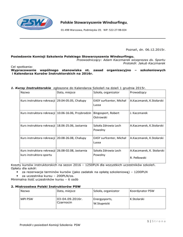 Polskie Stowarzyszenie Windsurfingu, 01-498 Warszawa, Podmiejska 19; NIP: 522-27-98-024 Poznań, dn. 06.12.2015r. Posiedzenie Komisji Szkolenia Polskiego Stowarzyszenia Windsurfingu. Przewodniczący: Adam Kaczmarek wiceprezes ds. Sportu Protokół: Jakub Kaczmarek Cel spotkania: Wypracowanie wspólnego stanowiska nt. zasad organizacyjno – szkoleniowych i Kalendarza Kursów Instruktorskich na 2016r. 1. Kursy Instruktorskie zgłoszone do Kalendarza Szkoleń na dzień 1 grudnia 2015r. Nazwa Data, miejsce Kurs instruktora rekreacji 29.04-05.05, Chałupy Szkoła, organizator Prowadzący EASY surfcenter, Michał Lussa A.Kaczmarek, K.Stolarski Kurs instruktora rekreacji 10.06-16.06, Przybrodzin Bingosport, Robert Ostrowski J. Kaczmarek Kurs instruktora rekreacji 18.06-25.06, Jastarnia Szkoła Zdrowia Lech Powolny A.Kaczmarek, K.Stolarski Kurs instruktora rekreacji 20.08-26.08, Chałupy EASY surfcenter, Michał Lussa A.Kaczmarek, K.Stolarski Kurs instruktora rekreacji 26.08-02.08, Jastarnia kurs instruktora sportu Szkoła Zdrowia Lech Powolny A.Kaczmarek, K. Stolarski R. Pellowski Koszty kursów instruktorskich na sezon 2016 – 1250PLN dla wszystkich uczestników szkoleń. Opłaty dla szkół: • za rezerwacje terminów kursów (jako zadatek na opłatę szkoleniową) – 1200PLN • za uczestnika kursu – 200PLN/os. Minimalna ilość uczestników kursu – 6 osób 2. Mistrzostwa Polski Instruktorów PSW Nazwa Data, miejsce Szkoła, organizator Koordynator PSW MPI PSW 03-04.09.2016r. Czarnocin Energysports, W.Stupnicki K.Stolarski 1|Strona Protokół z posiedzeń Komisji Szkolenia PSW 3. Skład Komisji Szkolenia na sezon 2016 Komisja Szkolenia PSW Wiceprezes PSW A. Kaczmarek Komisja ds. Szkolenia Przewodniczący K. Stolarski Podkomisja ds. Szkolenia sportowego Wiceprzewodniczący R.Pellowski, J.Kaczmarek Podkomisja ds. Szkół Wiceprzewodniczący A. Łożyński, K.Leonowicz Podkomisja ds. MPI Wiceprzewodniczący A. Bakes. K.Stolarski Podkomisja FS/WAVE Wiceprzewodniczący M. Kapuściński, M.Bocian Uczestnicy spotkania: Adam Kaczmarek Lech Powolny Jakub Kaczmarek Kuba Stolarski Adam Łożyński Robert Pellowski 2|Strona Protokół z posiedzeń Komisji Szkolenia PSW