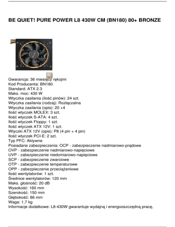 BE QUIET! PURE POWER L8 430W CM (BN180) 80+ BRONZE Gwarancja: 36 miesięcy rękojmi Kod Producenta: BN180 Standard: ATX 2.3 Maks. moc: 430 W Wtyczka zasilania (ilość pinów): 24 szt. Wtyczka zasilania (rodzaj): Rozłączalna Wtyczka zasilania (opis): 20 +4 Ilość wtyczek MOLEX: 3 szt. Ilość wtyczek S-ATA: 4 szt. Ilość wtyczek Floppy: 1 szt. Ilość wtyczek ATX 12V: 1 szt. Wtyczki ATX 12V (opis): P8 (4 pin + 4 pin) Ilość wtyczek PCI-E: 2 szt. Typ PFC: Aktywne Posiadane zabezpieczenia: OCP - zabezpieczenie nadmiarowo-prądowe OVP - zabezpieczenie nadmiarowo-napięciowe UVP - zabezpieczenie niedomiarowo-napięciowe SCP - zabezpieczenie zwarciowe OTP - zabezpieczenie temperaturowe OPP - zabezpieczenie przeciążeniowe Ilość wentylatorów: 1 szt. Średnice wentylatorów: 120 mm Maks. głośność: 20 dB Wysokość: 160 mm Szerokość: 150 mm Głębokość: 86 mm Waga: 1,7 kg Informacje dodatkowe: L8-430W gwarantuje wydajną i energooszczędną pracę, osiągając certyfikat 80PLUS Bronze oraz sprawność do 88%. Dzięki dwóm złączom PCI Express (1x 6+2 pin oraz 1x 6 pin), model L8-430W jest odpowiedni do pracy w trybie multi GPU. Fonctionnement silencieux grâce aux ventilateurs be quiet! ultra silencieux Wentylator 120mm z łopatkami o zoptymalizowanym kształcie dla lepszego przepływu powietrza oraz wyjątkowo cichej pracy. Szczególnie cichy dzięki optymalizacji prędkości obrotowej w całym zakresie pracy.Cicha praca i długa żywotność do 100.000 godzin dzięki zastosowaniu wysokiej jakości łożyska oraz indywidualnie wyważanego rotora. Wysoka wydajność i stabilność dla CPU oraz GPU Dwie oddzielne linie 12V. Odpowiedni do konfiguracji multi-GPU typu SLI- oraz Crossfire. Obsługuje procesory Intel® AMD najnowszej generacji. Wydajna i energooszczędna praca Certyfikat 80PLUS Bronze oraz wysoka sprawność do 88%. ErP ready. Zużycie energii w trybie czuwania 0,3W. Wysoka kompatybilność z przyszłymi komponentami jak również ze starszymi produktami Złącze 12V P8 (P4+4). 2x PCI-Express. Łatwa instalacja. System modularnego okablowania System modularnego okablowania umożliwia różnorodne możliwości podłączeń. Kable w oplotach. Najważniejsze złącza, takie jak: S-ATA, HDD oraz FDD w jednym kablu All-in-one. Najwyższe bezpieczeństwo i niezawodność Maksymalna ochrona komponentów (OCP, OVP, UVP, OPP, OTP oraz SCP). Certyfikowane w oparciu o międzynarodowe normy bezpieczeństwa. Serwis 3-letnia gwarancja producenta www: Link na stronę opisu technicznego Numer części EAN: 4260052182451 P/N: 4260052182451 P/N:: 4260052182451 Numer części EAN:: 4260052182451 Cena: 290.54 PLN Powered by TCPDF (www.tcpdf.org)