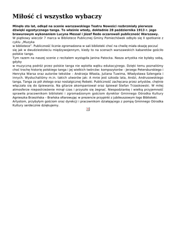 Miłość ci wszystko wybaczy Minęło sto lat, odkąd na scenie warszawskiego Teatru Nowości rozbrzmiały pierwsze dźwięki egzotycznego tanga. To właśnie wtedy, dokładnie 28 października 1913 r. jego brawurowym wykonaniem Lucyna Messal i Józef Redo oczarowali publiczność Warszawy. W piątkowy wieczór 7 marca w Bibliotece Publicznej Gminy Pomiechówek odbyło się II spotkanie z cyklu „Muzyka w bibliotece”. Publiczność licznie zgromadzona w sali biblioteki choć na chwilę miała okazję poczuć się jak w dwudziestoleciu międzywojennym, kiedy to na scenach warszawskich kabaretów gościło polskie tango. Tym razem na naszej scenie z recitalem wystąpiła Janina Patocka. Nasza artystka nie byłaby sobą, gdyby w muzyczną podróż przez polskie tanga nie wplotła wątku edukacyjnego. Dzięki temu poznaliśmy choć trochę historię polskiego tanga i jej wielkich twórców: kompozytorów - Jerzego Petersburskiego i Henryka Warsa oraz autorów tekstów – Andrzeja Własta, Juliana Tuwima, Władysława Szlengela i innych. Wysłuchaliśmy m.in. takich utworów jak: A mnie jest szkoda lata, Andzi, Andrusowskiego tanga, Tanga za pół złotego oraz nostalgicznej Rebeki. Publiczność zachęcana przez artystów, chętnie włączała się do śpiewania. Na gitarze akompaniował oraz śpiewał Stefan Trzaskowski. W miłej atmosferze niepostrzeżenie minął czas i przyszło się żegnać. Niespodziankę i wielką przyjemność sprawiła pracownikom biblioteki i zgromadzonym gościom dyrektor Gminnego Ośrodka Kultury Agnieszka Brzezińska – Brańska ofiarowując w prezencie przypinki z jubileuszowym logo Biblioteki. Artystom, przybyłym gościom oraz dyrekcji i pracownikom działającego z pompą Gminnego Ośrodka Kultury serdecznie dziękujemy.