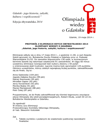 Gdańsk– jego historia, zabytki, kultura i współczesność” Edycja obywatelska 2014 Gdańsk, 19 maja 2014 r. PROTOKÓŁ Z ELIMINACJI EDYCJI OBYWATELSKIEJ 2014 OLIMPIADY WIEDZY O GDAŃSKU „Gdańsk, jego historia, zabytki, kultura i współczesność” Eliminacje odbyły się w dniu 17 maja 2014 r., o godzinie 11.00, w auli Zespołu Szkół Łączności im. Bohaterów Poczty Polskiej w Gdańsku przy ul. Podwale Staromiejskie 51/52. Do zawodów dopuszczono 130 osób, w wyznaczonym terminie stawiło się natomiast ostatecznie 91 zawodników. W ciągu 60 minut uczestnicy eliminacji rozwiązywali test wyboru złożony z 50 pytań o zróżnicowanej skali trudności. Łącznie można było zgromadzić 125 punktów. Ośmioro uczestników, którzy zdobyli największą liczbę punktów, zakwalifikowało się do finału. Są to: Anna Sadowska (104 pkt) Jagoda Załęska-Kaczko (99 pkt) Maciej Sosnowski (95 pkt) Mirosław Gąsior (92 pkt) Jerzy Korzeniecki (92 pkt) Monika Bojka (91 pkt) Maciej Maciejewski (88 pkt) Piotr Celej (87 pkt) Przypominamy, że do finału zakwalifikował się również tegoroczny zwycięzca edycji Olimpiady dla szkół ponadgimnazjalnych, Robert Okuła, uczeń III LO im. Bohaterów Westerplatte w Gdańsku. Za zgodność W imieniu Jury Eliminacji Przewodniczący Komitetu Głównego Olimpiady, dr hab. Sławomir Kościelak Zał. 1. Tabela wyników z podanymi do wiadomości publicznej nazwiskami finalistów ELIMINACJE OLIMPIADY WIEDZY O GDAŃSKU EDYCJA OBYWATELSKA 2014 TABELA WYNIKÓW TESTU PISEMNEGO Z 17.05.2014 Miejsce Numer Imię zawodnika 1. 2. 14 41 3 4. 5. 6. 7. 8. 9. 10. 11. 12-13. 12-13. 14. 15-16. 15-16. 17. 18. 19-20. 19-20. 21. 22-24. 22-24. 22-24. 25-28. 25-28. 25-28. 25-28. 29. 30-32. 30-32 30-32. 33-34. 33-34. 35. 36-37. 36-37. 38. 39-43. 39-43. 39-43. 39-43. 69 90 47 94 66 103 45 28 101 10 80 116 50 121 37 65 59 122 109 26 104 4 92 91 21 55 11 98 115 13 83 76 89 57 107 78 62 99 60 113 Nazwisko Liczba zdobytych pytania testowe Za 1 Za 2 Za 3 pkt pkt pkt Anna Sadowska 10 20 42 Jagoda Załęska10 26 27 Kaczko Maciej Sosnowski 10 26 39 Mirosław Gąsior 10 28 30 Jerzy Korzeniecki 10 26 36 Monika Bojka 9 26 24 Maciej Maciejewski 9 22 33 Piotr Celej 9 24 30 10 28 36 10 22 33 9 22 33 8 28 27 10 26 27 9 24 21 10 18 24 8 28 24 7 16 24 9 28 21 9 24 24 7 18 24 9 22 21 10 22 27 10 24 21 8 16 27 8 22 27 7 24 18 8 24 21 6 24 27 9 22 21 10 28 21 10 20 21 8 22 21 7 18 21 9 20 21 7 20 18 10 20 18 8 20 24 9 22 24 8 18 24 6 20 24 9 20 21 9 18 27 punktów za Za 4 pkt 32 36 RAZEM 20 24 20 32 24 24 12 20 20 20 20 28 28 20 32 20 20 28 24 16 20 24 16 24 20 16 20 12 20 20 24 20 24 20 16 12 16 16 16 12 95 92 92 91 88 87 86 85 84 83 83 82 80 80 79 78 77 77 76 75 75 75 73 73 73 73 72 71 71 71 70 70 69 68 68 67 66 66 66 66 104 99 39-43. 44-47. 44-47. 44-47. 44-47. 48-50. 48-50. 48-50. 51-53. 51-53. 51-53. 54-55. 54-55. 56-59. 56-59. 56-59. 56-59. 60-63. 60-63. 60-63. 60-63. 64. 65-69. 65-69. 65-69. 65-69. 65-69. 70. 71. 72. 73. 74. 75-76. 75-76. 77. 78. 79-82. 79-82. 79-82. 79-82. 83-84. 83-84. 85. 86-88. 86-88. 86-88. 89. 90. 91. 19 46 54 125 32 128 85 5 68 108 9 24 1 130 105 79 18 43 40 56 129 42 36 17 64 77 61 124 67 3 63 39 20 2 71 35 111 7 96 31 81 112 6 117 38 97 12 48 86 9 10 8 10 7 9 8 9 8 9 9 8 8 6 10 6 8 5 8 8 9 9 9 7 8 8 7 9 9 9 9 7 6 7 5 8 3 7 5 6 7 5 9 9 6 8 3 8 5 26 22 20 28 18 28 18 22 18 24 16 20 16 18 20 16 16 18 22 20 20 16 18 18 20 20 22 18 18 20 18 16 16 10 18 14 16 18 14 14 14 14 20 14 12 16 8 12 10 15 21 21 18 24 15 18 21 21 18 18 18 18 21 15 27 21 24 21 15 18 21 12 18 15 15 18 15 18 15 12 15 15 12 12 12 18 12 18 9 6 12 9 18 15 9 12 12 12 16 12 16 9 16 12 20 12 16 12 20 16 20 16 16 12 16 12 8 16 12 12 16 12 12 12 8 12 8 8 12 12 12 20 12 12 8 8 8 16 16 12 4 0 8 8 16 4 8 66 65 65 65 65 64 64 64 63 63 63 62 62 61 61 61 61 59 59 59 59 58 55 55 55 55 55 54 53 52 51 50 49 49 47 46 45 45 45 45 43 43 42 41 41 41 39 36 35