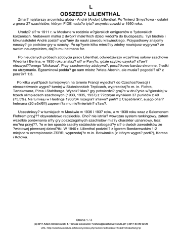 L ODSZED? LILIENTHAL Zmar? najstarszy arcymistrz globu - André (Andor) Lilienthal. Po ?mierci Smys?owa - ostatni z grona 27 szachistów, którym FIDE nada?o tytu? arcymistrzowski w 1950 roku. Urodzi? si? w 1911 r. w Moskwie w rodzinie w?gierskich emigrantów o ?ydowskich korzeniach. Niebawem matka z dwójk? male?kich dzieci wróci?a do Budapesztu. ?yli biednie i kilkunastoletni André zosta? wys?any do nauki zawodu krawieckiego. Przypadkowy znajomy nauczy? go podstaw gry w szachy. Po up?ywie kilku miesi?cy zdolny nowicjusz wygrywa? ze swoim nauczycielem, daj?c mu hetmana for. Po nieudanych próbach zdobycia pracy Lilienthal, odwiedziwszy wcze?niej salony szachowe Wiednia i Berlina, w 1930 roku znalaz? si? w Pary?u, gdzie szybko uzyska? s?aw? niezwyci??onego "blickarza". Przy szachownicy zdobywa?, pocz?tkowo bardzo skromne, ?rodki na utrzymanie. Egzaminowi podda? go sam mistrz ?wiata Alechin, ale musia? pogodzi? si? z pora?k? 1:3. Po kilku wyst?pach turniejowych na terenie Francji wyjecha? do Czechos?owacji i nieoczekiwanie wygra? turniej w Stubnianskich Teplicach, wyprzedzaj?c m. in. Flohra, Tartakowera, Pirca i Stahlberga. Wysok? klas? gry potwierdzi? graj?c w dru?ynie w?gierskiej w trzech olimpiadach szachowych (1933, 1935, 1937) z ??cznym wynikiem 37 punktów z 49 (75,5%). Na turnieju w Hastings 1933/34 rozegra? s?awn? parti? z Capablank?, a jego ofiar? hetmana (20.e5xf6!!) zapewni?a mu nie?mierteln? s?aw?. Uczestniczy? w turniejach w Moskwie w 1936 i 1937 roku, a w 1939 roku wraz z Salomonem Flohrem przyj?? obywatelstwo radzieckie. Cho? nie istnia? wówczas system rankingowy, zatem wszelkie porównania si?y gry poszczególnych szachistów mia?y charakter uznaniowy, lecz mo?na przyj??, ?e w ten sposób szachy radzieckie wzbogaci?y si? o dwóch zawodników ze ?wiatowej pierwszej dziesi?tki. W 1940 r. Lilienthal podzieli? z Igorem Bondarewskim 1-2 miejsce w czempionacie ZSRR, wyprzedaj?c m.in. Botwinnika (z którym wygra? parti?), Keresa i Kotowa. Strona 1 / 3 (c) 2017 Adam Umiastowski & Tomasz Lissowski <[email protected]> | 2017-03-09 02:28 URL: http://szachowavistula.pl/felietony/index.php?action=artikel&cat=13&id=543&artlang=pl L "Gra Lilienthla odznacza si? subtelna intuicj?, oryginalnymi pomys?ami strategicznymi i nieoczekiwanymi kombinacjami" - napisano o W?grze przy innej okazji. Zmiana obywatelstwa nie tylko zapewni?a Lilienthalowi bezpiecze?stwo osobiste w obliczu "brunatnej zarazy" pustosz?cej Europ?, ale ponadto przemieni?a niepewnego jutra przedstawiciela bohemy szachowej w szacownego pracownika frontu kulturalnego, posiadaj?cego w Moskwie wygodny apartament, sta?? pensj? i przepustk? do konsumu zaopatruj?cego w atrakcyjne towary wy?sze sfery moskiewskie. Nie musia? sk?ada? ?adnych deklaracji ani wiernopodda?czych ho?dów. Zadaniem Lilienthala by?o dobrze gra? w szachy, swoj? wiedz? i do?wiadczeniem dzieli? si? z m?od? kadr? radzieckich mistrzów oraz krzewi? kult szachów w?ród milionowych rzesz kibiców, robotników i ch?opów-ko?cho?ników. André nigdy nie pozby? si? cudzoziemskiego akcentu, ale jego bezpo?redni stosunek do szeregowych szachistów, ?ywa inteligencja i dowcip zyska?y mu w ZSRR ogromn? popularno??. Zaproszenia do wyg?oszenia wyk?adu i rozegrania symultany (a by?o to dobrze p?atne zaj?cie...) p?yn??y z ca?ego kraju nieprzerwanym strumieniem. Po zako?czeniu wojny Lilienthal jeszcze przez 10 lat aktywnie uczestniczy? w wydarzeniach sportowych du?ej rangi. W 1950 roku w turnieju pretendentów zaj?? VIII miejsce, natomiast dalsze starty nie przynios?y mu wi?kszych sukcesów; w ZSRR do g?osu dosz?a nowa generacja m?odych graczy - wychowanków domów pionierów: Smys?ow, Bronsztejn, Geller, Petrosjan. W?gierski arcymistrz przerzuci? si? wi?c na prac? trenersk? - sekundowa? najpierw Smys?owowi, a nast?pnie przez wiele lat nale?a? do teamu trenerów Petrosjana. Prowadzi? o?ywion? dzia?alno?? dziennikarsk?, relacjonowa? przebieg meczów o mistrzostwo ?wiata i czempionatów ZSRR. Wraz z Salomonem Flohrem tworzyli w Moskwie nierozerwalny duet przyjació?. W 1969 roku wyda? zbiór swoich wybranych partii zatytu?owany "?ycie - szachom" (cena 58 kopiejek, nak?ad 55 tysi?cy egzemplarzy!!), który pó?niej mia? kolejne wydania, w tym zagraniczne. W 1976 r. Lilienthal powróci? na W?gry i do ko?ca ?ycia mieszka? w Budapeszcie. W jego Strona 2 / 3 (c) 2017 Adam Umiastowski & Tomasz Lissowski <[email protected]> | 2017-03-09 02:28 URL: http://szachowavistula.pl/felietony/index.php?action=artikel&cat=13&id=543&artlang=pl L domu, ju? po rozegraniu drugiego meczu ze Spasskim (1992), wielokrotnie go?ci? Robert Fischer. Jeszcze kilka lat temu Lilienthal, potrafi?cy doceni? walory dobrego trunku i markowego papierosa podczas przyjacielskiej biesiady, bywa? go?ciem rozmaitych imprez szachowych. P?k?o ostatnie ogniwo ??cz?ce nas ze "z?ot? epok?" szachów Laskera, Capablanki i Alechina. Tomasz Lissowski Unikalny ID rozwi?zania: #1542 Autor: : polbase Data ostatniej aktualizacji: 2012-12-14 09:28 Strona 3 / 3 (c) 2017 Adam Umiastowski & Tomasz Lissowski <[email protected]> | 2017-03-09 02:28 URL: http://szachowavistula.pl/felietony/index.php?action=artikel&cat=13&id=543&artlang=pl Powered by TCPDF (www.tcpdf.org)
