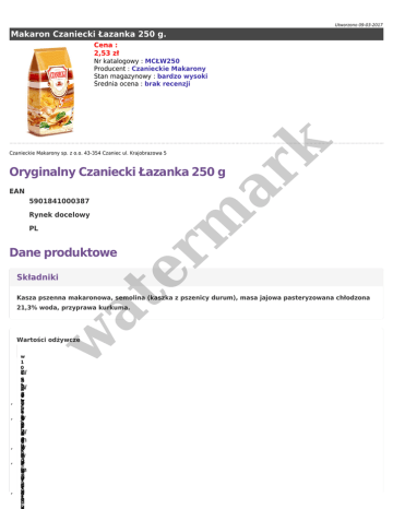 Utworzono 09-03-2017 Makaron Czaniecki Łazanka 250 g. Cena : 2,53 zł er m ar k Nr katalogowy : MCŁW250 Producent : Czanieckie Makarony Stan magazynowy : bardzo wysoki Średnia ocena : brak recenzji Czanieckie Makarony sp. z o.o. 43-354 Czaniec ul. Krajobrazowa 5 Oryginalny Czaniecki Łazanka 250 g EAN 5901841000387 Rynek docelowy PL Dane produktowe at Składniki Kasza pszenna makaronowa, semolina (kaszka z pszenicy durum), masa jajowa pasteryzowana chłodzona w 21,3% woda, przyprawa kurkuma. Wartości odżywcze , , , , , w 1 0 W 1 0 g a 5 s W 3 r 6 u c a 7 t 9 h T 3 ro 1 e łtk 7 ś g o w 1 u g o k Jć p tscś/e 0 r W 7 y za ćn o d ę 0 m g cl e u w 0 g k zn rk tg 3 lw t e g u B 2 y o a re łg 6 m w sg t B 1 o cy e ig 3 n u d tc S 0 a n k ły z ó 1 łirn g u cn l g w 1 0 Z 0 g a s w u c a h re t g M o o a p śrr O o ćrk d sy a u o g k til u at w z w a y n ił ą e c z k in i e z o b e c n o ś c i n a t u r a l n i e w y s t ę p u j ą c e g o er m ar k O p i s p r o id n w a u ly k n iy t k C u a