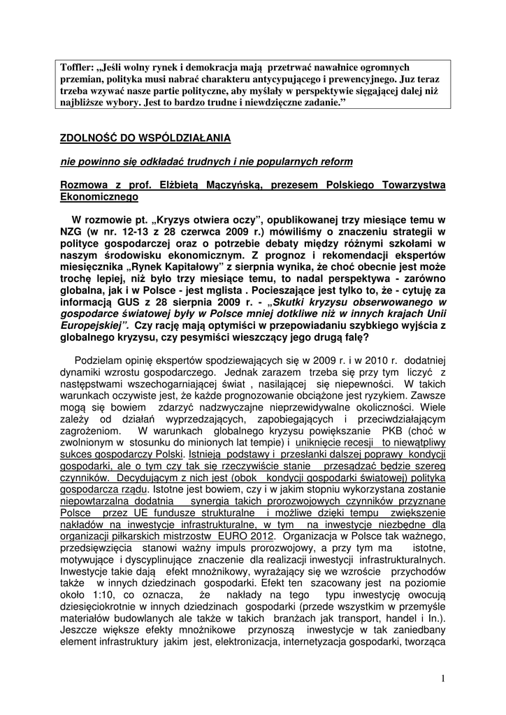 Toffler: „Jeśli wolny rynek i demokracja mają przetrwać nawałnice ogromnych przemian, polityka musi nabrać charakteru antycypującego i prewencyjnego. Juz teraz trzeba wzywać nasze partie polityczne, aby myślały w perspektywie sięgającej dalej niż najbliższe wybory. Jest to bardzo trudne i niewdzięczne zadanie.” ZDOLNOŚĆ DO WSPÓLDZIAŁANIA nie powinno się odkładać trudnych i nie popularnych reform Rozmowa z prof. Elżbietą Mączyńską, prezesem Polskiego Towarzystwa Ekonomicznego W rozmowie pt. „Kryzys otwiera oczy”, opublikowanej trzy miesiące temu w NZG (w nr. 12-13 z 28 czerwca 2009 r.) mówiliśmy o znaczeniu strategii w polityce gospodarczej oraz o potrzebie debaty między różnymi szkołami w naszym środowisku ekonomicznym. Z prognoz i rekomendacji ekspertów miesięcznika „Rynek Kapitałowy” z sierpnia wynika, że choć obecnie jest może trochę lepiej, niż było trzy miesiące temu, to nadal perspektywa - zarówno globalna, jak i w Polsce - jest mglista . Pocieszające jest tylko to, że - cytuję za informacją GUS z 28 sierpnia 2009 r. - „Skutki kryzysu obserwowanego w gospodarce światowej były w Polsce mniej dotkliwe niż w innych krajach Unii Europejskiej”. Czy rację mają optymiści w przepowiadaniu szybkiego wyjścia z globalnego kryzysu, czy pesymiści wieszczący jego drugą falę? Podzielam opinię ekspertów spodziewających się w 2009 r. i w 2010 r. dodatniej dynamiki wzrostu gospodarczego. Jednak zarazem trzeba się przy tym liczyć z następstwami wszechogarniającej świat , nasilającej się niepewności. W takich warunkach oczywiste jest, że każde prognozowanie obciążone jest ryzykiem. Zawsze mogą się bowiem zdarzyć nadzwyczajne nieprzewidywalne okoliczności. Wiele zależy od działań wyprzedzających, zapobiegających i przeciwdziałającym zagrożeniom. W warunkach globalnego kryzysu powiększanie PKB (choć w zwolnionym w stosunku do minionych lat tempie) i uniknięcie recesji to niewątpliwy sukces gospodarczy Polski. Istnieją podstawy i przesłanki dalszej poprawy kondycji gospodarki, ale o tym czy tak się rzeczywiście stanie przesądzać będzie szereg czynników. Decydującym z nich jest (obok kondycji gospodarki światowej) polityka gospodarcza rządu. Istotne jest bowiem, czy i w jakim stopniu wykorzystana zostanie niepowtarzalna dodatnia synergia takich prorozwojowych czynników przyznane Polsce przez UE fundusze strukturalne i możliwe dzięki tempu zwiększenie nakładów na inwestycje infrastrukturalne, w tym na inwestycje niezbędne dla organizacji piłkarskich mistrzostw EURO 2012. Organizacja w Polsce tak ważnego, przedsięwzięcia stanowi ważny impuls prorozwojowy, a przy tym ma istotne, motywujące i dyscyplinujące znaczenie dla realizacji inwestycji infrastrukturalnych. Inwestycje takie dają efekt mnożnikowy, wyrażający się we wzroście przychodów także w innych dziedzinach gospodarki. Efekt ten szacowany jest na poziomie około 1:10, co oznacza, że nakłady na tego typu inwestycję owocują dziesięciokrotnie w innych dziedzinach gospodarki (przede wszystkim w przemyśle materiałów budowlanych ale także w takich branżach jak transport, handel i In.). Jeszcze większe efekty mnożnikowe przynoszą inwestycje w tak zaniedbany element infrastruktury jakim jest, elektronizacja, internetyzacja gospodarki, tworząca 1 tzw. „elektroniczną magistralę informacyjną” Jak podkreśla guru prognozowania Alvin Toffler, będzie to podstawowa infrastruktura gospodarki postindustrialnej. Inwestycje infrastrukturalne mogą zatem stać się istotnym źródłem dodatkowych wpływów budżetowych. GUS: „PKB nie wyrównany sezonowo (w cenach stałych średniorocznych roku poprzedniego) wzrósł realnie o 1,1% w porównaniu z analogicznym okresem roku poprzedniego ( w I kwartale wzrost o 0,8%). Głównymi czynnikami wzrostu PKB były popyt zagraniczny (eksport netto), którego wpływ na tempo wzrostu gospodarczego wyniósł 3,1 pkt. proc. oraz spożycie ogółem – wpływ 1,3 pkt. proc. Natomiast negatywny wpływ na wzrost PKB miała akumulacja (-3,3 pkt. proc.), w tym po raz pierwszy od 2003 r. popyt inwestycyjny (-0,6 pkt. proc.). - z informacji Departamentu Rachunków narodowych GUS, 28 sierpień 2009 r., str 1, www.stat.gov.pl. Jednym z głównych zagrożeń dla średniookresowego tempa wzrostu gospodarczego jest obecnie w Polsce ograniczona akcja kredytowa dla sektora przedsiębiorstw. Czego można oczekiwać w związku z tym od polityki gospodarczej rządu, NBP, KNF? Mieliśmy problem opcji walutowych. Jak poradzić z trudnym problemem regulacji krajowych i międzynarodowych, sprzyjających dopływowi kapitału od banków „matek” do banków „córek”? Aktywizacja akcji kredytowej jest sprawą z jednej strony popytu, zapotrzebowania na kredyty, a z drugiej – ich podaży. Na ograniczony popyt na kredyt ze strony przedsiębiorstw wpływa nie tylko niepewna perspektywa przyszłego popytu zagranicznego, ale także niski popyt krajowy: inwestycyjny i konsumpcyjny. Problemy po stronie podaży kredytu dla przedsiębiorstw wynikają z wielu przyczyn. Jedną z nich jest ograniczone przez kryzys finansowanie rezydujących w Polsce banków „córek” przez ich banki „matki”, rezydujące w USA, Niemczech, W. Brytanii, Włoszech i innych krajach. Prof. Władysław Jaworski przestrzegał przed takim niebezpieczeństwem już w latach dziewięćdziesiątych, co zostało m.in. odnotowane w raportach byłej RSSG. Przeciwdziałanie temu wymaga obecnie skoordynowanego współdziałania na co dzień w rządzie i między rządem, a NBP i KNF. Na podaż kredytu przez banki w Polsce może wpływać także rozszerzenie gwarancji i poręczeń kredytowych. Dobrze, że podejmowane są pewne decyzje zmierzające w tym kierunku i kwestie te są przedmiotem działania ze strony rządu, ale w opinii polskiego środowiska gospodarczego akcja ta zachodziła i zachodzi zbyt powoli. Bank Gospodarstwa K