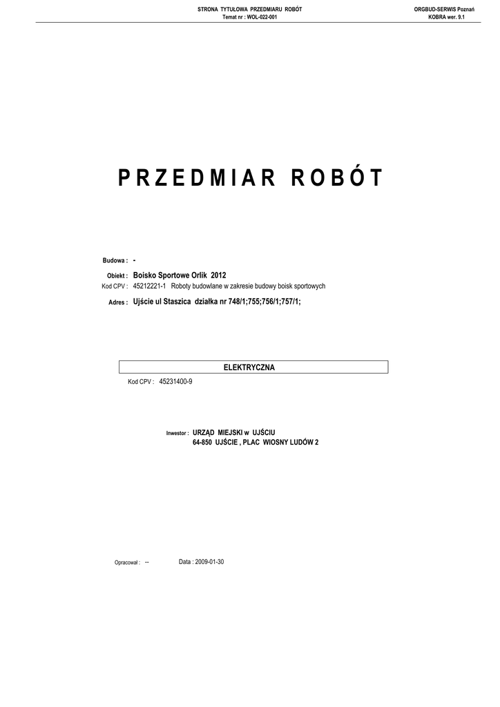 STRONA TYTUŁOWA PRZEDMIARU ROBÓT Temat nr : WOL-022-001 PRZEDMIAR ROBÓT Budowa : Obiekt : Boisko Sportowe Orlik 2012 Kod CPV : 45212221-1 Roboty budowlane w zakresie budowy boisk sportowych Adres : Ujście ul Staszica działka nr 748/1;755;756/1;757/1; ELEKTRYCZNA Kod CPV : 45231400-9 Inwestor : Opracował : -- URZĄD MIEJSKI w UJŚCIU 64-850 UJŚCIE , PLAC WIOSNY LUDÓW 2 Data : 2009-01-30 ORGBUD-SERWIS Poznań KOBRA wer. 9.1 SPIS DZIAŁÓW PRZEDMIARU Temat nr : WOL-022-001 ORGBUD-SERWIS Poznań KOBRA wer. 9.1 ELEKTRYCZNA Budowa : Obiekt : Boisko Sportowe Orlik 2012 Adres : Ujście ul Staszica działka nr 748/1;755;756/1;757/1; SPIS DZIAŁÓW PRZEDMIARU Lp. Kod CPV 1 Opis stanu / elementu ELEMENT : Oświetlenie terenu przyłącze kablowe - - - Koniec wydruku spisu działów przedmiaru - - - Str: 1 PRZEDMIAR ROBÓT Temat nr : WOL-022-001 ORGBUD-SERWIS Poznań KOBRA wer. 9.1 ELEKTRYCZNA Budowa : Obiekt : Boisko Sportowe Orlik 2012 Adres : Ujście ul Staszica działka nr 748/1;755;756/1;757/1; Lp. Podstawa kalkulacji Str: 1 / Opis pozycji Ilość Jedn. miary 1. ELEMENT : Oświetlenie terenu przyłącze kablowe Klauzula o uzgodnieniu kosztorysu : Kosztorys został sporządzony zgodnie z rozporządzeniem Ministra Infrastruktury z dnia 24.05.2004 r. w sprawie metod i podstaw sporzadzenia kosztorysu inwestorskiego ( Dz.U. Nr 18 poz .172 ) Rozporzadzenie Ministra infrastruktury z dnia 18.05.2004 r. w sprawie określenia metod i podstaw sporządzania kosztorysu inwestorskiego ,obliczenia planowanych kosztów prac projektowych oraz planowanych kosztów robót budowlanych określonych w programie funkcjonalno- uŜytkowym ( Dz.U. Nr 130 poz .1389 ) Rozporzadzenie Ministra Infrastruktury z dnia 02.09.2004 r. w sprawie szczegołowego zakresu i formy dokumentacji projektowej ,specyfikacji technicznych wykonania i odbioru robót budowlanych oraz programu funkcjonalno uŜytkowego . ( Dz.U. Nr 202 poz . 2072 ) Podstawę do sporzadzenia kosztorysu stanowią : zlecenie inwestora załoŜenia wyjściowe do kosztorysowania przedmiar robót wykonany na podstawie obmiarów z projektu , natury katalogi nakładów rzeczowych i kalkulacje wymienione w opisie wyceny zastosowano ceny średnie krajowe Orgbud serwis P-ń na dzień sporządzania kosztorysu , uzupełnienie o wartość z rynku lokalnego. 1. KNNR 5 0701-02 294,200 m3 [ Kancelaria Prezesa Rady Ministrów 2001 ] Kopanie rowów dla kabli w sposób ręczny w gruncie kat. III 294.2 = Razem przedmiar = 2. KNNR 5 0706-01 294,200 294,200 m3 1 850,000 m [ Kancelaria Prezesa Rady Ministrów 2001 ] Nasypanie warstwy piasku na dnie rowu kablowego o szerokości do 0.4 m ( 925 m x 2 ) 1850 = Razem przedmiar = 3. KNNR 5 0705-01 1 850,000 1 850,000 m 1,000 m [ Kancelaria Prezesa Rady Ministrów 2001 ] UłoŜenie rur osłonowych z PCW 1= Razem przedmiar = 4. KNNR 5 0707-02 1,000 1,000 m 754,000 m [ Kancelaria Prezesa Rady Ministrów 2001 ] Układanie kabli o masie do 1.0 kg/m w rowach kablowych ręcznie 754 = Razem przedmiar = 5. KNNR 5 0707-03 754,000 754,000 m 245,000 m [ Kancelaria Prezesa Rady Ministrów 2001 ] Układanie kabli o masie do 2.0 kg/m w rowach kablowych ręcznie 245 = Razem przedmiar = 6. KNNR 5 0702-02 245,000 245,000 m 294,200 m3 [ Kancelaria Prezesa Rady Ministrów 2001 ] Zasypywanie rowów dla kabli wykonanych ręcznie w gruncie kat. III 294.2 = Razem przedmiar = 7. KNNR 5 1001-01 294,200 294,200 m3 10,000 szt. [ Kancelaria Prezesa Rady Ministrów 2001 ] MontaŜ i stawianie słupów oświetleniowych o masie do 100 kg 10 = Razem przedmiar = 10,000 10,000 szt. PRZEDMIAR ROBÓT Temat nr : WOL-022-001 ORGBUD-SERWIS Poznań KOBRA wer. 9.1 ELEKTRYCZNA ELEMENT : 1. Oświetlenie terenu przyłącze kablowe Str: 2 Lp. Podstawa kalkulacji / Opis pozycji Ilość 8. KNNR 5 1003-01 Jedn. miary 11,000 kpl.prze [ Kancelaria Prezesa Rady Ministrów 2001 ] MontaŜ przewodów do opraw oświetleniowych - wciąganie w słupy i rury osłonowe przy wysokości latarń do 12 m bez wysięgnika 11 = Razem przedmiar = 9. KNNR 5 1004-01 11,000 11,000 kpl.prze 24,000 szt. [ Kancelaria Prezesa Rady Ministrów 2001 ] MontaŜ opraw oświetlenia zewnętrznego na słupie 24 = Razem przedmiar = 10. KNNR 5 1001-01 24,000 24,000 szt. 14,000 szt. [ Kancelaria Prezesa Rady Ministrów 2001 ] MontaŜ i stawianie słupów oświetleniowych o masie do 100 kg 14 = Razem przedmiar = 11. KNNR 5 1002-01 14,000 14,000 szt. 13,000 szt. [ Kancelaria Prezesa Rady Ministrów 2001 ] MontaŜ wysięgników rurowych o masie do 15 kg na słupie 13 = Razem przedmiar = 12. KNNR 5 1002-01 MontaŜ wysięgników rurowych o masie do 15 kg na słupie 13,000 13,000 szt. 1,000 szt. 1= Razem przedmiar = 13. KNNR 5 1003-03 1,000 1,000 szt. 14,000 kpl.prze [ Kancelaria Prezesa Rady Ministrów 2001 ] MontaŜ przewodów do opraw oświetleniowych - wciąganie w słupy, rury osłonowe i wysięgniki przy wysokości latarń do 10 m 14 = Razem przedmiar = 14. KNNR 5 1004-02 14,000 14,000 kpl.prze 15,000 szt. [ Kancelaria Prezesa Rady Ministrów 2001 ] MontaŜ opraw oświetlenia zewnętrznego na wysięgniku 15 = Razem przedmiar = 15. KNR-W 5-10 0601-13 WACETOB wyd.II 2000 MontaŜ głowic kablowych - zarobienie na sucho końca kabla 5-Ŝyłowego o przekroju do 16 mm2 na napięcie do 1 kV o izolacji i powłoce z tworzyw sztucznych 15,000 15,000 szt. 48,000 szt. 48 = Razem przedmiar = 16. KNR-W 5-08 0608-07 WACETOB wyd.I 1997 Układanie bednarki w rowach kablowych - bednarka do 120 mm2 48,000 48,000 szt. 25,000 m 25 = Razem przedmiar = 17. KNNR 5 0605-02 25,000 25,000 m 230,000 m [ Kancelaria Prezesa Rady Ministrów 2001 ] MontaŜ uziomów poziomych w wykopie o głębokości do 0.6 m; kat.gruntu III 230 = Razem przedmiar = 230,000 230,000 m PRZEDMIAR ROBÓT Temat nr : WOL-022-001 ORGBUD-SERWIS Poznań KOBRA wer. 9.1 ELEKTRYCZNA ELEMENT : 1. Oświetlenie terenu przyłącze kablowe Str: 3 Lp. Podstawa kalkulacji / Opis pozycji Ilość 18. KNR-W 5-08 0614-02 WACETOB wyd.I 1997 Mechaniczne pogrąŜanie uziomów prętowych w gruncie 