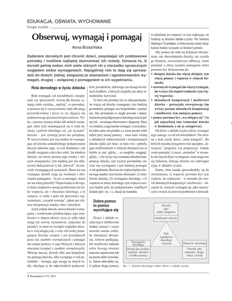 EDUKACJA, OWIATA, WYCHOWANIE Grupy ryzyka Obserwuj, wymagaj i pomagaj Anna Brzeziñska Zadaniem doros³ych jest chroniæ dzieci, zaspokajaæ ich podstawowe potrzeby i mo¿liwie najlepiej stymulowaæ ich rozwój. Oznacza to, i¿ doroli pe³ni¹ wobec nich wiele ró¿nych ról o nierzadko sprzecznych wzglêdem siebie wymaganiach. Najogólniej role te daj¹ siê sprowadziæ do dwóch: jednej, zwi¹zanej ze stawianiem i egzekwowaniem wymagañ, drugiej zwi¹zanej z pomaganiem w ich wype³nianiu. Rola doros³ego w ¿yciu dziecka Brak wymagañ, ich niestabilnoæ, niespójnoæ czy sprzecznoæ, tworz¹ dla dziecka sytuacjê ma³o czyteln¹, mglist¹, co powoduje, i¿ porusza siê w rzeczywistoci ma³o dla niego przewidywalnej i przez to nie daj¹cej mu podstawowego poczucia bezpieczeñstwa. Tylko z pozoru sytuacja braku lub niskich wymagañ, tak¿e tych zmieniaj¹cych siê w rytm nastroju i potrzeb doros³ego czy na ¿yczenie dziecka jest sytuacj¹ przez nie po¿¹dan¹. W rzeczywistoci jest ona trudna, bo wymagaj¹ca od dziecka samodzielnego podejmowania decyzji odnonie tego, co (cel dzia³ania) i jak (rodki osi¹gania celu) chce robiæ. Im m³odsze dziecko, im ni¿szy poziom jego wiedzy i ró¿nych umiejêtnoci, tym trudniej jest mu efektywnie funkcjonowaæ w tak ³atwych, bo niewiele wymagaj¹cych sytuacjach. Skoro nie ma wymagañ, doroli czuj¹ siê zwolnieni z obowi¹zku pomagania bo po co pomagaæ, skoro nie ma takiej potrzeby? Doprowadza to do tego, i¿ dzieci stopniowo zostaj¹ pozbawione nie tylko wsparcia, ale i obecnoci doros³ego, a to oznacza, i¿ znika z pola ich aktywnoci najwa¿niejszy czynnik rozwoju, jakim jest ró¿nica kompetencji miêdzy nimi i doros³ym. Je¿eli jednak doros³y stawia dziecku wymagania i oczekiwania przekraczaj¹ce jego mo¿liwoci w danym okresie ¿ycia (a tylko takie mog¹ ten rozwój stymulowaæ, popychaæ do przodu1), to musi on wyst¹piæ wzglêdem dziecka w swej drugiej roli, a wiêc roli osoby pomagaj¹cej dziecku czerpaæ z ju¿ posiadanych przez nie zasobów wewnêtrznych i pomagaæ mu szukaæ pomocy w jego bli¿szym i dalszym otoczeniu (czerpaæ z zasobów zewnêtrznych). Mówi¹c inaczej, doros³y albo sam bezporednio pomaga dziecku, albo wystêpuje w roli porednika kieruj¹c jego uwagê na innych ludzi, odsy³aj¹c je do odpowiednich podrêczni- 4 Remedium LUTY 2003 ków, poradników, u³atwiaj¹c mu dostêp do ró¿nych rodków, z których mog³oby ju¿ dalej samodzielnie korzystaæ. Te dwie role powinny byæ ze sob¹ powi¹zane: im wiêcej od dziecka wymagamy, tym bardziej powinnimy pomagaæ mu bezporednio i porednio. Aby powi¹zanie to mog³o powstaæ i istnieæ, konieczne jest podjêcie przez doros³ego jeszcze jednej roli uwa¿nego obserwatora i diagnosty. Musi on wiedzieæ, czego mo¿na wymagaæ, z czym dziecko sobie samo nie poradzi, a z czym zacznie sobie radziæ przy naszej pomocy musi mieæ wiedzê o aktualnych w³aciwociach i kompetencjach dziecka (jakie jest teraz, co teraz wie i potrafi), jego mo¿liwociach w ró¿nych obszarach (na co by³oby je staæ, gdyby..., co mog³oby osi¹gn¹æ, gdyby...). Im wy¿ej wiêc oceniamy aktualne kompetencje dziecka, tym wy¿sze powinnimy stawiaæ mu wymagania i tym bardziej pomagaæ w ich spe³nianiu. Bowiem im wiêksza bêdzie równowaga miêdzy tymi trzema obszarami: (1) mo¿liwoci dziecka, (2) wymagania doros³ego i (3) wsparcie ze strony doros³ego, tym wiêksze (szersze) bêdzie pole do podejmowania wspólnych dzia³añ (por. rys. 1.), okazji do kontaktu. Dobra pomoc to pomoc wycofuj¹ca siê Dzieci z uk³adu ryzyka ¿yj¹ w obiektywnie trudnej sytuacji i czêsto niewiele mo¿na zrobiæ, by zmniejszyæ obci¹¿enia, którym podlegaj¹. Ich mo¿liwoci radzenia sobie bywaj¹ równie¿ znacznie ograniczone lub po prostu s³abo rozwiniête. Zatem zdawa³oby siê, i¿ jedyna droga pomocy to udzielanie im wsparcia i to tym wiêkszego, im bardziej s¹ dzieæmi uk³adu ryzyka. Nic bardziej b³êdnego! To pu³apka, w któr¹ mo¿na wpaæ chc¹c komu bardzo (czasami za bardzo!) pomóc. Aby pomoc nie sta³a siê kolejnym obci¹¿eniem, nie obezw³adnia³a dziecka, nie czyni³a go biernym, roszczeniowym odbiorc¹, warto pamiêtaæ o z³otej zasadzie pomagania, która powinna byæ dostosowana do: obci¹¿eñ dziecka (im wiêcej obci¹¿eñ, tym wiêcej pomocy i wsparcia w ró¿nych formach); stawianych wymagañ (im wiêcej wymagañ, im wy¿szy ich stopieñ trudnoci, tym wiêcej wsparcia); aktualnych kompetencji i mo¿liwoci dziecka potencja³u rozwojowego (im wy¿szy poziom aktualnych kompetencji i mo¿liwoci, tym mniejsza pomoc); pomoc powinna byæ wycofuj¹ca siê i to jak najszybciej (ma wzmacniaæ dziecko w dzia³aniach, a nie je zastêpowaæ). Od dzieci z uk³adu ryzyka nale¿y wymagaæ tego samego, co od ich rówieników. Nie mo¿na z nich czyniæ dzieci innej kategorii, dla których musimy przygotowywaæ specjalne, ³atwiejsze programy czy propozycje. Jednak warto pamiêtaæ, i¿ nasze normalne w stosunku do innych dzieci wymagania, tutaj mog¹ staæ siê balastem, którego dziecko nie udwignie ¿yj¹c w uk³adzie ryzyka. Zatem, z³ota zasada sprowadza³aby siê do stwierdzenia, i¿ wsparcie powinno byæ tym wiêksze, im wiêkszych w stosunku do swoich aktualnych kompetencji i mo¿liwoci obci¹¿eñ (tj. naszych wymagañ np. jako nauczycieli i swoich ¿yciowych problemów) dowiad- Doros³y jako dobry diagnosta Mo¿liwoci dziecka Wymagania doros³ego Doros³y jako ¿yczliwy opiekun, doradca i ród³o pomocy Pole wspó³pracy doros³ego i dziecka Wsparcie doros³ego Doros³y jako inspirator, drogowskaz i krytyk Rys. 1. Zadania doros³ego wobec dzieci z uk³adu ryzyka. R EDUKACJA, OWIATA, WYCHOWANIE Grupy ryzyka cza dziecko. Im dziecko jest m³odsze, tym bardziej nale¿a³oby dbaæ o równowagê miêdzy wymaganiami, obci¹¿eniami, kompetencjami, mo¿liwociami oraz wsparciem. Dopasowywanie pomocy do dziecka Rysunek 2 pokazuje cztery mo¿liwe sytuacje, z którymi mo¿emy siê spotkaæ, pomagaj¹c dzieci
