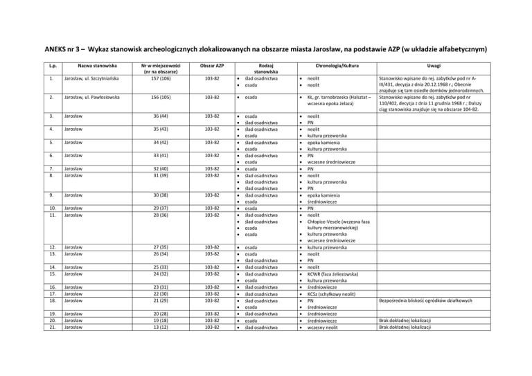 ANEKS nr 3 – Wykaz stanowisk archeologicznych zlokalizowanych na obszarze miasta Jarosław, na podstawie AZP (w układzie alfabetycznym) L.p. Nazwa stanowiska 1. Jarosław, ul. Szczytniańska Nr w miejscowości (nr na obszarze) 157 (106) Obszar AZP 103-82 2. Jarosław, ul. Pawłosiowska 156 (105) 103-82 osada KŁ, gr. tarnobrzeska (Halsztat – wczesna epoka żelaza) 3. Jarosław 36 (44) 103-82 4. Jarosław 35 (43) 103-82 5. Jarosław 34 (42) 103-82 6. Jarosław 33 (41) 103-82 7. 8. Jarosław Jarosław 32 (40) 31 (39) 103-82 103-82 9. Jarosław 30 (38) 103-82 10. 11. Jarosław Jarosław 29 (37) 28 (36) 103-82 103-82 osada ślad osadnictwa ślad osadnictwa osada ślad osadnictwa osada ślad osadnictwa osada osada ślad osadnictwa ślad osadnictwa ślad osadnictwa ślad osadnictwa osada osada ślad osadnictwa ślad osadnictwa osada osada osada osada ślad osadnictwa ślad osadnictwa ślad osadnictwa osada ślad osadnictwa ślad osadnictwa ślad osadnictwa osada ślad osadnictwa osada ślad osadnictwa neolit PN neolit kultura przeworska epoka kamienia kultura przeworska PN wczesne średniowiecze PN neolit kultura przeworska PN epoka kamienia średniowiecze PN neolit Chłopice-Vesele (wczesna faza kultury mierzanowickiej) kultura przeworska wczesne średniowiecze kultura przeworska neolit PN neolit KCWR (faza żeliezowska) kultura przeworska średniowiecze KCSz (schyłkowy neolit) PN średniowiecze średniowiecze średniowiecze wczesny neolit 12. 13. Jarosław Jarosław 27 (35) 26 (34) 103-82 103-82 14. 15. Jarosław Jarosław 25 (33) 24 (32) 103-82 103-82 16. 17. 18. Jarosław Jarosław Jarosław 23 (31) 22 (30) 21 (29) 103-82 103-82 103-82 19. 20. 21. Jarosław Jarosław Jarosław 20 (28) 19 (18) 13 (12) 103-82 103-82 103-82 Rodzaj stanowiska ślad osadnictwa osada Chronologia/Kultura neolit neolit Uwagi Stanowisko wpisane do rej. zabytków pod nr AIII/431, decyzja z dnia 20.12.1968 r.; Obecnie znajduje się tam osiedle domków jednorodzinnych. Stanowisko wpisane do rej. zabytków pod nr 110/402, decyzja z dnia 11 grudnia 1968 r.; Dalszy ciąg stanowiska znajduje się na obszarze 104-82. Bezpośrednia bliskość ogródków działkowych Brak dokładnej lokalizacji Brak dokładnej lokalizacji L.p. Nazwa stanowiska 22. Jarosław Nr w miejscowości (nr na obszarze) 10 (9) Obszar AZP 103-82 Rodzaj stanowiska ślad osadnictwa Chronologia/Kultura 23. Jarosław 9 (8) 103-82 ślad osadnictwa 24. 25. 8 (7) 7 (6) 103-82 103-82 ślad osadnictwa ślad osadnictwa 26. Jarosław – Kruhel Pawłosiowski Jarosław- Przedmieście Górnoleżajskie Jarosław 37 (6) 102-83 27. Jarosław 38 (7) 102-83 28. Jarosław - Stawki 39 (8) 102-83 29. 30. Jarosław - Stawki Jarosław - Stawki 40 (9) 41 (10) 102-83 102-83 31. 32. 33. Jarosław - Stawki Jarosław Jarosław 42 (11) 2 (1) 3 (2) 102-83 103-83 103-83 ślad osadnictwa punkt osadniczy ślad osadnictwa punkt osadniczy ślad osadnictwa punkt osadniczy osada osada punkt osadniczy punkt osadniczy punkt osadniczy punkt osadniczy ślad osadnictwa ślad osadnictwa ślad osadnictwa 34. Jarosław 4 (3) 103-83 ślad osadnictwa 35. 36. 37. 38. 39. Jarosław Jarosław Jarosław Jarosław Jarosław 5 (4) 6 (5) 9 (6) 11 (7) 12 (8) 103-83 103-83 103-83 103-83 103-83 ślad osadnictwa ślad osadnictwa ślad osadnictwa ślad osadnictwa ślad osadnictwa 40. 41. 42. Jarosław Jarosław Jarosław 14 (9) 15 (10) 16 (11) 103-83 103-83 103-83 ślad osadnictwa ślad osadnictwa ślad osadnictwa 43. 44. Jarosław Jarosław, ul. Pełkińska 17 (12) 18 (13) 103-83 103-83 ślad osadnictwa skarb wczesna EB kultura przeworska wczesne średniowiecze PN epoka kamienia-epoka brązu PN kultura przeworska wczesne średniowiecze PN kultura przeworska wczesne średniowiecze PN epoka kamienia-epoka brązu KCSz (schyłkowy neolit) k.ultura mierzanowicka (I okres EB) kultura mierzanowicka I okres EB) KLW KLW KCSz kultura łużycka kultura mierzanowicka (I okres EB) kultura trypolska neolit kultura mierzanowicka (I okres EB) KCSz (schyłkowy neolit) KŁ 45. 46. 47. Jarosław Jarosław Jarosław 43 (14) 44 (15) 45 (16) 103-83 103-83 103-83 ślad osadnictwa ślad osadnictwa ślad osadnictwa neolit PN KŁ kultura mierzanowicka (I okres EB) kultura mierzanowicka (I okres EB) KCSz (schyłkowy neolit) kultura przeworska Uwagi Brak dokładnej lokalizacji Brak dokładnej lokalizacji Brak dokładnej lokalizacji Brak dokładnej lokalizacji Znaczny stopień zniszczenia stanowiska Przy drodze Brak dokładnej lokalizacji Brak dokładnej lokalizacji Brak dokładnej lokalizacji Brak dokładnej lokalizacji Brak dokładnej lokalizacji Brak dokładnej lokalizacji Brak dokładnej lokalizacji Brak dokładnej lokalizacji Brak dokładnej lokalizacji Brak dokładnej lokalizacji Brak dokładnej lokalizacji Brak dokładnej lokalizacji Konieczny nadzór archeologiczny nad wszelkimi pracami ziemnymi Brak dokładnej lokalizacji Brak dokładnej lokalizacji Brak dokładnej lokalizacji, znalezione nad Sanem L.p. Nazwa stanowiska 48. 49. 50. 51. 52. 53. 54. Jarosław Jarosław Jarosław Jarosław Jarosław Jarosław Jarosław Nr w miejscowości (nr na obszarze) 46 (17) 47 (18) 48 (19) 49 (20) 50 (21) 51 (22) 52 (23) Obszar AZP 103-83 103-83 103-83 103-83 103-83 103-83 103-83 Rodzaj stanowiska ślad osadnictwa ślad osadnictwa ślad osadnictwa ślad osadnictwa ślad osadnictwa ślad osadnictwa ślad osadnictwa 55. 56. Jarosław Jarosław 53 (24) 55 (26) 103-83 103-83 ślad osadnictwa ślad obozowiska 57. 58. Jarosław Jarosław 56 (27) 57 (28) 103-83 103-83 ślad osadnictwa osada palafitowa 59. 60. 61. 62. Jarosław Jarosław Jarosław Jarosław 58 (29) 59 (30) 60 (31) 61 (32) 103-83 103-83 103-83 103-83 ślad osadnictwa ślad osadnictwa ślad osadnictwa ślad osadnictwa PN KŁ KŁ (II-III okres EB) KCSZ (schyłkowy neolit) neolit IV okres EB Halsztat (wczesna epoka żelaza) Halsztat (wczesna epoka żelaza) gr. mazowszańska (11 tys.-7 tys. 900) PN neolit?/okres wczesnopiastowski? okres rzymski okres rzymski okres rzymski okres rzymsk