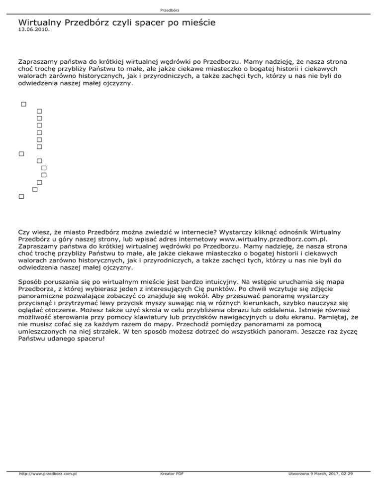 Przedbórz Wirtualny Przedbórz czyli spacer po mieście 13.06.2010. Zapraszamy państwa do krótkiej wirtualnej wędrówki po Przedborzu. Mamy nadzieję, że nasza strona choć trochę przybliży Państwu to małe, ale jakże ciekawe miasteczko o bogatej historii i ciekawych walorach zarówno historycznych, jak i przyrodniczych, a także zachęci tych, którzy u nas nie byli do odwiedzenia naszej małej ojczyzny. Czy wiesz, że miasto Przedbórz można zwiedzić w internecie? Wystarczy kliknąć odnośnik Wirtualny Przedbórz u góry naszej strony, lub wpisać adres internetowy www.wirtualny.przedborz.com.pl. Zapraszamy państwa do krótkiej wirtualnej wędrówki po Przedborzu. Mamy nadzieję, że nasza strona choć trochę przybliży Państwu to małe, ale jakże ciekawe miasteczko o bogatej historii i ciekawych walorach zarówno historycznych, jak i przyrodniczych, a także zachęci tych, którzy u nas nie byli do odwiedzenia naszej małej ojczyzny. Sposób poruszania się po wirtualnym mieście jest bardzo intuicyjny. Na wstępie uruchamia się mapa Przedborza, z której wybierasz jeden z interesujących Cię punktów. Po chwili wczytuje się zdjęcie panoramiczne pozwalające zobaczyć co znajduje się wokół. Aby przesuwać panoramę wystarczy przycisnąć i przytrzymać lewy przycisk myszy suwając nią w różnych kierunkach, szybko nauczysz się oglądać otoczenie. Możesz także użyć skrola w celu przybliżenia obrazu lub oddalenia. Istnieje również możliwość sterowania przy pomocy klawiatury lub przycisków nawigacyjnych u dołu ekranu. Pamiętaj, że nie musisz cofać się za każdym razem do mapy. Przechodź pomiędzy panoramami za pomocą umieszczonych na niej strzałek. W ten sposób możesz dotrzeć do wszystkich panoram. Jeszcze raz życzę Państwu udanego spaceru! http://www.przedborz.com.pl Kreator PDF Utworzono 9 March, 2017, 02:29