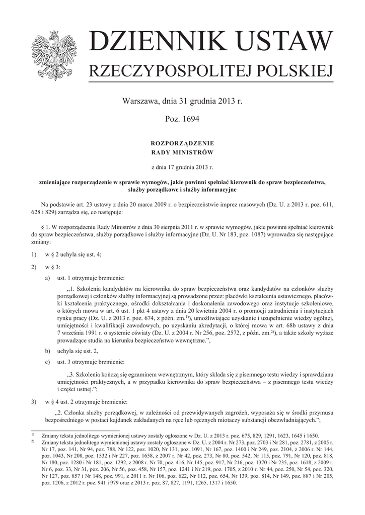 DZIENNIK USTAW RZECZYPOSPOLITEJ POLSKIEJ Warszawa, dnia 31 grudnia 2013 r. Poz. 1694 ROZPORZĄDZENIE RADY MINISTRÓW z dnia 17 grudnia 2013 r. zmieniające rozporządzenie w sprawie wymogów, jakie powinni spełniać kierownik do spraw bezpieczeństwa, służby porządkowe i służby informacyjne Na podstawie art. 23 ustawy z dnia 20 marca 2009 r. o bezpieczeństwie imprez masowych (Dz. U. z 2013 r. poz. 611, 628 i 829) zarządza się, co następuje: § 1. W rozporządzeniu Rady Ministrów z dnia 30 sierpnia 2011 r. w sprawie wymogów, jakie powinni spełniać kierownik do spraw bezpieczeństwa, służby porządkowe i służby informacyjne (Dz. U. Nr 183, poz. 1087) wprowadza się następujące zmiany: 1) w § 2 uchyla się ust. 4; 2) w § 3: a) ust. 1 otrzymuje brzmienie: „1. Szkolenia kandydatów na kierownika do spraw bezpieczeństwa oraz kandydatów na członków służby porządkowej i członków służby informacyjnej są prowadzone przez: placówki kształcenia ustawicznego, placówki kształcenia praktycznego, ośrodki dokształcania i doskonalenia zawodowego oraz instytucje szkoleniowe, o których mowa w art. 6 ust. 1 pkt 4 ustawy z dnia 20 kwietnia 2004 r. o promocji zatrudnienia i instytucjach rynku pracy (Dz. U. z 2013 r. poz. 674, z późn. zm.1)), umożliwiające uzyskanie i uzupełnienie wiedzy ogólnej, umiejętności i kwalifikacji zawodowych, po uzyskaniu akredytacji, o której mowa w art. 68b ustawy z dnia 7 września 1991 r. o systemie oświaty (Dz. U. z 2004 r. Nr 256, poz. 2572, z późn. zm.2)), a także szkoły wyższe prowadzące studia na kierunku bezpieczeństwo wewnętrzne.”, b) uchyla się ust. 2, c) ust. 3 otrzymuje brzmienie: „3. Szkolenia kończą się egzaminem wewnętrznym, który składa się z pisemnego testu wiedzy i sprawdzianu umiejętności praktycznych, a w przypadku kierownika do spraw bezpieczeństwa – z pisemnego testu wiedzy i części ustnej.”; 3) w § 4 ust. 2 otrzymuje brzmienie: „2. Członka służby porządkowej, w zależności od przewidywanych zagrożeń, wyposaża się w środki przymusu bezpośredniego w postaci kajdanek zakładanych na ręce lub ręcznych miotaczy substancji obezwładniających.”; 1) 2) Zmiany tekstu jednolitego wymienionej ustawy zostały ogłoszone w Dz. U. z 2013 r. poz. 675, 829, 1291, 1623, 1645 i 1650. Zmiany tekstu jednolitego wymienionej ustawy zostały ogłoszone w Dz. U. z 2004 r. Nr 273, poz. 2703 i Nr 281, poz. 2781, z 2005 r. Nr 17, poz. 141, Nr 94, poz. 788, Nr 122, poz. 1020, Nr 131, poz. 1091, Nr 167, poz. 1400 i Nr 249, poz. 2104, z 2006 r. Nr 144, poz. 1043, Nr 208, poz. 1532 i Nr 227, poz. 1658, z 2007 r. Nr 42, poz. 273, Nr 80, poz. 542, Nr 115, poz. 791, Nr 120, poz. 818, Nr 180, poz. 1280 i Nr 181, poz. 1292, z 2008 r. Nr 70, poz. 416, Nr 145, poz. 917, Nr 216, poz. 1370 i Nr 235, poz. 1618, z 2009 r. Nr 6, poz. 33, Nr 31, poz. 206, Nr 56, poz. 458, Nr 157, poz. 1241 i Nr 219, poz. 1705, z 2010 r. Nr 44, poz. 250, Nr 54, poz. 320, Nr 127, poz. 857 i Nr 148, poz. 991, z 2011 r. Nr 106, poz. 622, Nr 112, poz. 654, Nr 139, poz. 814, Nr 149, poz. 887 i Nr 205, poz. 1206, z 2012 r. poz. 941 i 979 oraz z 2013 r. poz. 87, 827, 1191, 1265, 1317 i 1650. Dziennik Ustaw 4) –2– Poz. 1694 w § 9: a) ust. 1 i 2 otrzymują brzmienie: „1. Przebieg czynności, o których mowa w § 7 ust. 6 i 7 oraz w § 8 ust. 4, członkowie służby porządkowej dokumentują notatką. 2. Notatka, o której mowa w ust. 1, zawiera: 1) imię i nazwisko członka służby porządkowej oraz jego numer identyfikacyjny; 2) dane osoby, w stosunku do której zostały podjęte czynności: a) imię i nazwisko, b) serię i numer dokumentu tożsamości, c) datę urodzenia; 3) określenie czasu i miejsca podjęcia czynności; 4) określenie celu, przyczyn oraz skutków podjętych czynności; 5) podpisy członków służby porządkowej, którzy dokonali tych czynności.”, b) po ust. 2 dodaje się ust. 2a w brzmieniu: „2a. Jeżeli uzyskanie danych, o których mowa w ust. 2 pkt 2, było niemożliwe, w notatce podaje się przyczyny ich nieumieszczenia.”. § 2. Rozporządzenie wchodzi w życie z dniem 1 stycznia 2014 r. Prezes Rady Ministrów: D. Tusk