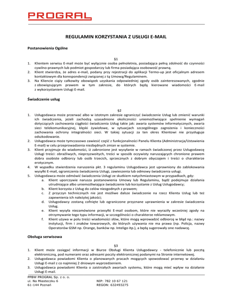 REGULAMIN KORZYSTANIA Z USŁUGI E-MAIL Postanowienia Ogólne 1. 2. 3. §1 Klientem serwisu E-mail może być wyłącznie osoba pełnoletnia, posiadająca pełną zdolność do czynności cywilno-prawnych lub podmiot gospodarczy go lub firma posiadająca osobowość prawną. Klient stwierdza, że adres e-mail, mail, podany przy rejestracji do aplikacji Termo-up jest oficjalnym adresem kontaktowym dla korespondencji związanej z tą Umową/Regulaminem. Umową Na Kliencie ciąży całkowity obowiązek uzyskania odpowiedniej zgody osób zainteresowanych, zgodnie z obowiązującym prawem w tym zakresie, do których będą kierowane wiadomości E-mail E z wykorzystaniem Usługi E-mail. mail. Świadczenie usług 1. 2. 3. 4. 5. §2 Usługodawca może przerwać albo w istotnym zakresie ograniczyć świadczenie świadczenie Usług lub zmienić warunki ich świadczenia, jeżeli zachodzą uzasadnione okoliczności uniemożliwiające spełnienie wymagań dotyczących zachowania ciągłości świadczenia Usług takie jak: jak awaria systemów informatycznych, awaria sieci telekomunikacyjnej, klęski żywiołowe, w sytuacjach szczególnego szczególnego zagrożenia i konieczności zachowania ochrony integralności sieci. W takiej sytuacji za ten okres Klientowi nie przysługuje odszkodowanie. Usługodawca może tymczasowo zawiesić część z funkcjonalności Panelu Klienta (Administracja/Ustawienia E-mail) w celu przeprowadzenia niezbędnych n zmian w systemie. Klient przyjmuje do wiadomości, iż zabronione jest wysyłanie w ramach świadczonej przez Usługodawcę Usługi treści: obraźliwych, nieprzyzwoitych, treści w sposób oczywisty naruszających chronione prawem dobra osobiste odbiorcy lub osób trzecich, sprzecznych z dobrym obyczajem i treści treś o charakterze erotycznym. W wypadku stwierdzenia naruszenia pkt. 3 regulaminu Usługodawca jest uprawniony do zablokowania wysyłki E-mail,, ograniczenia świadczenia Usługi,, zawieszenia lub odmowy świadczenia usługi. Usługodawca może odmówić świadczenia Usługi ze skutkiem natychmiastowym astowym w przypadkach, gdy: a. Klient uporczywie narusza postanowienia postanowienia Umowy lub Regulaminu, bądź podejmuje działania utrudniające albo uniemożliwiające świadczenie lub korzystanie z Usług Usługodawcy; Usługodawcy b. Klient korzysta z Usług do celów niezgodnych z prawem; c. Z przyczyn technicznych nie jest możliwe dalsze świadczenie na rzecz Klienta Usług lub też zapewnienia ewnienia ich należytej jakości; d. Usługodawcy zostaną cofnięte lub ograniczone przyznane uprawnienia w zakresie świadczenia Usług. e. Klient wysyła niezamówione zamówione przesyłki E-mail osobom, które nie wyraziły wcześniej zgody na otrzymywanie tego typu informacji, w szczególności szczególności o charakterze reklamowym. f. Klient używa w polu treści wiadomości słów, które mogą wprowadzić odbiorcę w błąd np.: nazwy instytucji, firm irm i znaków towarowych, towarowych do których używania nie ma prawa (np. Policja, nazwy Operatorów GSM np. Orange, banków np. Inteligo itp.), itp.), a będą sugerowały one nadawcę. Obsługa serwisowa 1. 2. 3. §3 Klient może zasięgać informacji w Biurze B Obsługi Klienta Usługodawcy - telefonicznie lub pocztą elektroniczną, pod numerami oraz adresami poczty elektronicznej podanymi na Stronie internetowej. internetowej Usługodawca powiadomi Klienta o planowanych pracach mogących spowodować przerwy w działaniu Usługi E-mail z co najmniej 2 dniowym wyprzedzeniem. Usługodawca powiadomi Klienta o zaistniałych awariach systemu,, które mogą mieć wpływ na działanie Usługi E-mail. PPBW PROGRAL Sp. z o. o. ul. Na Miasteczku 6 61-144 Poznań NIP: 782 10 67 121 REGON: 632493275 Odpowiedzialność Usługodawcy 1. 2. §4 Usługodawca nie odpowiada za treści wysyłane poprzez Klientów za pośrednictwem ośrednictwem Usługi E-mail. Usługodawca nie ponosi odpowiedzialności za niedostarczone wiadomości, wysłane z opóźnieniem, wiadomości E-mail, które nie mogły zostać wysłane z powodów technicznych niezależnych od Usługodawcy lub wiadomości E-mail, które nie zostały prawidłowo skolejkowane. skolejko Postanowienia końcowe 1. §5 W sprawach nieuregulowanych owanych niniejszym Regulaminem będą miały zastosowanie zapisy Regulaminu Świadczenia Usług Drogą Elektroniczną Usługodawcy, Umowy i Cenniki oraz przepisy prawa powszechnie obowiązującego, w szczególności kodeksu cywilnego i ustawy Prawo telekomunikacyjne. PPBW PROGRAL Sp. z o. o. ul. Na Miasteczku 6 61-144 Poznań NIP: 782 10 67 121 REGON: 632493275