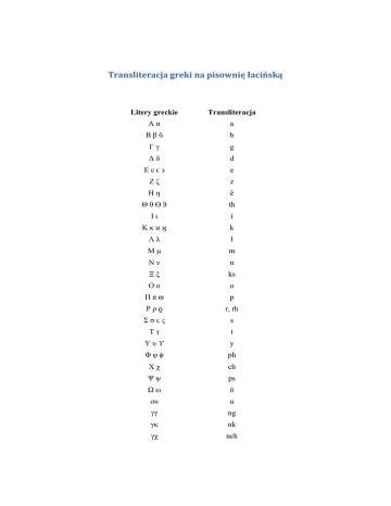 Transliteracja greki na pisownię łacińską Litery greckie Transliteracja Αα a Ββϐ b Γγ g Δδ d Εεϵ϶ e Ζζ z Ηη ē Θθϴϑ th Ιι i Κκϰϗ k Λλ l Μμ m Νν n Ξξ ks Οο o Ππϖ p Ρρϱ r, rh Σσϲς s Ττ t Υυϒ y Φφϕ ph Χχ ch Ψψ ps Ωω ō ου u γγ ng γκ nk γχ nch