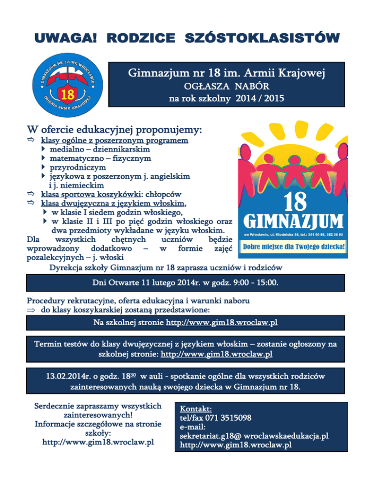 UWAGA! RODZICE SZÓSTOKLASISTÓW Gimnazjum nr 18 im. Armii Krajowej OGŁASZA NABÓR na rok szkolny 2014 / 2015 W ofercie edukacyjnej proponujemy: klasy ogólne z poszerzonym programem medialno – dziennikarskim matematyczno – fizycznym przyrodniczym językowa z poszerzonym j. angielskim i j. niemieckim klasa sportowa koszykówki: chłopców klasa dwujęzyczna z językiem włoskim, w klasie I siedem godzin włoskiego, w klasie II i III po pięć godzin włoskiego oraz dwa przedmioty wykładane w języku włoskim. Dla wszystkich chętnych uczniów będzie wprowadzony dodatkowo – w formie zajęć pozalekcyjnych – j. włoski Dyrekcja szkoły Gimnazjum nr 18 zaprasza uczniów i rodziców Dni Otwarte 11 lutego 2014r. w godz. 9:00 - 15:00. Procedury rekrutacyjne, oferta edukacyjna i warunki naboru do klasy koszykarskiej zostaną przedstawione: Na szkolnej stronie http://www.gim18.wroclaw.pl Termin testów do klasy dwujęzycznej z językiem włoskim – zostanie ogłoszony na szkolnej stronie: http://www.gim18.wroclaw.pl 13.02.2014r. o godz. 1830 w auli - spotkanie ogólne dla wszystkich rodziców zainteresowanych nauką swojego dziecka w Gimnazjum nr 18. Serdecznie zapraszamy wszystkich zainteresowanych! Informacje szczegółowe na stronie szkoły: http://www.gim18.wroclaw.pl Kontakt: tel/fax 071 3515098 e-mail: sekretariat.g18@ wroclawskaedukacja.pl http://www.gim18.wroclaw.pl Od roku szkolnego 2009/2010 nauczamy obowiązkowo dwóch języków obcych (j. angielski, j. niemiecki z podziałem na grupy zgodnie z poziomem umiejętności językowych). Realizujemy autorski program nauczania j. włoskiego w klasie dwujęzycznej. Poszerzanie wiedzy i umiejętności na licznych zajęciach pozalekcyjnych (w bieżącym roku szkolnym około 40 kół), których ofertę dostosowujemy do zainteresowań uczniów. Skutecznie pozyskujemy środki na wymianę międzynarodową młodzieży: z (Rumunii, Bułgarii, Turcji, Hiszpanii) w ramach projektów „Comenius” oraz z Funduszu Wyszehradzkiego. Jako jedyni w Polsce realizujemy program FSS w ramach wymiany ze szkołą z Norwegii. Klasy dwujęzyczne z językiem włoskim uczestniczą w wymianie międzynarodowej ze szkołą włoską w Brescii i na Sycylii. Nasi uczniowie są zaangażowani w działania wolontariatu (współpraca z Domem Samotnej Matki, opieka nad grobami osób represjonowanych, opieka nad byłymi żołnierzami AK). Jesteśmy inicjatorami projektów edukacyjnych dla miasta Wrocławia: „Cały Wrocław czyta dzieciom”, projekt „Książka”, Promocja Zdrowia, eAkademia Przyszłości. Przygotowujemy uczniów i przeprowadzamy egzaminy na Europejski Certyfikat Umiejętności Komputerowych – ECDL. Pedagodzy szkolni, psycholog i logopeda prowadzą indywidualne zajęcia z uczniami mającymi specjalne potrzeby edukacyjne. Uczniowie mają zagwarantowaną stałą opiekę psychologa i logopedy. W klasie trzeciej uczniowie realizują poszerzony program z informatyki „Zarządzanie informacją” (dodatkowa godzina informatyki). W naszej szkole działa: chór, zespoły teatralne, w tym w j. włoskim i j. angielskim, zespół redakcyjny gazetki szkolnej „Apropos”, Klub Turystyczny Miłośników Wrocławia, wolontariat. Bezpieczne położenie szkoły blisko głównych węzłów komunikacyjnych. NASZA BAZA: przestronne sale lekcyjne, pracownie biologiczne, chemiczne, fizyczne 2 sale gimnastyczne, dwie siłownie (certyfikat europejski), sale do tenisa stołowego, boiska do koszykówki, ogrodzone boisko do siatkówki plażowej językowa pracownia multimedialna z dostępem do Internetu 2 sale komputerowe po 16 komputerów aula przystosowana do prezentacji multimedialnych dobrze wyposażona biblioteka z czytelnią i salą audiowizualną stołówka i bufet, sklepik szkolny ze zdrową żywnością piękne tereny zielone wokół szkoły pielęgniarka szkolna stały doradca zawodowy Osiągamy wysokie wyniki egzaminu gimnazjalnego