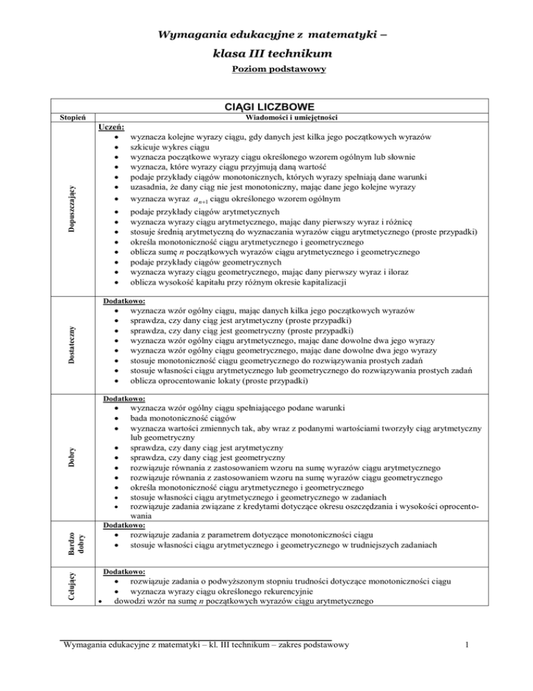 Wymagania edukacyjne z matematyki – klasa III technikum Poziom podstawowy CIĄGI LICZBOWE Dopuszczający Stopień Wiadomości i umiejętności Uczeń: wyznacza kolejne wyrazy ciągu, gdy danych jest kilka jego początkowych wyrazów szkicuje wykres ciągu wyznacza początkowe wyrazy ciągu określonego wzorem ogólnym lub słownie wyznacza, które wyrazy ciągu przyjmują daną wartość podaje przykłady ciągów monotonicznych, których wyrazy spełniają dane warunki uzasadnia, że dany ciąg nie jest monotoniczny, mając dane jego kolejne wyrazy wyznacza wyraz a n 1 ciągu określonego wzorem ogólnym podaje przykłady ciągów arytmetycznych wyznacza wyrazy ciągu arytmetycznego, mając dany pierwszy wyraz i różnicę stosuje średnią arytmetyczną do wyznaczania wyrazów ciągu arytmetycznego (proste przypadki) określa monotoniczność ciągu arytmetycznego i geometrycznego oblicza sumę n początkowych wyrazów ciągu arytmetycznego i geometrycznego podaje przykłady ciągów geometrycznych wyznacza wyrazy ciągu geometrycznego, mając dany pierwszy wyraz i iloraz oblicza wysokość kapitału przy różnym okresie kapitalizacji Dodatkowo: Dostateczny wyznacza wzór ogólny ciągu, mając danych kilka jego początkowych wyrazów sprawdza, czy dany ciąg jest arytmetyczny (proste przypadki) sprawdza, czy dany ciąg jest geometryczny (proste przypadki) wyznacza wzór ogólny ciągu arytmetycznego, mając dane dowolne dwa jego wyrazy wyznacza wzór ogólny ciągu geometrycznego, mając dane dowolne dwa jego wyrazy stosuje monotoniczność ciągu geometrycznego do rozwiązywania prostych zadań stosuje własności ciągu arytmetycznego lub geometrycznego do rozwiązywania prostych zadań oblicza oprocentowanie lokaty (proste przypadki) Dodatkowo: Dobry wyznacza wzór ogólny ciągu spełniającego podane warunki bada monotoniczność ciągów wyznacza wartości zmiennych tak, aby wraz z podanymi wartościami tworzyły ciąg arytmetyczny lub geometryczny sprawdza, czy dany ciąg jest arytmetyczny sprawdza, czy dany ciąg jest geometryczny rozwiązuje równania z zastosowaniem wzoru na sumę wyrazów ciągu arytmetycznego rozwiązuje równania z zastosowaniem wzoru na sumę wyrazów ciągu geometrycznego określa monotoniczność ciągu arytmetycznego i geometrycznego stosuje własności ciągu arytmetycznego i geometrycznego w zadaniach rozwiązuje zadania związane z kredytami dotyczące okresu oszczędzania i wysokości oprocentowania Dodatkowo: Celujący Bardzo dobry rozwiązuje zadania z parametrem dotyczące monotoniczności ciągu stosuje własności ciągu arytmetycznego i geometrycznego w trudniejszych zadaniach Dodatkowo: rozwiązuje zadania o podwyższonym stopniu trudności dotyczące monotoniczności ciągu wyznacza wyrazy ciągu określonego rekurencyjnie dowodzi wzór na sumę n początkowych wyrazów ciągu arytmetycznego Wymagania edukacyjne z matematyki – kl. III technikum – zakres podstawowy 1 FUNKCJE WYKŁADNICZE I LOGARYTMICZNE Wiadomości i umiejętności Stopień Dopuszczający Uczeń : oblicza potęgi o wykładnikach wymiernych zapisuje daną liczbę w postaci potęgi o wykładniku wymiernym zapisuje daną liczbę w postaci potęgi o danej podstawie upraszcza wyrażenia, stosując prawa działań na potęgach (proste przypadki) porównuje liczby przedstawione w postaci potęg (proste przypadki) wyznacza wartości funkcji wykładniczej dla podanych argumentów sprawdza, czy punkt należy do wykresu funkcji wykładniczej szkicuje wykres funkcji wykładniczej, stosując przesunięcie o wektor i określa jej własności oblicza logarytm danej liczby stosuje równości wynikające z definicji logarytmu do prostych obliczeń oblicza logarytm iloczynu, ilorazu i potęgi, stosując odpowiednie twierdzenia o logarytmach Dodatkowo: Dostateczny szkicuje wykres funkcji, będący efektem jednego przekształcenia wykresu funkcji wykładniczej i określa jej własności wyznacza wzór funkcji wykładniczej i szkicuje jej wykres, znając współrzędne punktu należącego do jej wykresu rozwiązuje równania wykładnicze, stosując logarytm wyznacza podstawę logarytmu lub liczbę logarytmowaną, gdy dana jest jego wartość Celujący Bardzo dobry Dobry Dodatkowo: upraszcza wyrażenia, stosując prawa działań na potęgach porównuje liczby przedstawione w postaci potęg odczytuje rozwiązania nierówności na postawie wykresów funkcji wykładniczych podaje odpowiednie założenia dla podstawy logarytmu lub liczby logarytmowanej stosuje twierdzenie o logarytmie iloczynu, ilorazu i potęgi do uzasadnienia równości wyrażeń wykorzystuje własności funkcji wykładniczej i logarytmu do rozwiązywania zadań o kontekście praktycznym Dodatkowo: wykorzystuje własności funkcji wykładniczej i logarytmu w trudniejszych zadaniach podaje przybliżoną wartość logarytmów dziesiętnych z wykorzystaniem tablic Dodatkowo: dowodzi twierdzenia o logarytmach wykorzystuje twierdzenie o zmianie podstawy logarytmu w zadaniach rozwiązuje zadania o znacznym stopniu trudności dotyczące funkcji wykładniczej i logarytmicznej STEREOMETRIA Wiadomości i umiejętności Stopień Dopuszczający Uczeń: wskazuje w wielościanie proste prostopadłe, równoległe i skośne wskazuje w wielościanie rzut prostokątny danego odcinka na daną płaszczyznę określa liczby ścian, wierzchołków i krawędzi wielościanu wskazuje elementy charakterystyczne wielościanu (np. wierzchołek ostrosłupa) oblicza pola powierzchni bocznej i całkowitej graniastosłupa i ostrosłupa prostego rysuje siatkę wielościanu na podstawie jej fragmentu oblicza objętości graniastosłupa i ostrosłupa prawidłowego wskazuje kąt między przekątną graniastosłupa a płaszczyzną jego podstawy wskazuje kąty między odcinkami w ostrosłupie a płaszczyzną jego podstawy rozwiązuje typowe zadania dotyczące kąta między prostą a płaszczyzną wskazuje elementy charakterystyczne bryły obrotowej (np. kąt ro