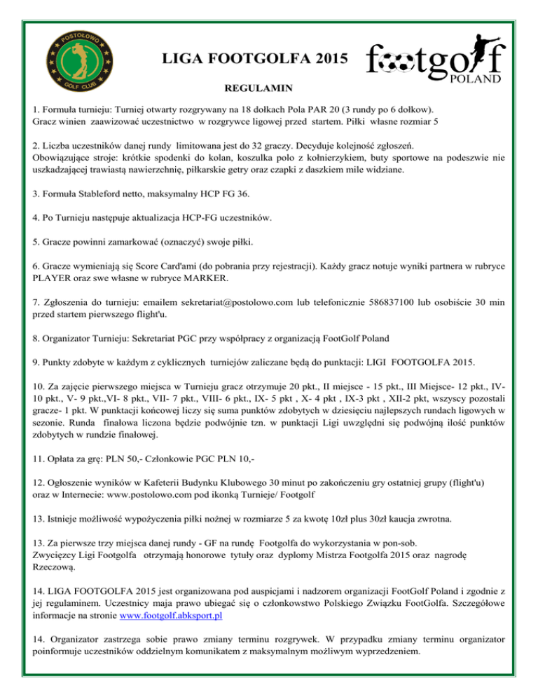 LIGA FOOTGOLFA 2015 REGULAMIN 1. Formuła turnieju: Turniej otwarty rozgrywany na 18 dołkach Pola PAR 20 (3 rundy po 6 dołkow). Gracz winien zaawizować uczestnictwo w rozgrywce ligowej przed startem. Piłki własne rozmiar 5 2. Liczba uczestników danej rundy limitowana jest do 32 graczy. Decyduje kolejność zgłoszeń. Obowiązujące stroje: krótkie spodenki do kolan, koszulka polo z kołnierzykiem, buty sportowe na podeszwie nie uszkadzającej trawiastą nawierzchnię, piłkarskie getry oraz czapki z daszkiem mile widziane. 3. Formuła Stableford netto, maksymalny HCP FG 36. 4. Po Turnieju następuje aktualizacja HCP-FG uczestników. 5. Gracze powinni zamarkować (oznaczyć) swoje piłki. 6. Gracze wymieniają się Score Card'ami (do pobrania przy rejestracji). Każdy gracz notuje wyniki partnera w rubryce PLAYER oraz swe własne w rubryce MARKER. 7. Zgłoszenia do turnieju: emailem [email protected] lub telefonicznie 586837100 lub osobiście 30 min przed startem pierwszego flight'u. 8. Organizator Turnieju: Sekretariat PGC przy współpracy z organizacją FootGolf Poland 9. Punkty zdobyte w każdym z cyklicznych turniejów zaliczane będą do punktacji: LIGI FOOTGOLFA 2015. 10. Za zajęcie pierwszego miejsca w Turnieju gracz otrzymuje 20 pkt., II miejsce - 15 pkt., III Miejsce- 12 pkt., IV10 pkt., V- 9 pkt.,VI- 8 pkt., VII- 7 pkt., VIII- 6 pkt., IX- 5 pkt , X- 4 pkt , IX-3 pkt , XII-2 pkt, wszyscy pozostali gracze- 1 pkt. W punktacji końcowej liczy się suma punktów zdobytych w dziesięciu najlepszych rundach ligowych w sezonie. Runda finałowa liczona będzie podwójnie tzn. w punktacji Ligi uwzględni się podwójną ilość punktów zdobytych w rundzie finałowej. 11. Opłata za grę: PLN 50,- Członkowie PGC PLN 10,12. Ogłoszenie wyników w Kafeterii Budynku Klubowego 30 minut po zakończeniu gry ostatniej grupy (flight'u) oraz w Internecie: www.postolowo.com pod ikonką Turnieje/ Footgolf 13. Istnieje możliwość wypożyczenia piłki nożnej w rozmiarze 5 za kwotę 10zł plus 30zł kaucja zwrotna. 13. Za pierwsze trzy miejsca danej rundy - GF na rundę Footgolfa do wykorzystania w pon-sob. Zwycięzcy Ligi Footgolfa otrzymają honorowe tytuły oraz dyplomy Mistrza Footgolfa 2015 oraz nagrodę Rzeczową. 14. LIGA FOOTGOLFA 2015 jest organizowana pod auspicjami i nadzorem organizacji FootGolf Poland i zgodnie z jej regulaminem. Uczestnicy maja prawo ubiegać się o członkowstwo Polskiego Związku FootGolfa. Szczegółowe informacje na stronie www.footgolf.abksport.pl 14. Organizator zastrzega sobie prawo zmiany terminu rozgrywek. W przypadku zmiany terminu organizator poinformuje uczestników oddzielnym komunikatem z maksymalnym możliwym wyprzedzeniem.