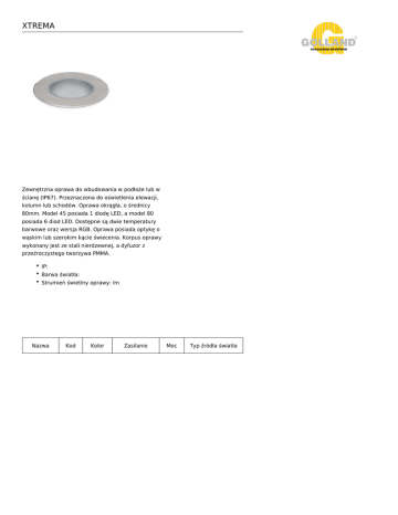 XTREMA Zewnętrzna oprawa do wbudowania w podłoże lub w ścianę (IP67). Przeznaczona do oświetlenia elewacji, kolumn lub schodów. Oprawa okrągła, o średnicy 80mm. Model 45 posiada 1 diodę LED, a model 80 posiada 6 diod LED. Dostępne są dwie temperatury barwowe oraz wersja RGB. Oprawa posiada optykę o wąskim lub szerokim kącie świecenia. Korpus oprawy wykonany jest ze stali nierdzewnej, a dyfuzor z przeźroczystego tworzywa PMMA. IP: Barwa światła: Strumień świetlny oprawy: lm Nazwa Kod Kolor Zasilanie Moc Typ źródła światła