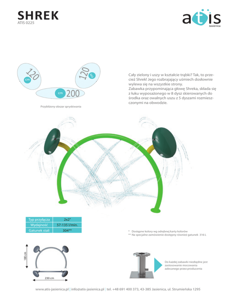 Shrek ATIS 0225 Przybliżony obszar spryskiwania 2x2” Wydajność 57-135 l/min. Gatunek stali 304** 180 cm Typ przyłącza Cały zielony i uszy w kształcie trąbki? Tak, to przecież Shrek! Jego rozbrajający uśmiech dosłownie wylewa się na wszystkie strony. Zabawka przypominająca głowę Shreka, składa się z łuku wyposażonego w 8 dysz skierowanych do środka oraz owalnych uszu z 5 dyszami rozmieszczonymi na obwodzie. * Dostępne kolory wg odrębnej karty kolorów **Na specjalne zamówienie dostępny również gatunek 316 L Do każdej zabawki niezbędne jest zastosowanie mocowania zalecanego przez producenta 230 cm www.atis-jasienica.pl | [email protected] | tel. +48 691 400 373, 43-385 Jasienica, ul. Strumieńska 1295 Muchomor ATIS 0233 Nikt nie zbiera muchomorów. Tego też lepiej omijaj z daleka, jeśli chcesz pozostać suchy! Ten grzyb przyciąga pięknym kształtem i kolorem, ale odstrasza wieloma dyszami wodnymi skierowanymi we wszystkie strony. Jednakże najmłodszym miłośnikom wodnej zabawy z pewnością nie będzie to przeszkadzać! Przybliżony obszar spryskiwania Typ przyłącza 1 ½” Wydajność 24-48 l/min. Gatunek stali 304** 50 cm * Dostępne kolory wg odrębnej karty kolorów **Na specjalne zamówienie dostępny również gatunek 316 L 60 cm Do każdej zabawki niezbędne jest zastosowanie mocowania zalecanego przez producenta www.atis-jasienica.pl | [email protected] | tel. +48 691 400 373, 43-385 Jasienica, ul. Strumieńska 1295 Wąż ATIS 0235 300 cm Węże także uwielbiają wodę (nie tylko te ogrodowe). Jeden właśnie wystawił swoją głowę i ogon ponad powierzchnię wodnego placu zabaw. To miły gad, nie zrobi ci krzywdy, ale mokry prysznic z pewnością! Zabawka dwuczęściowa, składa się z wygiętej szyi i głowy z dwiema dyszami oraz ogona zakończonego „grzechotką” z wielopunktowym prysznicem. 190 cm 95 cm Przybliżony obszar spryskiwania Typ przyłącza 2x1 ½” Wydajność 58-116 l/min. Gatunek stali 304** * Dostępne kolory wg odrębnej karty kolorów **Na specjalne zamówienie dostępny również gatunek 316 L Do każdej zabawki niezbędne jest zastosowanie mocowania zalecanego przez producenta www.atis-jasienica.pl | [email protected] | tel. +48 691 400 373, 43-385 Jasienica, ul. Strumieńska 1295 Małpka ATIS 0226 Małpka to figlarne zwierzę, lubi się bawić i robić psikusy. Uważaj szczególnie na jej ogon! Atrakcja wodna dwuczęściowa: głowa osadzona na łuku z 6 dyszami skierowanymi do wewnątrz oraz ogon zakończony prysznicem. Przybliżony obszar spryskiwania 240 cm 77 cm * Dostępne kolory wg odrębnej karty kolorów **Na specjalne zamówienie dostępny również gatunek 316 L 230 cm Typ przyłącza 3x1” Wydajność 36-90 l/min. Gatunek stali 304** Do każdej zabawki niezbędne jest zastosowanie mocowania zalecanego przez producenta www.atis-jasienica.pl | [email protected] | tel. +48 691 400 373, 43-385 Jasienica, ul. Strumieńska 1295 Gąsienica ATIS 0228 Przybliżony obszar spryskiwania Wśród wodnych drzew i kwiatów nie może zabraknąć wodnej gąsieniczki. Zobaczcie jak pięknie wije się poprzez powierzchnię wodnego placu zabaw. Zabawka wieloczęściowa: cztery łuki z wewnętrznymi dyszami tworzą zakrzywiony korpus, całości dopełnia owalna głowa z trzema dyszami. * Dostępne kolory wg odrębnej karty kolorów **Na specjalne zamówienie dostępny również gatunek 316 L 240 cm Typ przyłącza 9x1” Wydajność 97-242 l/min. Gatunek stali 304** Do każdej zabawki niezbędne jest zastosowanie mocowania zalecanego przez producenta www.atis-jasienica.pl | [email protected] | tel. +48 691 400 373, 43-385 Jasienica, ul. Strumieńska 1295 Hydra ATIS 0237 Trójgłowa hydra to bliska znajoma smoka. Uwielbia mokre siedliska. Nic więc dziwnego, że zamieszkała na wodnym placu zabaw. Strzeż się jej mokrego oddechu! Atrakcja w kształcie potrójnej kolumny, każda zakończona smoczą głową z dwiema dyszami. Przybliżony obszar spryskiwania 2” Wydajność 46-94 l/min. Gatunek stali 304** * Dostępne kolory wg odrębnej karty kolorów **Na specjalne zamówienie dostępny również gatunek 316 L 325 cm 180 cm Typ przyłącza Do każdej zabawki niezbędne jest zastosowanie mocowania zalecanego przez producenta www.atis-jasienica.pl | [email protected] | tel. +48 691 400 373, 43-385 Jasienica, ul. Strumieńska 1295 Smok ATIS 0236 Dwugłowy smok to mniejszy kuzyn hydry. Nie jest taki groźny, bo ma tylko dwie głowy. Niech cię to jednak nie zmyli, bo ten smok zamiast ognia zieje wodą! Atrakcja w kształcie podwójnej kolumny, każda zakończona smoczą głową z dwiema dyszami. 325 cm 90 cm Typ przyłącza 2” Wydajność 32-63 l/min. Gatunek stali 304** * Dostępne kolory wg odrębnej karty kolorów **Na specjalne zamówienie dostępny również gatunek 316 L Do każdej zabawki niezbędne jest zastosowanie mocowania zalecanego przez producenta Przybliżony obszar spryskiwania www.atis-jasienica.pl | [email protected] | tel. +48 691 400 373, 43-385 Jasienica, ul. Strumieńska 1295 Pszczoła ATIS 0230 Piękne wodne kwiaty zwabiły pszczołę. Jest tak zajęta zbieraniem wody, że zanurzyła się w wodnym placu zabaw aż po same czułki! Zabawka wieloczęściowa: łuk z 8 dyszami skierowanymi do wewnątrz oraz dwie wygięte kolumny zakończone owalami z dyszami na obwodzie. Przybliżony obszar spryskiwania 190 cm * Dostępne kolory wg odrębnej karty kolorów **Na specjalne zamówienie dostępny również gatunek 316 L 230 cm Typ przyłącza 2x1”, 2x1½”” Wydajność 65-147 l/min. Gatunek stali 304** Do każdej zabawki niezbędne jest zastosowanie mocowania zalecanego przez producenta www.atis-jasienica.pl | [email protected] | tel. +48 691 400 373, 43-385 Jasienica, ul. Strumieńska 1295 Żyrafa ATIS 0229 Długie nogi i długa szyja to z pewnością żyrafa. Na sawannie zaczęła się pora sucha, więc przeniosła się na wodny plac zabaw, gdzie cały dzień woda leje się ze wszystkich stron! Atrakcja wo