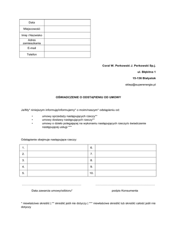Data Miejscowość Imię i Nazwisko Adres zamieszkania E-mail Telefon Coral W. Perkowski J. Perkowski Sp.j. ul. Błękitna 1 15-136 Białystok [email protected] OŚWIADCZENIE O ODSTĄPIENIU OD UMOWY Ja/My* niniejszym informuję/informujemy* o moim/naszym* odstąpieniu od: • • • umowy sprzedaży następujących rzeczy** umowy dostawy następujących rzeczy** umowy o dzieło polegającej na wykonaniu następujących rzeczy/o świadczenie następującej usługi *** Odstąpienie obejmuje następujące rzeczy: 1. 6. 2. 7. 3. 8. 4. 9. 5. 10. …………………………………………………… …………………………………………………… Data zawarcia umowy/odbioru* podpis Konsumenta * niewłaściwe skreślić | ** skreślić jeśli nie dotyczy | *** niewłaściwe skreślić lub skreślić całość jeśli nie dotyczy INFORMACJE DOTYCZĄCE KORZYSTANIA Z PRAWA ODSTĄPIENIA OD UMOWY Zgodnie z obowiązującym prawem, mają Państwo prawo odstąpić od niniejszej umowy w terminie 14 dni bez podania jakiejkolwiek przyczyny. Termin do odstąpienia od umowy wygasa po upływie 14 dni od dnia w którym weszli Państwo w posiadanie rzeczy lub w którym osoba trzecia inna niż przewoźnik i wskazana przez Państwa weszła w posiadanie rzeczy. Aby skorzystać z prawa odstąpienia od umowy, muszą Państwo poinformować nas (Coral W. Perkowski J. Perkowski Sp.j. ul. Błękitna 1, 15-136 Białystok) o swojej decyzji o odstąpieniu od niniejszej umowy w drodze jednoznacznego oświadczenia (na przykład pismo wysłane pocztą, faksem lub pocztą elektroniczną). Mogą Państwo skorzystać z wzoru formularza odstąpienia od umowy, jednak nie jest to obowiązkowe. Aby zachować termin do odstąpienia od umowy, wystarczy, aby wysłali Państwo informację dotyczącą wykonania przysługującego Państwu prawa odstąpienia od umowy przed upływem terminu do odstąpienia od umowy. W przypadku odstąpienia od niniejszej umowy zwracamy Państwu wszystkie otrzymane od Państwa płatności, w tym koszty dostarczenia, niezwłocznie, a w każdym przypadku nie później niż 14 dni od dnia, w którym zostaliśmy poinformowani o Państwa decyzji o wykonaniu prawa odstąpienia od niniejszej umowy. Zwrotu płatności dokonamy przy użyciu takich samych sposobów płatności, jakie zostały przez Państwa użyte w pierwotnej transakcji, chyba że wyraźnie zgodziliście się Państwo na inne rozwiązanie; w każdym przypadku nie poniosą Państwo żadnych opłat w związku z tym zwrotem. Możemy wstrzymać się ze zwrotem płatności do czasu otrzymania rzeczy lub do czasu dostarczenia nam dowodu jej odesłania, w zależności od tego, które zdarzenie nastąpi wcześniej. Proszę odesłać lub przekazać nam rzecz niezwłocznie, a w każdym razie nie później niż 14 dni od dnia, w którym poinformowali nas Państwo o odstąpieniu od niniejszej umowy. Termin jest zachowany, jeżeli odeślą Państwo rzecz przed upływem terminu 14 dni. Będą Państwo musieli ponieść bezpośrednie koszty zwrotu rzeczy. Odpowiadają Państwo tylko za zmniejszenie wartości rzeczy wynikające z korzystania z niej w sposób inny niż było to konieczne do stwierdzenia charakteru, cech i funkcjonowania rzeczy.