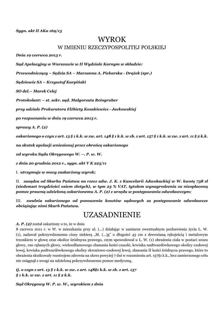 Sygn. akt II AKa 169/13 WYROK W IMIENIU RZECZYPOSPOLITEJ POLSKIEJ Dnia 19 czerwca 2013 r. Sąd Apelacyjny w Warszawie w II Wydziale Karnym w składzie: Przewodniczący – Sędzia SA – Marzanna A. Piekarska - Drążek (spr.) Sędziowie SA – Krzysztof Karpiński SO del.– Marek Celej Protokolant: – st. sekr. sąd. Małgorzata Reingruber przy udziale Prokuratora Elżbiety Kozakiewicz - Jackowskiej po rozpoznaniu w dniu 19 czerwca 2013 r. sprawy A. P. (2) oskarżonego o czyn z art. 13 § 1 k.k. w zw. art. 148 § 1 k.k. w zb. z art. 157 § 1 k.k. w zw. z art. 11 § 2 k.k. na skutek apelacji wniesionej przez obrońcę oskarżonego od wyroku Sądu Okręgowego W. –. P. w. W. z dnia 20 grudnia 2012 r., sygn. akt V K 225/11 I. utrzymuje w mocy zaskarżony wyrok; II. zasądza od Skarbu Państwa na rzecz adw. J. K. z Kancelarii Adwokackiej w W. kwotę 738 zł (siedemset trzydzieści osiem złotych), w tym 23 % VAT, tytułem wynagrodzenia za nieopłaconą pomoc prawną udzieloną oskarżonemu A. P. (2) z urzędu w postępowaniu odwoławczym; III. zwalnia oskarżonego od ponoszenia kosztów sądowych za postępowanie odwoławcze obciążając nimi Skarb Państwa. UZASADNIENIE A. P. (2) został oskarżony o to, że w dniu 8 czerwca 2011 r. w W. w mieszkaniu przy ul. (...) działając w zamiarze ewentualnym pozbawienia życia L. W. (1), zadawał pokrzywdzonemu ciosy siekierą „M. (...)g” o długości 43 cm z drewnianą rękojeścią i metalowym trzonkiem w głowę oraz okolice śródręcza prawego, czym spowodował u L. W. (1) obrażenia ciała w postaci urazu głowy, ran rąbanych głowy, wieloodłamowego złamania kości czaszki, krwiaka nadtwardówkowego okolicy czołowej lewej, krwiaka podtwardówkowego okolicy skroniowo-czołowej lewej, złamania II kości śródręcza prawego, które to obrażenia skutkowały rozstrojem zdrowia na okres powyżej 7 dni w rozumieniu art. 157§1 k.k., lecz zamierzonego celu nie osiągnął z uwagi na udzieloną pokrzywdzonemu pomoc medyczną, tj. o czyn z art. 13 § 1 k.k. w zw. z art. 148§1 k.k. w zb. z art. 157 § 1 k.k. w zw. z art. 11 § 2 k.k. Sąd Okręgowy W. P. w. W., wyrokiem z dnia 20 grudnia 2012 r. orzekł: I. A. P. (2) uznał za winnego tego, że w dniu 08 czerwca 2011 roku w mieszkaniu nr (...) przy ul. (...) w W., działając w zamiarze ewentualnym pozbawienia życia L. W. (1), zadał L. W. (1) przy użyciu siekiery nieustaloną liczbę ciosów w głowę oraz okolicę prawego śródręcza, czym spowodował u L. W. (1) obrażenia ciała w postaci urazu głowy, ran rąbanych głowy, wieloodłamowego złamania kości czaszki - złamania łuski kości skroniowej prawej, przedniej ściany zatoki czołowej prawej z wgłobieniem odłamów, przedniej i tylnej ściany zatoki czołowej lewej, przedniej ściany lewego oczodołu, kości nosowych z przemieszczeniem odłamów, a także krwiaka nadtwardówkowego okolicy czołowej lewej, krwiaka podtwardówkowego okolicy skroniowo-czołowej lewej oraz złamania II kości śródręcza prawego, które to obrażenia skutkowały rozstrojem zdrowia pokrzywdzonego na okres powyżej 7 dni w rozumieniu art. 157§1 k.k., lecz zamierzonego celu nie osiągnął z uwagi na udzieloną pokrzywdzonemu pomoc medyczną, co wyczerpuje dyspozycję art. 13§1 k.k. w zw. z art. 148§1 k.k. w zb. z art. .157§1 k.k. w zw. z art. 11 §2 k.k. i za przypisany czyn na podstawie art. 13§1 k.k. w zw. z art. 148§1 k.k. w zb. z art. 157§1 k.k. w zw. z art. 11 § 2 k.k. skazał, a na podstawie art. 14 § 1 k.k. w zw. z art. 148 § 1 k.k. w zw. z art. 11 § 3 k.k. wymierzył A. P. (2) karę 9 (dziewięciu) lat pozbawienia wolności; II. Na podstawie art. 63 § 1 k.k. na poczet orzeczonej kary pozbawienia wolności zaliczył oskarżonemu okres rzeczywistego pozbawienia wolności w sprawie od dnia 08 czerwca 2011 roku do dnia 20 grudnia 2012 roku; III. Na podstawie art. 44 § 2 k.k. orzekł przepadek dowodu rzeczowego w postaci siekiery, opisanego w wykazie dowodów rzeczowych na k. 380 pod poz. 1 (Drz. j (...)); IV. Zasądził od Skarbu Państwa na rzecz adw. J. (...) Kancelaria Adwokacka ul. (...) (...)(...) kwotę 1.992,60 złotych (jeden tysiąc dziewięćset dziewięćdziesiąt dwa złote sześćdziesiąt groszy) w tym kwotę 372,60 złotych (trzysta siedemdziesiąt dwa złote sześćdziesiąt groszy) podatku VAT tytułem udziału w sprawie obrońcy z urzędu; V. Na podstawie art 624§1 k.p.k. zwolnił oskarżonego w całości od zapłaty na rzecz Skarbu Państwa kosztów sądowych. Ponadto zwolnił oskarżonego w całości od kosztów sądowych i zasądził wynagrodzenie od Skarbu Państwa na rzecz obrońcy z urzędu. Apelację od powyższego wyroku wniósł obrońca oskarżonego, który zaskarżył orzeczenie w całości, na korzyść A. P. (2). Na podstawie art. 438 pkt 2 k.p.k. zarzucił obrazę przepisów postępowania karnego, mającą wpływ na treść rozstrzygnięcia, tj.: 1. art. 7 k.p.k. w zw. z art. 424 § 1 pkt 1 k.p.k. - poprzez dowolną ocenę dowodu w postaci wyjaśnień A. P. (2), wyrażającą się w uznaniu za wiarygodne wyłącznie tych wypowiedzi oskarżonego, w których potwierdza on ustalony stan faktyczny, z jednoczesnym brakiem dostatecznego wyjaśnienia, z jakiego powodu niewiarygodna jest wersja zdarzeń podana przez niego na dalszym etapie postępowania karnego, co doprowadziło do wadliwych ustaleń faktycznych co do przebiegu zdarzenia z 8 czerwca 2011 r., 2. art. 7 k.p.k. w zw. z art. 410 k.p.k. w zw. z art. 424 § 1 pkt 1 k.p.k. - poprzez pominięcie w uzasadnieniu skarżonego orzeczenia analizy tego fragmentu wyjaśnień oskarżonego, w którym wskazał, że Ł. D. (1) w trakcie zdarzenia co najmniej raz uderzył pokrzywdzonego (s. 3 protokołu rozprawy z 3 kwietnia 2012 r.), co rodzi wątpliwość w zakresie prawidłowości ustaleń, odnoszących się do udziału poszczególnych uczestników zdarzenia z 8 czerwca 2011 r., 3. art. 7 k.p.k. w zw. z art. 410 k.p.k. w zw. z art. 424 § 1 pkt 1 k.p.k