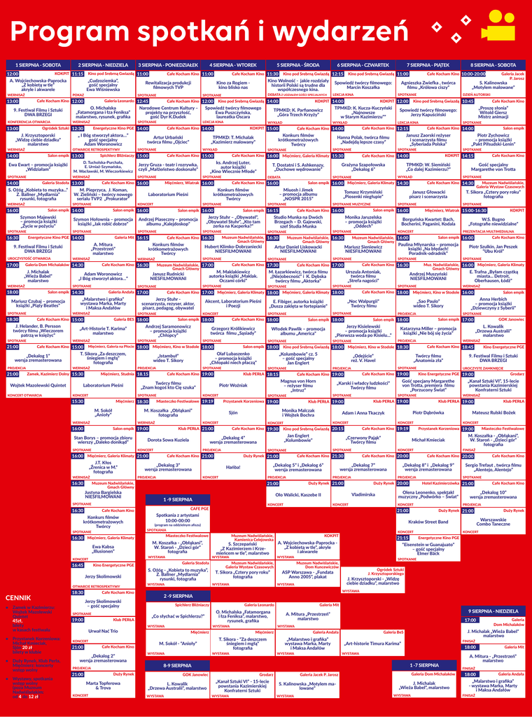 1 SIERPNIA - SOBOTA 2 SIERPNIA - NIEDZIELA 3 SIERPNIA - PONIEDZIAŁEK 4 SIERPNIA - WTOREK 5 SIERPNIA - ŚRODA 6 SIERPNIA - CZWARTEK 7 SIERPNIA - PIĄTEK 8 SIERPNIA - SOBOTA KOKPIT 11:15 Kino pod Srebrną Gwiazdą 11:00 Cafe Kocham Kino 11:00 Cafe Kocham Kino 11:30 Kino pod Srebrną Gwiazdą 12:15 Kino pod Srebrną Gwiazdą 11:00 Cafe Kocham Kino 10:00-20:00 Galeria Jacek 12:00 P. Jarosz A. Wojciechowska-Paprocka „Cudzoziemka”, Kino Wolność - jakie rozdziały Rewitalizacja produkcji Kino za Rogiem Spowiedź twórcy filmowego: Agnieszka Zwiefka , twórca S. Kalinowska „Z kobietą w tle” gość specjalny historii Polski są trudne dla filmowych TVP kino blisko nas Marcin Koszałka filmu „Królowa ciszy” „Motylem malowane” akryle i akwarele Ewa Wiśniewska współczesnego kina. WERNISAŻ POKAZ 13:00 SPOTKANIE Cafe Kocham Kino 12:00 9. Festiwal Filmu i Sztuki DWA BRZEGI KONFERENCJA OTWARCIA 13:00 O. Michalska „Fatamorgana i łza Feniksa” malarstwo, rysunek, grafika WERNISAŻ Ogródek Sztuki 12:30 J. Krzysztoporski „Widzę ciebie dziadku” malarstwo WERNISAŻ OTWARCIE RETROSPEKTYWY Salon empik 13:00 14:00 Ewa Ewart – promocja książki „Widziałam” SPOTKANIE Cafe Kocham Kino 12:00 Narodowe Centrum Kultury – projekty na przyszłość, gość Dyr K.Dudek Kino pod Srebrną Gwiazdą 14:00 Spowiedź twórcy filmowego Ewa Puszczyńska, laureatka Oscara SPOTKANIE Energetyczne Kino PGE 14:00 „ I Bóg stworzył aktora…” gość specjalny Adam Woronowicz DEBATA Z UDZIAŁEM GOŚCI SPECJALNYCH SPOTKANIE Galeria Leonardo 12:45 LEKCJA KINA Artur Urbański twórca filmu „Ojciec” SPOTKANIE Konkurs filmów krótkometrażowych Twórcy Jerzy Gruza - teatr i rozrywka, czyli „Małżeństwo doskonałe” WERNISAŻ SPOTKANIE ks. Andrzej Luter, autor książki „Kino Wiecznie Młode” SPOTKANIE SPOTKANIE SPOTKANIE Salon empik Piotr Zychowicz – promocja książki „Pakt Piłsudski-Lenin” SPOTKANIE Cafe Kocham Kino 14:00 KOKPIT 14:15 TPMKD: W. Siemiński „Co dalej Kazimierzu?” WYKŁAD SPOTKANIE DEBATA Cafe Kocham Kino „Proszę słonia” Witold Giersz Mistrz animacji Cafe Kocham Kino 14:00 Janusz Zaorski reżyser i scenarzysta filmu „Syberiada Polska” Grażyna Szapołowska „Dekalog 6” T. Dostatni i S. Ashkenazy, „Duchowe wędrowanie” SPOTKANIE LEKCJA KINA Cafe Kocham Kino 12:15 Mięćmierz, Galeria Klimaty 15:30 Cafe Kocham Kino 16:00 DZIEŃ AUTORSKI Kino pod Srebrną Gwiazdą 10:45 Spowiedź twórcy filmowego: Jerzy Kapuściński Hanna Polak, twórca filmu „Nadejdą lepsze czasy” SPOTKANIE Cafe Kocham Kino 15:00 D. Tucholska-Purchała, E. Urniaż-Szymańska, M. Wacławski, M. Wieczorkiewicz WYKŁAD Cafe Kocham Kino 14:00 KOKPIT 15:00 WYKŁAD Spichlerz Bliźniaczy 15:00 TPMKD: K. Parfianowicz „Góra Trzech Krzyży” TPMKD: T. Michalak „Kazimierz malowany” KOKPIT 12:00 TPMKD: K. Kucza-Kuczyński „Najnowsze w Starym Kazimierzu”” WYKŁAD Cafe Kocham Kino 14:00 SPOTKANIE LEKCJA KINA KOKPIT 14:00 Cafe Kocham Kino Gość specjalny Margarethe von Trotta SPOTKANIE Salon empik 16:00 Mięćmierz, Galeria Klimaty 14:30 Galeria Stodoła 13:00 Cafe Kocham Kino 16:00 Mięćmierz, Wiatrak 16:00 Cafe Kocham Kino 16:00 Cafe Kocham Kino 14:30 Muzeum Nadwiślańskie, 14:00 Galeria Wystaw Czasowych Miuosh i Jimek S. Ożóg „Kobieta to muzyka...” M. Pieprzyca, J. Koman, Konkurs filmów Janusz Głowacki T. Sikora „Cztery pory roku” Tomasz Krzymiński – promocja albumu Laboratorium Pieśni Z. Ballner „Mydlarnia” W. Zieliński – twórcy nowego krótkometrażowych pisarz i scenarzysta fotografia „Piosenki niegłupie” „NOSPR 2015” rysunki, fotografia serialu TVP2 „Prokurator” Twórcy WERNISAŻ SPOTKANIE 16:00 KONCERT Salon empik 14:00 Szymon Majewski – promocja książki „Życie w pożyciu” SPOTKANIE 16:30 Andrzej Piaseczny – promocja albumu „Kalejdoskop” SPOTKANIE SPOTKANIE A. Mitura „Przestrzeń” malarstwo UROCZYSTOŚĆ OTWARCIA J. Michalak „Wieża Babel” malarstwo WERNISAŻ Adam Woronowicz „I Bóg stworzył aktora…” Salon empik 14:30 Mariusz Czubaj – promocja książki „Piąty Beatles” SPOTKANIE SPOTKANIE „Malarstwo i grafika” wystawa Marka, Marty i Maksa Andałów WERNISAŻ Jerzy Stuhr scenarzysta, rezyser, aktor, pisarz, pedagog, obywatel SPOTKANIE Akcent, Laboratorium Pieśni i Poezji Urszula Antoniak, twórca filmu „Strefa nagości” KONCERT Mięćmierz, Galeria Klimaty E. Trafna „Byłam cząstką miasta... Detroit, Oberhausen, Łódź” WERNISAŻ Mięćmierz, Kino w Stodole 16:00 „Noc Walpurgii” Twórcy filmu „Sao Paulo” wideo T. Sikory SPOTKANIE SPOTKANIE SPOTKANIE Andrzej Muszyński NIESFILMOWANI Cafe Kocham Kino 18:00 Cafe Kocham Kino Piotr Szulkin, Jan Peszek “Ubu Król” Muz. Nadwiślańskie, 16:00 Gmach Główny SPOTKANIE Mięćmierz, Galeria Klimaty 18:00 E. Fibiger, autorka książki „Dusza zaklęta w fortepianie” PREZENTACJA MULTIMEDIALNA SPOTKANIE Cafe Kocham Kino 16:30 SPOTKANIE SPOTKANIE Mięćmierz, Galeria Klimaty 18:00 Mariusz Sieniewicz NIESFILMOWANI KOKPIT W.S. Bugno „Fotografie niewidzialne” Salon empik 16:00 Paulina Młynarska – promocja książki „Na błędach! Poradnik-odradnik” SPOTKANIE M. Łazarkiewicz, twórca filmu „(Nie)obecność” i K. Dębska twórcy filmu „Aktorka” SPOTKANIE Cafe Kocham Kino 17:00 KONCERT Muzeum Nadwiślańskie, 16:00 Gmach Główny Cafe Kocham Kino 17:00 Cafe Kocham Kino 17:30 M. Maklakiewicz autorka książki „Maklak. Oczami córki” SPOTKANIE Galeria Andała 17:00 Artur Daniel Liskowacki NIESFILMOWANI SPOTKANIE Muzeum Nadwiślańskie, 17:00 Gmach Główny Janusz Rudnicki NIESFILMOWANI Muzeum Nadwiślańskie, 16:30 Gmach Główny SPOTKANIE Mięćmierz, Wiatrak 15:00-16:30 Borguńska Kwartet: Bach, Bocherini, Paganini, Kodala SPOTKANIE SPOTKANIE Muzeum Nadwiślańskie, 16:30 Gmach Główny Salon empik 16:00 Monika Jaruzelska – promocja książki „Oddech” Studio Munka na Dwóch Brzegach – D. Ga