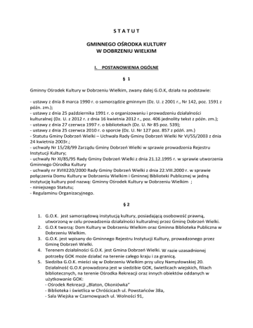STATUT GMINNEGO OŚRODKA KULTURY W DOBRZENIU WIELKIM I. POSTANOWIENIA OGÓLNE § 1 Gminny Ośrodek Kultury w Dobrzeniu Wielkim, zwany dalej G.O.K, działa na podstawie: - ustawy z dnia 8 marca 1990 r. o samorządzie gminnym (Dz. U. z 2001 r., Nr 142, poz. 1591 z późn. zm.); - ustawy z dnia 25 października 1991 r. o organizowaniu i prowadzeniu działalności kulturalnej (Dz. U. z 2012 r. z dnia 16 kwietnia 2012 r., poz. 406 jednolity tekst z późn. zm.); - ustawy z dnia 27 czerwca 1997 r. o bibliotekach (Dz. U. Nr 85 poz. 539); - ustawy z dnia 25 czerwca 2010 r. o sporcie (Dz. U. Nr 127 poz. 857 z późń. zm.) - Statutu Gminy Dobrzeń Wielki – Uchwała Rady Gminy Dobrzeń Wielki Nr VI/55/2003 z dnia 24 kwietnia 2003r.; - uchwały Nr 15/28/99 Zarządu Gminy Dobrzeń Wielki w sprawie prowadzenia Rejestru Instytucji Kultury; - uchwały Nr XI/85/95 Rady Gminy Dobrzeń Wielki z dnia 21.12.1995 r. w sprawie utworzenia Gminnego Ośrodka Kultury - uchwały nr XVIII220/2000 Rady Gminy Dobrzeń Wielki z dnia 22.VIII.2000 r. w sprawie połączenia Domu Kultury w Dobrzeniu Wielkim i Gminnej Biblioteki Publicznej w jedną instytucję kultury pod nazwą: Gminny Ośrodek Kultury w Dobrzeniu Wielkim ; - niniejszego Statutu; - Regulaminu Organizacyjnego. §2 1. G.O.K. jest samorządową instytucją kultury, posiadającą osobowość prawną, utworzoną w celu prowadzenia działalności kulturalnej przez Gminę Dobrzeń Wielki. 2. G.O.K tworzą: Dom Kultury w Dobrzeniu Wielkim oraz Gminna Biblioteka Publiczna w Dobrzeniu Wielkim. 3. G.O.K. jest wpisany do Gminnego Rejestru Instytucji Kultury, prowadzonego przez Gminę Dobrzeń Wielki. 4. Terenem działalności G.O.K. jest Gmina Dobrzeń Wielki. W razie uzasadnionej potrzeby GOK może działać na terenie całego kraju i za granicą. 5. Siedziba G.O.K. mieści się w Dobrzeniu Wielkim przy ulicy Namysłowskiej 20. Działalność G.O.K prowadzona jest w siedzibie GOK, świetlicach wiejskich, filiach bibliotecznych, na terenie Ośrodka Rekreacji oraz innych obiektów oddanych w użytkowanie GOK: - Ośrodek Rekreacji „Blaton, Okoniówka” - Biblioteka i świetlica w Chróścicach ul. Powstańców 38a, - Sala Wiejska w Czarnowąsach ul. Wolności 91, - Sala Wiejska w Krzanowicach ul. Armii Ludowej, - Sala Wiejska w Świerklach, - Sala Wiejska w Brzeziu ul. Wiejska 54, - Biblioteka w Kup ul 1 Maja 6. W celu prowadzenia działalności statutowej G.O.K. zarządza i administruje majątkiem przekazanym przez Gminę Dobrzeń Wielki. 7. Organizatorem G.O.K. jest Gmina Dobrzeń Wielki. 8. G.O.K. w Dobrzeniu Wielkim używa pieczęci podłużnej o treści : Gminny Ośrodek Kultury, 46-081 Dobrzeń Wielki ul. Namysłowska 20, NIP 754-16-84-290 II. CELE I ZADANIA §3 1. G.O.K. organizuje i prowadzi działalność kulturalną i rekreacyjną, sportową polegającą na tworzeniu, upowszechnianiu i ochronie kultury, której celem jest pozyskiwanie społeczeństwa do aktywnego uczestnictwa w kulturze oraz współtworzenia jej wartości a także służy zaspokojeniu i rozwijaniu potrzeb czytelniczych ludności i upowszechnianiu wiedzy jak również pozyskuje i przygotowuje społeczeństwo do aktywnego uczestnictwa w kulturze fizycznej poprzez rekreację i sport masowy. 2. G.O.K. realizuje działalność określoną w ust. 1 w szczególności poprzez współpracę z innymi instytucjami, organizacjami, stowarzyszeniami organizującymi i prowadzącymi działalność kulturalno – oświatowo – rekreacyjną i sportową. 3. W celu rozszerzenia swojej oferty programowej i pełniejszej realizacji zadań GOK może być członkiem stowarzyszeń i organizacji o charakterze społecznym i kulturalnym. §4 Do podstawowych zadań G.O.K. należy w szczególności: 1) prowadzenie edukacji kulturalnej dzieci i młodzieży; 2) popularyzacja i promocja twórczości artystycznej (teatralnej, filmowej, telewizyjnej; muzycznej i malarskiej); 3) prowadzenie kursów, przeglądów i konfrontacji amatorskiego ruchu artystycznego; 4) prowadzenie kół i sekcji zainteresowań dla dzieci, młodzieży i dorosłych (kluby); 5) prowadzenie działalności wydawniczej; 6) metodyka, instruktaż, szkolenia dla pracowników i amatorskiego ruchu artystycznego; 7) prowadzenie działalności edukacyjnej poprzez organizowanie kursów i szkoleń; 8) edukacja kulturalna i wychowanie przez sztukę; 9) gromadzenie, dokumentowanie, tworzenie, ochrona i udostępnianie dóbr kultury; 10) gromadzenie, opracowywanie materiałów bibliotecznych ze szczególnym uwzględnieniem materiałów dotyczących własnego regionu; 11) udostępnianie zbiorów bibliotecznych na miejscu, wypożyczanie do domu oraz prowadzenie wypożyczeń międzybibliotecznych; 12) gromadzenie i udostępnianie czasopism, wydawnictw i opracowań związanych z gminą i bezpośrednio dotyczących Gminy; 13) tworzenie warunków dla rozwoju amatorskiego ruchu artystycznego oraz zainteresowania wiedzą i sztuką; 14) tworzenie warunków dla rozwoju folkloru, a także rękodzieła ludowego i artystycznego; 15) rozpoznawanie, rozbudzanie i zaspokajanie potrzeb oraz zainteresowań kulturalnych; 16) promocja osiągnięć kulturalnych Gminy; 17) tworzenie warunków dla rozwoju działalności kulturalnej mniejszości narodowych; 18) programowanie i realizacja działań zakresie rekreacji, turystyki i sportu masowego przy ścisłym współdziałaniu z organizacjami sportowymi i turystycznymi; 19) prowadzenie działań aktywizujących rozwój turystyki na terenie Gminy; 20) współdziałanie z ościennymi gminami w zakresie wspólnych zamierzeń organizacyjnych na niwie rekreacji, turystyki i sportu; 21) promocja walorów turystycznych gminy oraz propagowanie agroturystyki; 22) organizacja imprez turystycznych związanych z turystyką pieszą, rowerową i wodną; 23) rozbudowa bazy rekreacyjnej i turystycznej Ośrodka Rekreacji; 24) organizacja i koordynowanie imprez rekreacyjno- sportowych na terenie Gminy. §5 Zadania wymienione w ust. 1 § 4 G.O.K. realizuje