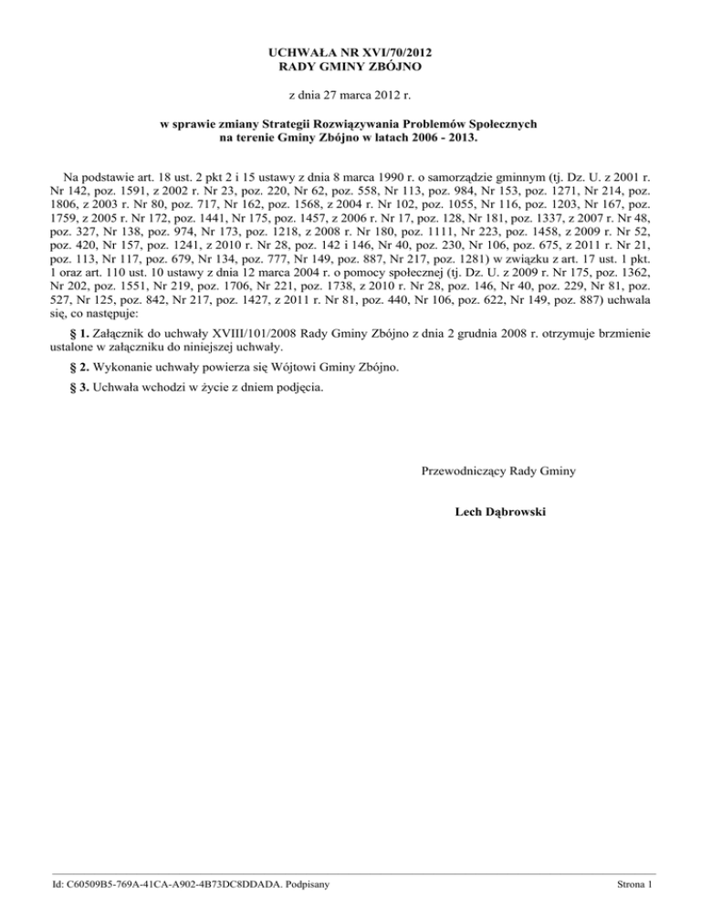 UCHWAŁA NR XVI/70/2012 RADY GMINY ZBÓJNO z dnia 27 marca 2012 r. w sprawie zmiany Strategii Rozwiązywania Problemów Społecznych na terenie Gminy Zbójno w latach 2006 - 2013. Na podstawie art. 18 ust. 2 pkt 2 i 15 ustawy z dnia 8 marca 1990 r. o samorządzie gminnym (tj. Dz. U. z 2001 r. Nr 142, poz. 1591, z 2002 r. Nr 23, poz. 220, Nr 62, poz. 558, Nr 113, poz. 984, Nr 153, poz. 1271, Nr 214, poz. 1806, z 2003 r. Nr 80, poz. 717, Nr 162, poz. 1568, z 2004 r. Nr 102, poz. 1055, Nr 116, poz. 1203, Nr 167, poz. 1759, z 2005 r. Nr 172, poz. 1441, Nr 175, poz. 1457, z 2006 r. Nr 17, poz. 128, Nr 181, poz. 1337, z 2007 r. Nr 48, poz. 327, Nr 138, poz. 974, Nr 173, poz. 1218, z 2008 r. Nr 180, poz. 1111, Nr 223, poz. 1458, z 2009 r. Nr 52, poz. 420, Nr 157, poz. 1241, z 2010 r. Nr 28, poz. 142 i 146, Nr 40, poz. 230, Nr 106, poz. 675, z 2011 r. Nr 21, poz. 113, Nr 117, poz. 679, Nr 134, poz. 777, Nr 149, poz. 887, Nr 217, poz. 1281) w związku z art. 17 ust. 1 pkt. 1 oraz art. 110 ust. 10 ustawy z dnia 12 marca 2004 r. o pomocy społecznej (tj. Dz. U. z 2009 r. Nr 175, poz. 1362, Nr 202, poz. 1551, Nr 219, poz. 1706, Nr 221, poz. 1738, z 2010 r. Nr 28, poz. 146, Nr 40, poz. 229, Nr 81, poz. 527, Nr 125, poz. 842, Nr 217, poz. 1427, z 2011 r. Nr 81, poz. 440, Nr 106, poz. 622, Nr 149, poz. 887) uchwala się, co następuje: § 1. Załącznik do uchwały XVIII/101/2008 Rady Gminy Zbójno z dnia 2 grudnia 2008 r. otrzymuje brzmienie ustalone w załączniku do niniejszej uchwały. § 2. Wykonanie uchwały powierza się Wójtowi Gminy Zbójno. § 3. Uchwała wchodzi w życie z dniem podjęcia. Przewodniczący Rady Gminy Lech Dąbrowski ————————————————————————————————————————————————————————— Id: C60509B5-769A-41CA-A902-4B73DC8DDADA. Podpisany Strona 1 Załącznik Nr 1 do Uchwały Nr XVI/70/2012 Rady Gminy Zbójno z dnia 27 marca 2012 r. STRATEGIA ROZWIĄZYWANIA PROBLEMÓW SPOŁECZNYCH NA TERENIE GMINY ZBÓJNO W LATACH 2006 - 2013 ————————————————————————————————————————————————————————— Id: C60509B5-769A-41CA-A902-4B73DC8DDADA. Podpisany Strona 1 SPIS TREŚCI: I. WPROWADZENIE .......................................................................................................................................5 II. METODOLOGIA OPRACOWANIA STRATEGII ROZWIĄZYWANIA PROBLEMÓW SPOŁECZNYCH NA TERENIE GMINY ZBÓJNO............................................................................6 1. Cel i proces tworzenia i aktualizacji Strategii Rozwiązywania Problemów Społecznych .............................................................................................................................................7 III. OBOWIĄZUJĄCE USTAWODASTWO................................................................................................12 IV. RAPORT O STANIE GMINY ZBÓJNO..................................................................................................21 1. POŁOŻENIE, POWIERZCHNIA, LUDNOŚĆ...................................................................................21 2. ŚRODOWISKO PRZYRODNICZE.....................................................................................................23 Krajobraz i powierzchnia ziemi..............................................................................................................23 Wody powierzchniowe oraz uwarunkowania ochrony środowiska......................................................24 Szata roślinna...........................................................................................................................................25 Surowce mineralne..................................................................................................................................26 Klimat.......................................................................................................................................................26 Instytucje użytku publicznego................................................................................................................27 Charakterystyka życia kulturalnego.......................................................................................................27 Stan bezpieczeństwa................................................................................................................................28 3. DZIEDZICTWO KULTUROWE .........................................................................................................29 3.1. Obiekty kultury sakralnej................................................................................................................29 3.2. Cmentarze.........................................................................................................................................29 3.3. Parki podworskie.............................................................................................................................29 3.4. Zabytki kultury materialnej.............................................................................................................30 4. TURYSTYKA........................................................................................................................................30 5. INFRASTRUKTURA TECHNICZNA................................................................................................30 Odprowadzanie i oczyszczanie ścieków................................................................................................30 Gospodarka odpadami.............................................................................................................................31 Sieć wodociągowa................................................................................................................................