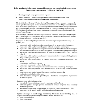 Informacja dodatkowa do skonsolidowanego sprawozdania finansowego Emitenta wg raportu za I półrocze 2007 rok. 1. Zasady przyjęte przy sporządzaniu raportu 1.1. Nazwa, siedziba i podstawowy przedmiot działalności Emitenta, oraz podstawowe segmenty działalności Grupy Kapitałowej. Mostostal Zabrze Holding S.A. jest Spółką Akcyjną powołaną w oparciu o przepisy Kodeksu spółek handlowych. Spółka została zarejestrowana w dniu 30 października 1992 roku w Sądzie Rejestrowym w Katowicach pod numerem RHB 8652 oraz pod numerem KRS:0000049844. Siedziba Emitenta mieści się w Zabrzu przy ulicy Wolności 191. Według klasyfikacji przyjętej przez rynek papierów wartościowych Spółka naleŜy do sektora budowlanego. Podstawowym zakresem działalności gospodarczej Emitenta, według Polskiej Klasyfikacji Działalności (PKD), jest dział 45 – wznoszenie kompletnych budowli lub ich części; inŜynieria lądowa i wodna (grupa 45.2). Wg zapisu w statucie Spółki przedmiotem działalności przedsiębiorstwa w kraju i za granicą jest: wykonanie robót ogólnobudowlanych związanych ze wznoszeniem budynków, wykonanie robót ogólnobudowlanych w zakresie obiektów mostowych, wykonanie robót ogólnobudowlanych w zakresie obiektów liniowych: rurociągów, linii elektroenergetycznych, elektrotrakcyjnych i telekomunikacyjno-przesyłowych, wykonanie robót ogólnobudowlanych w zakresie obiektów górniczych i produkcyjnych wykonanie robót ogólnobudowlanych w zakresie obiektów inŜynierskich, gdzie indziej niesklasyfikowanych, wykonanie robót budowlanych w zakresie montaŜu i wznoszenia budynków i budowli z elementów prefabrykowanych, wykonanie konstrukcji i pokryć dachowych, wykonanie robót budowlanych w zakresie wznoszenia konstrukcji stalowych, wykonanie specjalistycznych robót budowlanych, gdzie indziej niesklasyfikowanych, wynajem sprzętu budowlanego i burzącego z obsługą operatorską, produkcja konstrukcji metalowych inna działalność usługowa, produkcyjna i handlowa szczegółowo wymieniona w Statucie Spółki. Emitent moŜe w kraju i za granicą: prowadzić własne zakłady przemysłowe, usługowe i handlowe, zakładać spółki o kaŜdym profilu działalności, a takŜe nabywać akcje i udziały w innych spółkach, powoływać i prowadzić wyodrębnione terytorialnie i rzeczowo oddziały i filie, przystępować do innych spółek lub jednostek organizacyjnych. Spółki wchodzące w skład Grupy Kapitałowej Mostostal Zabrze Holding S.A. ze względu na rodzaj wykonywanej działalności moŜna podzielić na: • spółki konstrukcyjne, • spółki montaŜowe, 1 • spółki inŜynierskie. Przedmiotem działalności Grupy Kapitałowej jest: • realizacja specjalistycznych obiektów budowlanych, np. kompletnych zakładów i hal produkcyjnych, ciągów technologicznych, obiektów handlowych, obiektów specjalnego przeznaczenia, np. oczyszczalnie ścieków. • wykonawstwo konstrukcji maszynowych i technologicznych, np. Ŝurawi, suwnic, • projektowanie, wykonawstwo i montaŜ konstrukcji aluminiowych, np. szerokoasortymentowa stolarka drzwiowa i okienna, • projektowanie, wykonawstwo i montaŜ konstrukcji stalowych obiektów wysokich, np. maszty, wieŜe, • budowa i modernizacja mostów i wiaduktów, tuneli, przejść podziemnych, • budowa systemów wodociągowych i kanalizacyjnych, • usługi sprzętowe i transportowe, w tym szczególnie: dźwigowe, cięŜkiego sprzętu montaŜowego, ponadgabarytowego przewozu towarów. Spółka dominująca wraz ze spółkami Grupy Kapitałowej tworzą organizację gospodarczą zajmującą się kompleksową realizacją projektów „pod klucz” obiektów przemysłowych i uŜyteczności publicznej oraz ochrony środowiska, oferując teŜ specjalistyczne usługi budowlano-montaŜowe. Znaczącą część działalności Grupy Mostostalu Zabrze stanowią usługi budowlane w Generalnym Wykonawstwie Inwestycji (GWI). Przy realizacji kontraktów w GWI Mostostal Zabrze wykorzystuje potencjał spółek Grupy Kapitałowej. 1.2. Informacje dotyczące składu osobowego Zarządu oraz Rady Nadzorczej Emitenta. W skład Zarządu Spółki Mostostal Zabrze Holding S.A. na dzień 30.06.2007r. wchodzili: Wiceprezes Zarządu Jarosław Antoniak Wiceprezes Zarządu Maria Sanocka W dniu 22 lutego 2007 r. Rada Nadzorcza odwołała ze składu zarządu Pana Adama Konopkę (Prezesa Zarządu) oraz Pana Jarosława Grabca (Wiceprezesa Zarządu) i powołała na stanowisko Wiceprezesa Zarządu dotychczasowego Prokurenta Spółki Pana Jarosława Antoniaka. Z dniem 26 lutego 2007 r. Rada Nadzorcza Mostostalu Zabrze Holding S.A. oddelegowała na okres trzech miesięcy Pana Zbigniewa Opacha do pełnienia funkcji Prezesa Zarządu Mostostalu Zabrze Holding S.A. Na podstawie Uchwały Rady Nadzorczej Emitenta z dnia 21.08. 2007 roku powołany został z dniem 04.09.2007 r. na stanowisko Prezesa Zarządu Mostostalu Zabrze Holding S.A. Pan Leszek Juchniewicz. 2 W skład Rady Nadzorczej Spółki Mostostal Zabrze Holding S.A. na dzień 30.06.2007r. wchodzili: Przewodniczący Rady Nadzorczej - Zbigniew Opach Członek Rady Nadzorczej - Jarosław Chałas Członek Rady Nadzorczej - Janusz Olszewski Członek Rady Nadzorczej - Andrzej Tabor Członek Rady Nadzorczej - Grzegorz Wanot, Członek Rady Nadzorczej - Jan Duda. Pan Jan Duda został powołany na Członka Rady Nadzorczej Mostostalu Zabrze Holding S.A. przez Nadzwyczajne Walne Zgromadzenie Akcjonariuszy w dniu 11 kwietnia 2007 roku. 1.3. Stwierdzenie, czy sprawozdanie finansowe dotyczy pojedynczej jednostki gospodarczej, czy grupy kapitałowej. Prezentowane sprawozdanie jest skonsolidowanym sprawozdaniem grupy kapitałowej Mostostal Zabrze Holding S.A. w Zabrzu. 1.4. Wskazanie czasu trwania działalności Emitenta i Spółek Grupy Kapitałowej. Czas trwania Emitenta i Spółek Grupy kapitałowej jest nieoznaczony. 1.5. Wskazanie okresów, za które prezentowane jest skonsolidowane sprawozdanie finansowe i porównywaln