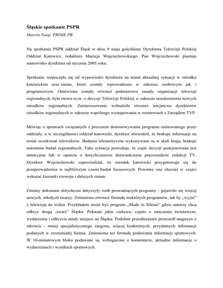 Śląskie spotkanie PSPR Marcin Tutaj, PRIME PR Na spotkaniu PSPR oddział Śląsk w dniu 9 maja gościliśmy Dyrektora Telewizji Polskiej Oddział Katowice, redaktora Macieja Wojciechowskiego. Pan Wojciechowski piastuje stanowisko dyrektora od stycznia 2005 roku. Spotkanie rozpoczęło się od wypowiedzi dyrektora na temat aktualnej sytuacji w ośrodku katowickim oraz zmian, które zostały wprowadzone w zakresie osobowym jak i programowym. Omówione zostały również podstawowe zasady organizacji telewizji regionalnych, była mowa m.in. o decyzji Telewizji Polskiej w zakresie uruchomienia nowych ośrodków regionalnych. Zainteresowanie wzbudziła również inicjatywa dyrektorów ośrodków regionalnych w zakresie wspólnego występowania w rozmowach z Zarządem TVP. Mówiąc o sprawach związanych z procesem dostosowywania programu emitowanego przez oddziały, a w szczególności oddział katowicki, dyrektor stwierdził, że brakuje informacji na temat oczekiwań telewidzów. Badania telemetryczne wykonywane są w skali kraju, brakuje natomiast badań regionalnych. Taka sytuacja powoduje, że część decyzji podejmowana jest intuicyjnie lub w oparciu o dotychczasowe doświadczenie pracowników redakcji TV. Dyrektor Wojciechowski zapowiedział, że ośrodek katowicki przygotowuje się do przeprowadzenia w najbliższym czasie badań focusowych. Powinny one chociaż w części wskazać kierunki rozwoju i dalszych zmian. Zmiany dokonane dotychczas dotyczyły osób prowadzących programy - pojawiło się więcej nowych, młodych twarzy. Zmieniono również formułę niektórych programów, tak by „wyjść” z telewizją do widza. Przykładem może być program „Made in Silesia” gdzie autorzy chcą odkryć drugą „twarz” Śląska. Pokazać jakie ciekawe, często o znaczeniu światowym, wydarzenia i odkrycia miały miejsce na Śląsku. Podobne przeobrażenie przeszedł magazyn o zdrowiu - mniej specjalistycznego żargonu, więcej konkretnych, przydatnych informacji podanych w zrozumiałej formie. Zmieniono też formułę podawania informacji sportowych. W 10-minutowym bloku podawane są, wzbogacone o komentarze, aktualne informacje o wydarzeniach i wynikach sportowych. Dalsza dyskusja dotyczyła możliwości i szans na zmianę wizerunku telewizji regionalnej - w tym wypadku programu nadawanego z Katowic. Większość członków PSPR zgodziła się z opinią, że w samej telewizji tkwi potężny potencjał „publicity” i możliwości współpracy, szczególnie z innymi mediami. Podano przykład, jak zmiany w kierownictwie i programie przyczyniły się do zainteresowania wykazanego przez inne media. Wspomniano również o konieczności poszukiwania niszy wśród oferty programowej innych stacji. Sposobem na to może być „regionalność”, ale realizowana nie poprzez ograniczanie tematyki, tylko patrzenie na większość spraw przez pryzmat regionu - jego problemów i pojawiających się szans. Istotne jest również dotarcie z ofertą programową do młodego pokolenia. W tych działaniach niezbędny może okazać się Internet (sugerowano zmianę strony www telewizji Katowice i wprowadzenie newslettera). Medium to powinno uzupełniać treści przekazywane w codziennym przekazie telewizyjnym. Dużym wyzwaniem dla Telewizji Katowice jest ujęcie w ramy programowe różnorodności województwa śląskiego (blisko 5 mln mieszkańców, kilka dużych miast, występujące różnice kulturowe i gospodarcze). W dyskusji pojawił się również wątek komunikatów reklamowych nadawanych przez stacje regionalne. Specjaliści od komunikacji bardzo nisko ocenili jakość tych elementów, które znacząco wpływają na wizerunek programu. Redaktor Wojciechowski stwierdził, że jako zleceniobiorca, telewizja ma bardzo ograniczony wpływ na treść i kształt emitowanej reklamy. Zgodził się, że warto rozmawiać na temat poprawienia tego typu przekazów, jednak jest to trudne i wymaga raczej przekonania zleceniodawców - firm do większej dbałości o przygotowywane materiały. Uwagi przekazywane przez specjalistów PR spotkały się z zainteresowaniem ze strony dyrektora. Trudno powiedzieć które i kiedy zostaną wykorzystane. Najważniejsze, że Pan Wojciechowski wykazał się otwartością, chęcią słuchania i wymiany poglądów, co nadal nie jest standardem w środowisku mediów, szczególnie regionalnych i lokalnych. Spotkanie pokazało, że możliwy jest dialog i współpraca ludzi mediów i public relations. Wartość takich relacji jest nie do przecenienia. Na efekty trzeba będzie poczekać, ale na pewno warto.