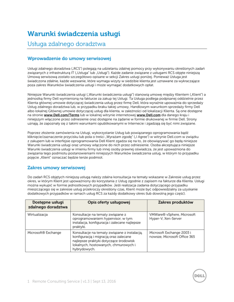 Warunki świadczenia usługi Usługa zdalnego doradztwa Wprowadzenie do umowy serwisowej Usługi zdalnego doradztwa („RCS”) polegają na udzielaniu zdalnej pomocy przy wykonywaniu określonych zadań związanych z infrastrukturą IT („Usługa” lub „Usługi”). Każde zadanie związane z usługami RCS objęte niniejszą Umową serwisową zostało szczegółowo opisane w sekcji Zakres usługi poniżej. Ponieważ Usługa jest świadczona zdalnie, każde wezwanie, które wymaga wizyty w siedzibie klienta jest uznawane za wykraczające poza zakres Warunków świadczenia usługi i może wymagać dodatkowych opłat. Niniejsze Warunki świadczenia usługi („Warunki świadczenia usługi”) stanowią umowę między Klientem („Klient”) a jednostką firmy Dell wymienioną na fakturze za zakup tej Usługi. Ta Usługa podlega podpisanej oddzielnie przez Klienta głównej umowie dotyczącej świadczenia usług przez firmę Dell, która wyraźnie upoważnia do sprzedaży Usług zdalnego doradztwa lub, w przypadku braku takiej umowy, Handlowym warunkom sprzedaży firmy Dell albo lokalnej Głównej umowie dotyczącej usług dla klienta, w zależności od lokalizacji Klienta. Są one dostępne na stronie www.Dell.com/Terms lub w lokalnej witrynie internetowej www.Dell.com dla danego kraju i niniejszym włączone przez odniesienie oraz dostępne na żądanie w formie drukowanej w firmie Dell. Strony uznają, że zapoznały się z takimi warunkami opublikowanymi w Internecie i zgadzają się być nimi związane. Poprzez złożenie zamówienia na Usługi, wykorzystanie Usług lub powiązanego oprogramowania bądź kliknięcie/zaznaczenie przycisku lub pola o treści „Wyrażam zgodę” („I Agree”) w witrynie Dell.com w związku z zakupem lub w interfejsie oprogramowania Dell Klient zgadza się na to, że obowiązywać go będą niniejsze Warunki świadczenia usługi oraz umowy włączone do nich przez odniesienie. Osoba akceptująca niniejsze Warunki świadczenia usługi w imieniu firmy lub innej osoby prawnej oświadcza, że jest upoważniona do związania tego podmiotu postanowieniami niniejszych Warunków świadczenia usług, w którym to przypadku pojęcie „Klient” oznaczać będzie tenże podmiot. Zakres umowy serwisowej Do zadań RCS objętych niniejszą usługą należy zdalna konsultacja na tematy wskazane w Zakresie usług przez okres, w którym Klient jest upoważniony do korzystania z Usług zgodnie z zapisem na fakturze dla Klienta. Usługi można wykupić w formie jednostkowych przypadków. Jeśli realizacja zadania dotyczącego przypadku mieszczącego się w zakresie usług przekroczy określony czas, Klient może być odpowiedzialny za uzyskanie dodatkowych przypadków w ramach usług RCS za każdy dodatkowy okres (lub dowolną jego część). Dostępne usługi zdalnego doradztwa Opis oferty usługowej Zakres produktów Wirtualizacja Konsultacje na tematy związane z oprogramowaniem hypervisor, w tym instalacja, konfiguracja i zalecane najlepsze praktyki. VMWare® vSphere, Microsoft Hyper-V, Xen-Server Microsoft® Exchange Konsultacje na tematy związane z instalacją, konfiguracją i migracją oraz zalecane najlepsze praktyki dotyczące środowisk lokalnych, hostowanych, chmurowych i hybrydowych. Microsoft Exchange 2003 i nowsze, Microsoft Office 365 1 Remote Consulting Service | v1.3 | Sept 13, 2016 Zarządzanie systemami Konsultacje na tematy związane z aplikacjami do zarządzania systemami, w tym instalacja, konfiguracja i zalecane najlepsze praktyki. Dell Management Plug-In for VMware vCenter, Dell OpenManage Essentials i Dell SupportAssist, Microsoft SQL Server 2005 lub nowszy, Office 365, Microsoft System Center Operations Manager Ciągłość biznesowa i odzyskiwanie po awarii (Business Continuity Disaster Recovery, BCDR) oraz ochrona i odzyskiwanie danych (Data Protection and Recovery, DPR) Konsultacje na tematy dotyczące rozwiązań służących do ochrony danych oraz zalecenia dotyczące odzyskiwania sprawności systemów w lokalizacji Klienta, które mogą obejmować zdalną pomoc w zakresie oceny środowiska, instalacji, konfiguracji oraz zalecenia dotyczące najlepszych praktyk w zakresie środowisk lokalnych, hostowanych, chmurowych i hybrydowych. Microsoft Azure (OMS/ASR) Technologie serwerów i pamięci masowej Konsultacje na tematy związane z instalacją i konfiguracją oraz zalecenia dotyczące najlepszych praktyk, które mogą obejmować pomoc w następującym zakresie: • Zmiany konfiguracji VRTX • Modyfikacja oprogramowania sieci SAN na hostach połączonych z siecią SAN • Konfiguracja replikacji na urządzeniu Dell Storage z serii PS (nie obejmuje tunelu sieciowego do komunikacji iSCSI między lokalizacjami) • Konfiguracja ASM/SNAP urządzenia Dell Storage z serii PS • Modyfikacja oprogramowania pakietu Host Integration Tool Kit (HIT Kit) urządzenia Dell Storage z serii PS • Konfiguracja elastycznego importu i testowa migracja (bloku do 500 Gb) do urządzenia z serii SC z urządzenia z serii SC lub PS. (Zakres ograniczony do środowisk Windows i VMware) • Tematy związane z FC i iSCSI • Inne czynności uzgodnione przez firmę Dell i Klienta Urządzenia Dell Storage, w tym: M1000e, FX2, VRTX, seria Dell SC, macierz z serii Dell PS, dodatkowe obudowy macierzy dyskowej (Disk Array Enclosure, DAE) rozwiązania i urządzenia SAN z serii Dell MD 2 Remote Consulting Service | v1.3 | Sept 13, 2016 Bramka i zabezpieczenia, łączność bezprzewodowa, warstwa dostępowa, dystrybucyjna i rdzeniowa/MPLS i łączność w sieci Storage Area Network (SAN) Konsultacje na tematy związane z instalacją i konfiguracją oraz zalecenia dotyczące najlepszych praktyk, które mogą obejmować pomoc w następującym zakresie: • Zmiany w konfiguracji/reinstalacja przełącznika • Konfiguracja protokołu Spanning Tree (STP) • Konfiguracja protokołu IPSec w sieci VPN • Konfiguracja translacji adresów sieciowych • Systemy uniwersalnego zar