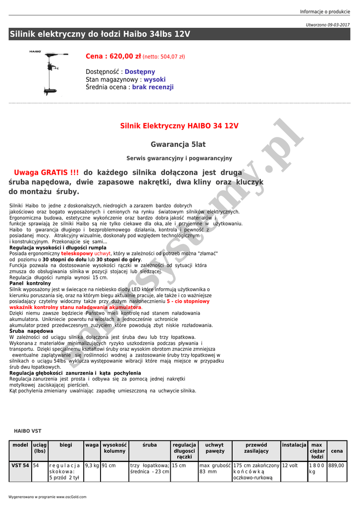 Informacje o produkcie Utworzono 09-03-2017 Silinik elektryczny do łodzi Haibo 34lbs 12V Cena : 620,00 zł (netto: 504,07 zł) Dostępność : Dostępny Stan magazynowy : wysoki Średnia ocena : brak recenzji y. p Gwarancja 5lat l Silnik Elektryczny HAIBO 34 12V Serwis gwarancyjny i pogwarancyjny te m Uwaga GRATIS !!! do każdego silnika dołączona jest druga śruba napędowa, dwie zapasowe nakrętki, dwa kliny oraz kluczyk do montażu śruby. so la rs ys Silniki Haibo to jedne z doskonalszych, niedrogich a zarazem bardzo dobrych jakościowo oraz bogato wyposażonych i cenionych na rynku światowym silników elektrycznych. Ergonomiczna budowa, estetyczne wykończenie oraz bardzo dobra jakość materiałów i funkcje sprawiają że silniki Haibo są nie tylko ciekawe dla oka, ale i przyjemne w użytkowaniu. Haibo to gwarancja długiego i bezproblemowego działania, kontrola i pewność z posiadanej mocy. Atrakcyjny wizualnie, doskonały pod względem technologicznym i konstrukcyjnym. Przekonajcie się sami... Regulacja wysokości i długości rumpla Posiada ergonomiczny teleskopowy uchwyt, który w zależności od potrzeb można "złamać" od poziomu o 30 stopni do dołu lub 30 stopni do góry. Funckja pozwala na dostosowanie wysokości rączki w zależności od sytuacji która zmusza do obsługiwania silnika w pozycji stojacej lub siedzącej. Regulacja długości rumpla wynosi 15 cm. Panel kontrolny Silnik wyposażony jest w świecące na niebiesko diody LED które informują użytkownika o kierunku poruszania się, oraz na którym biegu aktualnie pracuje, ale także i co ważniejsze posiadający czytelny widoczny także przy dużym nasłonecznieniu 5 - cio stopniowy wskaźnik kontrolny stanu naładowania akumulatora. Dzięki niemu zawsze będziecie Państwo mieli kontrolę nad stanem naładowania akumulatora. Unikniecie powrotu na wiosłach a jednocześnie uchronicie akumulator przed przedwczesnym zużyciem które powodują zbyt niskie rozładowania. Śruba napędowa W zależności od uciągu silnika dołączona jest śruba dwu lub trzy łopatkowa. Wykonana z materiałów minimalizujących ryzyko uszkodzenia podczas pływania i transportu. Dzięki specjalnemu kształtowi śruby oraz wysokim obrotom znacznie zmniejsza ewentualne zaplątywanie się roślinności wodnej a zastosowanie śruby trzy łopatkowej w silnikach o uciągu 54lbs wyklucza występowanie wibracji które mają miejsce w przypadku śrub dwu łopatkowych. Regulacja głębokości zanurzenia i kąta pochylenia Regulacja zanurzenia jest prosta i odbywa się za pomocą jednej nakrętki motylkowej zaciskającej pierścień. Kąt pochylenia zmieniany uwalniając zapadkę umieszczoną na uchwycie silnika. HAIBO VST model uciąg (lbs) VST 54 54 biegi regulacja skokowa: 5 przód 2 tył waga wysokość kolumny 9,3 kg 91 cm Wygenerowano w programie www.oscGold.com śruba regulacja długosci rączki trzy łopatkowa; 15 cm średnica - 23 cm uchwyt pawęży przewód zasilający instalacja max ciężar łodzi max grubość 175 cm zakończony 12 volt 83 mm końcówką oczkowo-rurkową cena 1 8 0 0 889,00 kg regulacja skokowa: 5 przód 2 tył 9,3 kg 91 cm trzy łopatkowa; 15 cm średnica - 23 cm max grubość 175 cm zakończony 12 volt 83 mm końcówką oczkowo-rurkową 1 2 0 0 750,00 kg VST 34 34 regulacja skokowa: 5 przód 2 tył 7 kg 78 cm dwu łopatkowa; 15 cm średnica - 23 cm max grubość 135 cm zakończony 12 volt - 58 mm końcówką typu "krokodylek" 1 0 0 0 635,00 kg VST 30 30 regulacja skokowa: 5 przód 2 tył - - - - - - 12 volt - - VST 65 65 regulacja skokowa: 5 przód 2 tył - - - - - - 24 volt - - VST 80 80 regulacja skokowa: 5 przód 2 tył - - - - - - 24 volt - - regulacja skokowa: 5 przód 2 tył - - - - - - 36 volt - - 110 y. p VST 110 l VST 44 44 W skład zestawu wchodzą: ● silnik z przewodami zasilającymi o dł. 135 cm - 175 cm zakończonymi końcówkami elektrycznymi oczkowo - rurkowymi (fi 10 mm lub zaciskami) dwie śruby napędowe dwa kliny śruby ● dwie nakrętki śruby ● instrukcja obsługi w j. polskim z kartą gwarancyjną ● dokument zakupu so la rs ys ● te m ●