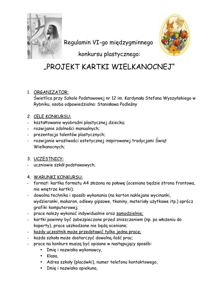 Regulamin VI-go międzygminnego konkursu plastycznego: „PROJEKT KARTKI WIELKANOCNEJ“ 1. ORGANIZATOR: Świetlica przy Szkole Podstawowej nr 12 im. Kardynała Stefana Wyszyńskiego w Rybniku, osoba odpowiedzialna: Stanisława Podleśny 2. - CELE KONKURSU: kształtowanie wyobraźni plastycznej dziecka; rozwijanie zdolności manualnych; prezentacja talentów plastycznych; rozwijanie wrażliwości estetycznej inspirowanej tradycjami Świąt Wielkanocnych; 3. UCZESTNICY: - uczniowie szkół podstawowych; 4. WARUNKI KONKURSU: - format: kartka formatu A4 złożona na połowę (oceniana będzie strona frontowa, nie wnętrze kartki); - dowolna technika i sposób wykonania (na karton naklejane wycinanki, wydzieranki, makaron, odlewy gipsowe, tkaniny, materiały użytkowe itp.) oprócz grafiki komputerowej; - prace należy wykonać indywidualnie oraz samodzielnie; - kartki powinny być zabezpieczone przed zniszczeniem (np. po włożeniu do koperty), prace uszkodzone nie będą oceniane; - każdy uczestnik może przedstawić tylko jedną pracę; - każda szkoła może dostarczyć dowolną ilość prac; - prace na konkurs muszą być opisane w następujący sposób: Imię i nazwisko wykonawcy, Klasa, Adres szkoły (placówki), numer telefonu kontaktowego, Imię i nazwisko opiekuna, Opis powinien znajdować się na osobnej karteczce dołączonej na stałe do pracy. 5. TERMINY: - prace należy dostarczyć do 23.03.2016r (środa) do świetlicy Szkoły Podstawowej nr 12 w godzinach od 7:00-16:00, lub przesłać na adres szkoły (ul. Buhla 3, 44-217 Rybnik – organizator nie zwraca kosztów przesyłki) - rozdanie nagród i dyplomów odbędzie się po przerwie świątecznej. O wynikach konkursu i terminie rozdania agród laureaci zostaną powiadomieni telefonicznie. Wyniki zostaną umieszczone również na stronie internetowej szkoły w zakładce świetlica. 6. OCENA PRAC: 1) kryteria oceny: - nawiązanie do tradycji Świąt Wielkanocnych; - pomysłowość i orginalność prac; - samodzielność; - estetyka wykonania; - wrażenie artystyczne; 2) nagrody i dyplomy zostaną przyznane w dwóch kategoriach: - uczniowie klas I-III; - uczniowie klas IV-VI; 7. WYSTAWA PRAC: najciekawsze prace zostaną zamieszczone na wystawie pokonkursowej w Szkole Podstawowej nr 12 na dolnym korytarzu 8. UWAGI: - udział w konkursie jest jednoznaczny z akceptacją regulaminu; - prace niezgodne z regulaminem lub oddane po terminie nie będą oceniane; - prace konkursowe przechodzą na własność Szkoły Podstawowej nr 12 w Rybniku; - organizator zastrzega sobie prawo do publikowania i prezentacji prac konkursowych bez wypłacania honorarium autorowi; - uczestnictwo w konkursie jest jednocześnie zgodą na publikację pracy oraz wizerunku na stronie internetowej świetlicy; - dodatkowych informacji udziela Stanisława Podleśny (nr tel.: 0502637181)