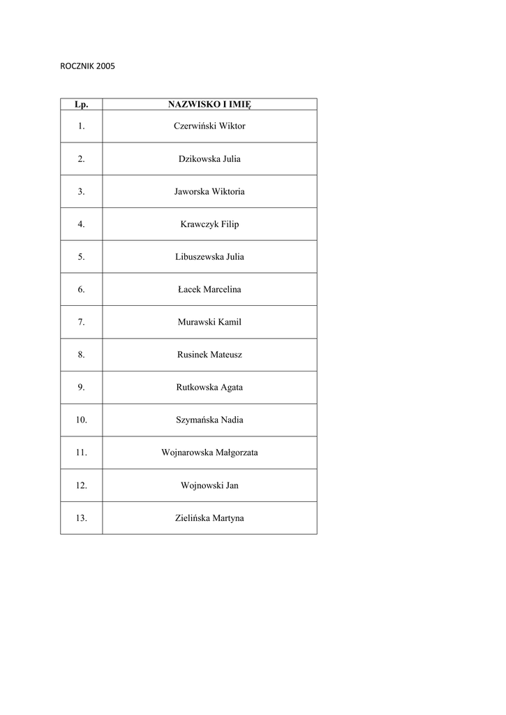 ROCZNIK 2005 Lp. NAZWISKO I IMIĘ 1. Czerwiński Wiktor 2. Dzikowska Julia 3. Jaworska Wiktoria 4. Krawczyk Filip 5. Libuszewska Julia 6. Łacek Marcelina 7. Murawski Kamil 8. Rusinek Mateusz 9. Rutkowska Agata 10. Szymańska Nadia 11. Wojnarowska Małgorzata 12. Wojnowski Jan 13. Zielińska Martyna