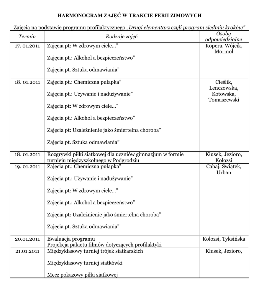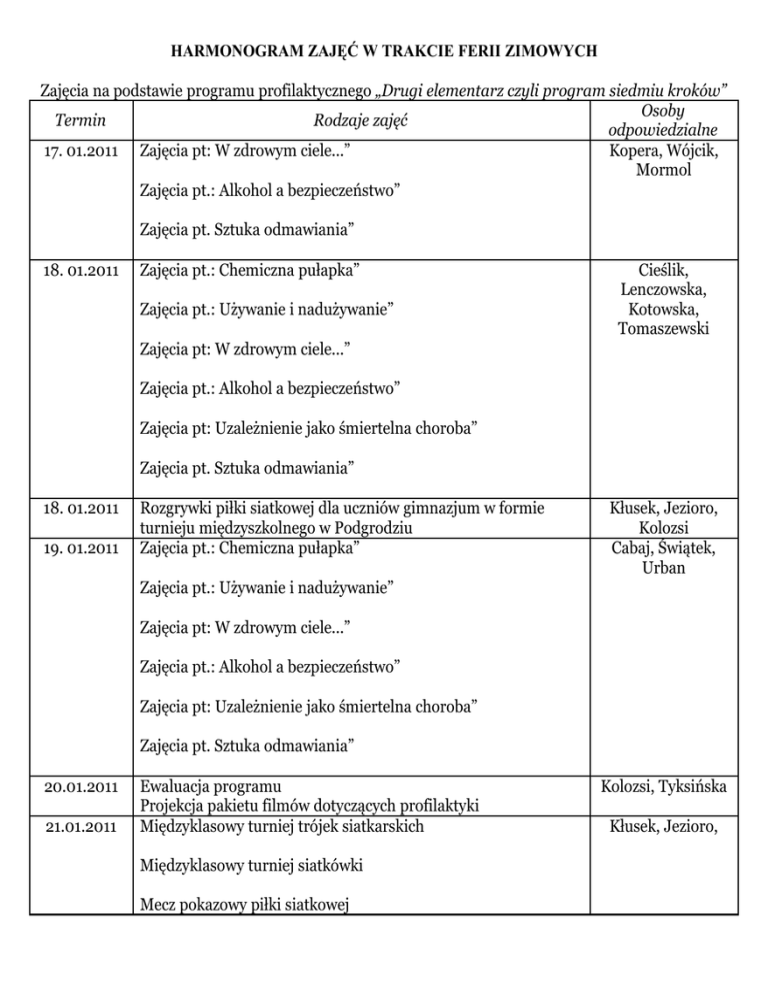 HARMONOGRAM ZAJĘĆ W TRAKCIE FERII ZIMOWYCH Zajęcia na podstawie programu profilaktycznego „Drugi elementarz czyli program siedmiu kroków” Osoby Termin Rodzaje zajęć odpowiedzialne 17. 01.2011 Zajęcia pt: W zdrowym ciele...” Kopera, Wójcik, Mormol Zajęcia pt.: Alkohol a bezpieczeństwo” Zajęcia pt. Sztuka odmawiania” 18. 01.2011 Zajęcia pt.: Chemiczna pułapka” Zajęcia pt.: Używanie i nadużywanie” Cieślik, Lenczowska, Kotowska, Tomaszewski Zajęcia pt: W zdrowym ciele...” Zajęcia pt.: Alkohol a bezpieczeństwo” Zajęcia pt: Uzależnienie jako śmiertelna choroba” Zajęcia pt. Sztuka odmawiania” 18. 01.2011 19. 01.2011 Rozgrywki piłki siatkowej dla uczniów gimnazjum w formie turnieju międzyszkolnego w Podgrodziu Zajęcia pt.: Chemiczna pułapka” Kłusek, Jezioro, Kolozsi Cabaj, Świątek, Urban Zajęcia pt.: Używanie i nadużywanie” Zajęcia pt: W zdrowym ciele...” Zajęcia pt.: Alkohol a bezpieczeństwo” Zajęcia pt: Uzależnienie jako śmiertelna choroba” Zajęcia pt. Sztuka odmawiania” 20.01.2011 21.01.2011 Ewaluacja programu Projekcja pakietu filmów dotyczących profilaktyki Międzyklasowy turniej trójek siatkarskich Międzyklasowy turniej siatkówki Mecz pokazowy piłki siatkowej Kolozsi, Tyksińska Kłusek, Jezioro,