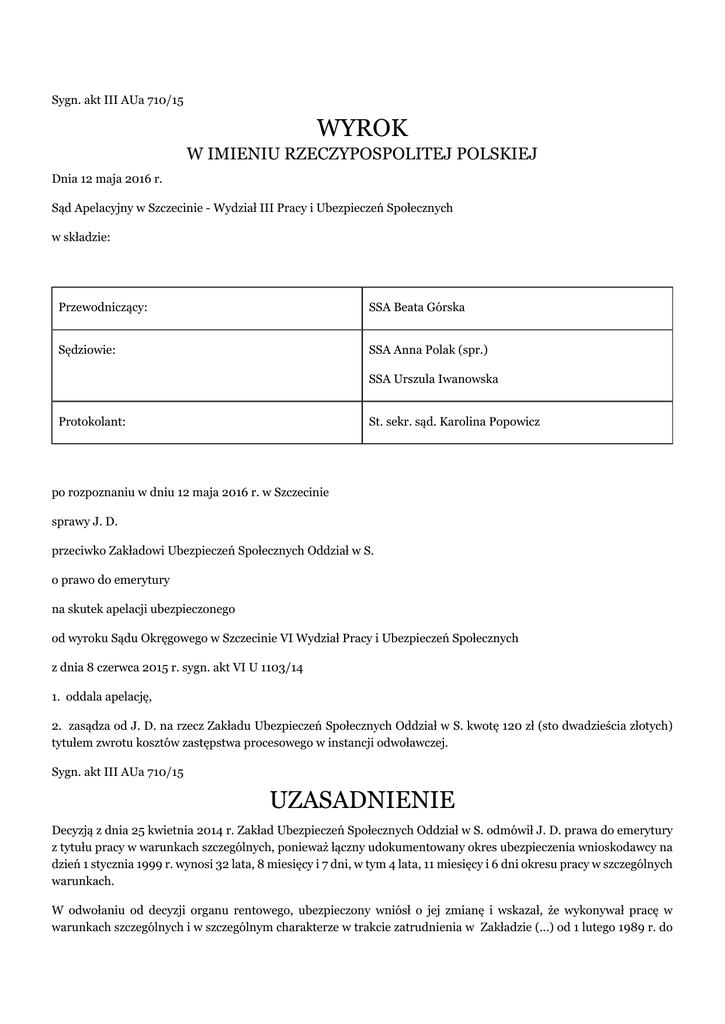 Sygn. akt III AUa 710/15 WYROK W IMIENIU RZECZYPOSPOLITEJ POLSKIEJ Dnia 12 maja 2016 r. Sąd Apelacyjny w Szczecinie - Wydział III Pracy i Ubezpieczeń Społecznych w składzie: Przewodniczący: SSA Beata Górska Sędziowie: SSA Anna Polak (spr.) SSA Urszula Iwanowska Protokolant: St. sekr. sąd. Karolina Popowicz po rozpoznaniu w dniu 12 maja 2016 r. w Szczecinie sprawy J. D. przeciwko Zakładowi Ubezpieczeń Społecznych Oddział w S. o prawo do emerytury na skutek apelacji ubezpieczonego od wyroku Sądu Okręgowego w Szczecinie VI Wydział Pracy i Ubezpieczeń Społecznych z dnia 8 czerwca 2015 r. sygn. akt VI U 1103/14 1. oddala apelację, 2. zasądza od J. D. na rzecz Zakładu Ubezpieczeń Społecznych Oddział w S. kwotę 120 zł (sto dwadzieścia złotych) tytułem zwrotu kosztów zastępstwa procesowego w instancji odwoławczej. Sygn. akt III AUa 710/15 UZASADNIENIE Decyzją z dnia 25 kwietnia 2014 r. Zakład Ubezpieczeń Społecznych Oddział w S. odmówił J. D. prawa do emerytury z tytułu pracy w warunkach szczególnych, ponieważ łączny udokumentowany okres ubezpieczenia wnioskodawcy na dzień 1 stycznia 1999 r. wynosi 32 lata, 8 miesięcy i 7 dni, w tym 4 lata, 11 miesięcy i 6 dni okresu pracy w szczególnych warunkach. W odwołaniu od decyzji organu rentowego, ubezpieczony wniósł o jej zmianę i wskazał, że wykonywał pracę w warunkach szczególnych i w szczególnym charakterze w trakcie zatrudnienia w Zakładzie (...) od 1 lutego 1989 r. do 29 listopada 1991 r. na stanowisku ślusarz – spawacz (2 lata, 9 miesięcy i 29 dni) oraz w (...) Spółka z o.o. od 1 sierpnia 1992 r. do 31 sierpnia 1993 r. (1 rok i 1 miesiąc). W odpowiedzi na odwołanie organ rentowy wniósł o jego oddalenie w całości, podtrzymując argumentację, jak w zaskarżonej decyzji. Wyrokiem z dnia 8 czerwca 2015 r. Sąd Okręgowy w Szczecinie VI Wydział Pracy i Ubezpieczeń Społecznych oddalił odwołanie J. D.. Swoje rozstrzygnięcie Sąd I instancji oparł na następujących ustaleniach faktycznych i rozważaniach prawnych. J. D., urodzony (...), nie był członkiem OFE. Na dzień 1 stycznia 1999 r. udowodnił 32 lata 8 miesięcy i 7 dni okresów ubezpieczenia, w tym 32 lata 4 miesiące i 4 dni okresów składkowych oraz 4 miesiące i 3 dni okresów nieskładkowych. Od 25 czerwca 2009 r. ubezpieczony korzysta z prawa do świadczenia przedemerytalnego. Decyzją z dnia 3 stycznia 2012 r. Zakład Ubezpieczeń Społecznych Oddział w S., po rozpoznaniu wniosku z dnia 10 listopada 2011 r., odmówił J. D. prawa do emerytury po osiągnięciu 60 roku życia z uwagi na nieudowodnienie przez niego okresu 15 lat pracy w szczególnych warunkach lub szczególnym charakterze. W uzasadnieniu organ rentowy wskazał, iż łączny udokumentowany okres ubezpieczenia wnioskodawcy na dzień 1 stycznia 1999 r. wynosi 32 lata, 8 miesięcy i 7 dni, w tym 4 lata, 11 miesięcy i 6 dni okresu pracy w szczególnych warunkach z tytułu zatrudnienia w Stoczni (...) S.A. od 24 września 1993 r. do 31 grudnia 1998 r. jako monter kadłubów okrętowych. Składając odwołanie od powyższej decyzji wnioskodawca wskazał, iż zgodnie z dostarczonymi przez niego świadectwami pracy pracował w szczególnych warunkach i w szczególnym charakterze w (...) klasy w okresie od 1 sierpnia 1968 r. do 31 maja 1969 r. na stanowisku ślusarza, w Stoczni (...) w okresie od 6 sierpnia 1969 r. do 4 lipca 1970 r. na stanowisku montera kadłubów okrętowych, w Stoczni (...) w okresie od 29 sierpnia 1970 r. do 31 stycznia 1989 r. na stanowisku montera kadłubów okrętowych, samodzielnego instruktora szkolenia zawodowego oraz ślusarza, ślusarza-spawacza oraz w Stoczni (...) S.A. w okresie od dnia 24 września 1993 r. do 15 sierpnia 2002 r. na stanowisku montera kadłubów okrętowych na wydziale produkcyjnym. Prawomocnym wyrokiem z dnia 12 września 2012 r. Sąd Okręgowy w Szczecinie VI Wydział Pracy i Ubezpieczeń Społecznych w sprawie o sygn. akt VIU 1050/12 oddalił odwołanie ubezpieczonego jako nieuzasadnione. W powyższej sprawie Sąd Okręgowy ustalił, że w okresie od dnia 6 sierpnia 1969 r. do dnia 4 lipca 1970 r. J. D. zatrudniony był w Stoczni (...) w pełnym wymiarze czasu pracy na stanowisku montera kadłubów okrętowych, co stanowi 10 miesięcy i 29 dni pracy w warunkach szczególnych. W trakcie zatrudnienia w Stoczni (...) od dnia 29 sierpnia 1970 r. do 31 stycznia 1989 r. ubezpieczony w okresie od 29 sierpnia 1970 r. do 28 lutego 1975 r. wykonywał prace montera kadłubów okrętowych, co dało łącznie 4 lata, 6 miesięcy i 2 dni stażu pracy w warunkach szczególnych. W okresie od dnia 24 września 1993 r. do 15 sierpnia 2002 r. ubezpieczony był zatrudniony w pełnym wymiarze czasu pracy na stanowisku montera kadłubów okrętowych w Stoczni (...) na stanowisku montera kadłubów okrętowych bezpośrednio przy budowie statków morskich w stoczni (wykaz A, dział III poz. 90 rozporządzenia z dnia 7 lutego 1983 r.). Sąd Okręgowy w sprawie o sygn. akt VIU 1050/12 ustalił, iż na dzień 1 stycznia 1999r. wnioskodawca udowodnił 10 lat, 4 miesiące i 6 dni pracy w warunkach szczególnych. Wyrokiem z dnia 21 marca 2013 r. w sprawie o sygn. akt III AUa 839/12 Sąd Apelacyjny w Szczecinie III Wydział Pracy i Ubezpieczeń Społecznych oddalił apelację ubezpieczonego. W dniu 10 marca 2014 r. ubezpieczony ponownie złożył w ZUS wniosek o emeryturę. W okresie od dnia 1 sierpnia 1968 r. do 31 maja 1969 r. J. D. zatrudniony był w (...) Klasy w J. w pełnym wymiarze czasu pracy na stanowisku rzemieślnika. W trakcie zatrudnienia ubezpieczony pracował jako ślusarz wykonując prace przy naprawie taboru kolejowego. W dniu 30 lipca 2012 (...) S.A. (...) Biuro Zarządu Archiwum (...) w W. Zamiejscowy Wydział we W. zaświadczyło, iż J. D. był zatrudniony w (...) na czas określony w pełnym wymiarze czasu pracy jako rzemieślnik w (...) klasy w J.. Jednocześnie wskazano, iż okres zatrudnienia na kolei od 1 sie