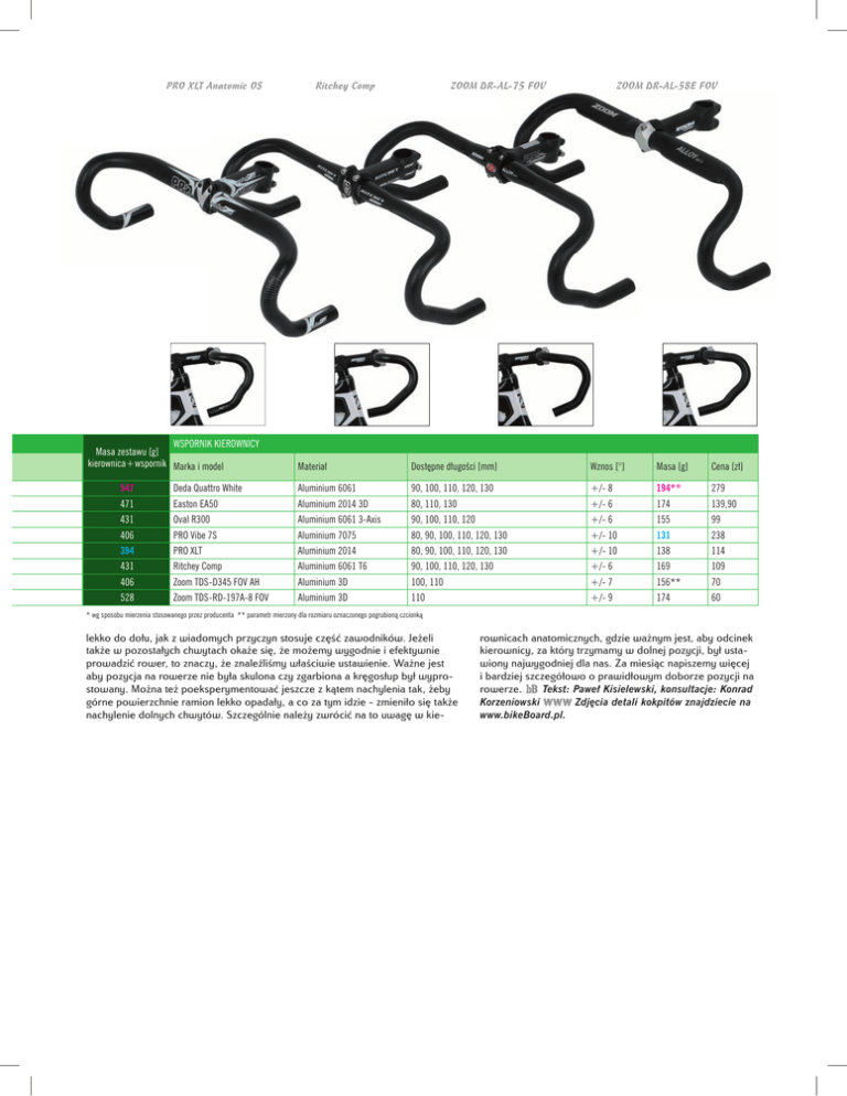 PRO XLT Anatomic OS WSPORNIK KIEROWNICY Masa zestawu [g] kierownica+wspornik Marka i model Ritchey Comp ZOOM DR-AL-75 FOV ZOOM DR-AL-58E FOV Materiał Dostępne długości [mm] Wznos [°] Masa [g] Cena [zł] Aluminium 6061 90, 100, 110, 120, 130 +/- 8 194** 279 547 Deda Quattro White 471 Easton EA50 Aluminium 2014 3D 80, 110, 130 +/- 6 174 139,90 431 Oval R300 Aluminium 6061 3-Axis 90, 100, 110, 120 +/- 6 155 99 238 406 PRO Vibe 7S Aluminium 7075 80, 90, 100, 110, 120, 130 +/- 10 131 394 PRO XLT Aluminium 2014 80, 90, 100, 110, 120, 130 +/- 10 138 114 431 Ritchey Comp Aluminium 6061 T6 90, 100, 110, 120, 130 +/- 6 169 109 406 Zoom TDS-D345 FOV AH Aluminium 3D 100, 110 +/- 7 156** 70 528 Zoom TDS-RD-197A-8 FOV Aluminium 3D 110 +/- 9 174 60 * wg sposobu mierzenia stosowanego przez producenta ** parametr mierzony dla rozmiaru oznaczonego pogrubioną czcionką lekko do dołu, jak z wiadomych przyczyn stosuje część zawodników. Jeżeli także w pozostałych chwytach okaże się, że możemy wygodnie i efektywnie prowadzić rower, to znaczy, że znaleźliśmy właściwie ustawienie. Ważne jest aby pozycja na rowerze nie była skulona czy zgarbiona a kręgosłup był wyprostowany. Można też poeksperymentować jeszcze z kątem nachylenia tak, żeby górne powierzchnie ramion lekko opadały, a co za tym idzie - zmieniło się także nachylenie dolnych chwytów. Szczególnie należy zwrócić na to uwagę w kie- rownicach anatomicznych, gdzie ważnym jest, aby odcinek kierownicy, za który trzymamy w dolnej pozycji, był ustawiony najwygodniej dla nas. Za miesiąc napiszemy więcej i bardziej szczegółowo o prawidłowym doborze pozycji na rowerze. Tekst: Paweł Kisielewski, konsultacje: Konrad Zdjęcia detali kokpitów znajdziecie na Korzeniowski www.bikeBoard.pl.