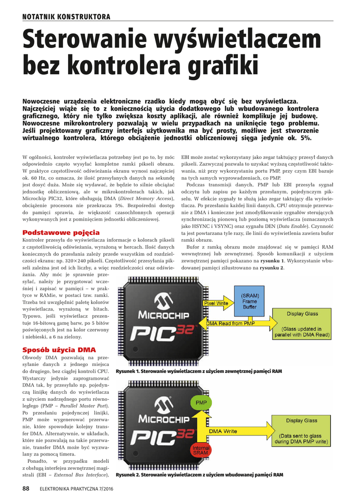 NOTATNIK KONSTRUKTORA Sterowanie wyświetlaczem bez kontrolera grafiki Nowoczesne urządzenia elektroniczne rzadko kiedy mogą obyć się bez wyświetlacza. Najczęściej wiąże się to z koniecznością użycia dodatkowego lub wbudowanego kontrolera graficznego, który nie tylko zwiększa koszty aplikacji, ale również komplikuje jej budowę. Nowoczesne mikrokontrolery pozwalają w wielu przypadkach na uniknięcie tego problemu. Jeśli projektowany graficzny interfejs użytkownika ma być prosty, możliwe jest stworzenie wirtualnego kontrolera, którego obciążenie jednostki obliczeniowej sięga jedynie ok. 5%. W ogólności, kontroler wyświetlacza potrzebny jest po to, by móc odpowiednio często wysyłać kompletne ramki pikseli obrazu. W praktyce częstotliwość odświeżania ekranu wynosi najczęściej ok. 60 Hz, co oznacza, że ilość przesyłanych danych na sekundę jest dosyć duża. Może się wydawać, że będzie to silnie obciążać jednostkę obliczeniową, ale w mikrokontrolerach takich, jak Microchip PIC32, które obsługują DMA (Direct Memory Access), obciążenie procesora nie przekracza 5%. Bezpośredni dostęp do pamięci sprawia, że większość czasochłonnych operacji wykonywanych jest z pominięciem jednostki obliczeniowej. Podstawowe pojęcia Kontroler przesyła do wyświetlacza informacje o kolorach pikseli z częstotliwością odświeżania, wyrażoną w hercach. Ilość danych koniecznych do przesłania zależy przede wszystkim od rozdzielczości ekranu: np. 320×240 pikseli. Częstotliwość przesyłania pikseli zależna jest od ich liczby, a więc rozdzielczości oraz odświeżania. Aby móc je sprawnie przesyłać, należy je przygotować wcześniej i zapisać w pamięci – w praktyce w RAMie, w postaci tzw. ramki. Trzeba też uwzględnić paletę kolorów wyświetlacza, wyrażoną w bitach. Typowo, jeśli wyświetlacz prezentuje 16-bitową gamę barw, po 5 bitów poświęconych jest na kolor czerwony i niebieski, a 6 na zielony. EBI może zostać wykorzystany jako zegar taktujący przesył danych pikseli. Zazwyczaj pozwala to uzyskać wyższą częstotliwość taktowania, niż przy wykorzystaniu portu PMP, przy czym EBI bazuje na tych samych wyprowadzeniach, co PMP. Podczas transmisji danych, PMP lub EBI przesyła sygnał odczytu lub zapisu po każdym przesłanym, pojedynczym pikselu. W efekcie sygnały te służą jako zegar taktujący dla wyświetlacza. Po przesłaniu każdej linii danych, CPU otrzymuje przerwanie z DMA i konieczne jest zmodyfikowanie sygnałów sterujących synchronizacją pionową lub poziomą wyświetlacza (oznaczanych jako HSYNC i VSYNC) oraz sygnału DEN (Data Enable). Czynność ta jest powtarzana tyle razy, ile linii do wyświetlenia zawiera bufor ramki obrazu. Bufor z ramką obrazu może znajdować się w pamięci RAM wewnętrznej lub zewnętrznej. Sposób komunikacji z użyciem zewnętrznej pamięci pokazano na rysunku 1. Wykorzystanie wbudowanej pamięci zilustrowano na rysunku 2. Sposób użycia DMA Obwody DMA pozwalają na przesyłanie danych z jednego miejsca do drugiego, bez ciągłej kontroli CPU. Wystarczy jedynie zaprogramować DMA tak, by przesyłało np. pojedynczą linijkę danych do wyświetlacza z użyciem nadrzędnego portu równoległego (PMP – Parallel Master Port). Po przesłaniu pojedynczej linijki, PMP może wygenerować przerwanie, które spowoduje kolejny transfer DMA. Alternatywnie, w układach, które nie pozwalają na takie przerwanie, transfer DMA może być wyzwalany za pomocą timera. Ponadto, w przypadku modeli z obsługą interfejsu zewnętrznej magistrali (EBI – External Bus Interface), 88 ELEKTRONIKA PRAKTYCZNA 7/2016 Rysunek 1. Sterowanie wyświetlaczem z użyciem zewnętrznej pamięci RAM Rysunek 2. Sterowanie wyświetlaczem z użyciem wbudowanej pamięci RAM Sterowanie wyświetlaczem bez kontrolera grafiki Listing 1. Sposób konfiguracji mikrokontrolera do pracy jako wirtualny kontroler wyświetlacza //Zawieś wszystkie transfery DMA DMACONbits.SUSPEND =1; #define PMP_CONTROL (PMP_ON|PMP_MUX_OFF|PMP_READ_WRITE_EN|\PMP_CS2_EN|PMP_CS2_POL_LO|PMP_WRITE_POL_LO|PCLK_POLARITY ) #define PMP_MODE (PMP_DATA_LENGTH|PMP_MODE_MASTER2|\PMP_WAIT_BEG_1|PMP_WAIT_MID_1|PMP_WAIT_END_1) // Przygotuj PMP // PMP jest skonfigurowane do korzystania z linii danych i adresowych w trybie 16-bitowym // Czasy oczekiwania PMP został skonfigurowane na najkrótsze mPMPOpen(PMP_CONTROL, PMP_MODE, PMP_ADDRESS_LINES, PMP_INT_ON); //Adres PMP ustawiany jest na 0 PMADDR = 0x0000; // Otwarcie pożądanego kanału DMA DmaChnOpen(1, 0, DMA_OPEN_DEFAULT); // Określenie, jakie zdarzenie ma powodować rozpoczęcie transferu DMA DmaChnSetEventControl(1, DMA_EV_START_IRQ(_TIMER_2_IRQ)); // Określenie parametrów transferu: adresu źródłowego, adresu docelowego // oraz rozmiarów; dla 16-bitowej palety rozmiar źródła to 2 bajty DmaChnSetTxfer(1, (void*)&PMDIN ,&GraphicsFrame[0] , 2, HBackPorch, 2); // Ustawienie priorytetu przerwania na 7 (najwyższy) INTSetVectorPriority(INT_VECTOR_DMA(1), INT_PRIORITY_LEVEL_7); // Ustawienie podrzędnego priorytetu przerwania INTSetVectorSubPriority(INT_VECTOR_DMA(1), INT_SUB_PRIORITY_LEVEL_3); // Właczenie przerwania wywoływanego w momencie zakończenia transferu DmaChnSetEvEnableFlags(1, DMA_EV_BLOCK_DONE); // Włączenie obsługi przerwań w kontrolerze INTEnable(INT_SOURCE_DMA(1), INT_ENABLED); // Włączenie DMA DmaChnEnable(1); // Uruchomienie timera drugiego tak, by wyzwalał zegar pikseli OpenTimer2(T2_ON | T2_SOURCE_INT | T2_PS_1_1, 10); // Rozpoczęcie wszystkich transferów DMA DMACONbits.SUSPEND = 0; Wyświetlacze TFT LCD Omawiana metoda pozwala na sterowanie zarówno wyświetlaczami TFT LCD, jak i CSTN lub MSTN, o ile zostanie poddana drobnym modyfikacjom. Linie danych odpowiadają bitom potrzebnym na przesyłanie informacji o kolorach pikseli. Większość wyświetlaczy spotykanych na rynku ma od 8 do 24 linii danych, zależnie od palety barw. Linie HSYNC, VSYNC, DEN 