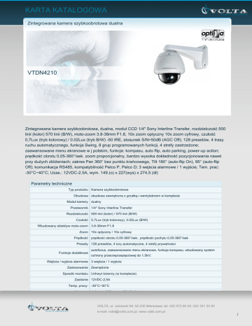 KARTA KATALOGOWA Zintegrowana kamera szybkoobrotowa dualna VTDN4210 Zintegrowana kamera szybkoobrotowa, dualna, moduł CCD 1/4" Sony Interline Transfer, rozdzielczość 500 linii (kolor) 570 linii (B/W), moto-zoom 3.8-38mm F1.8, 10x zoom optyczny 10x zoom cyfrowy, czułość 0,7Lux (tryb kolorowy) / 0.02Lux (tryb B/W) -50 IRE, stosunek S/N>50dB (AGC Off); 128 presetów, 4 trasy ruchu automatycznego, funkcja Swing, 8 grup programowanych funkcji, 4 strefy zastrzeżone; zaawansowane menu ekranowe w j polskim, funkcje: kompasu, auto flip, auto parking, power-up action; prędkość obrotu 0,05-360°/sek. zoom proporcjonalny, bardzo wysoka dokładność pozycjonowania nawet przy dużych zbliżeniach; zakres Pan 360° bez punktu krańcowego, Tilt 180° (auto-flip On), 95° (auto-flip Off); komunikacja RS485, kompatybilność Pelco P, Pelco D; 3 wejścia alarmowe / 1 wyjście; Tem. prac: -30°C~40°C; Uzas.: 12VDC-2.5A, wym. 149.(o) x 227(wys) x 274,5 (dł) Parametry techniczne Typ produktu Kamera szybkoobrotowa Obudowa obudowa zewnętrzna z grzałką i wentylatorem w komplecie Moduł kamery dualny Przetwornik 1/4" Sony Interline Transfer Rozdzielczość 500 linii (kolor) / 570 linii (B/W) Czułość 0,7Lux (tryb kolorowy), 0.02Lux (B/W) Wbudowany obiektyw moto-zoom 3.8-38mm F1.8 Zoom 10x optyczny / 10x cyfrowy Prędkość prędkość obrotu 0,05-360°/sek., prędkość pochyłu 0,05-360°/sek Presety 128 presetów, 4 tury automatyczne, 4 strefy prywatności Funkcje dodatkowe autofocus, zaawansowane menu ekranowe, funkcja kompasu, wbudowany system ochrony przeciwprzepięciowej do 1,5kV; Wejścia / wyjścia alarmowe 3 wejścia / 1 wyjście Zastosowanie Zewnętrzne Sposób montażu Uchwyt ścienny (w komplecie) Zasilanie 12VDC-2,5A Temp. pracy: -30°C~50°C Wymiary 149 (o) x 227(wys) x 274,5 (dł) VOLTA, ul. Jutrzenki 94, 02-230 Warszawa, tel. 022 572 90 20, 022 331 33 00 e-mail: [email protected], www.volta.com.pl 1