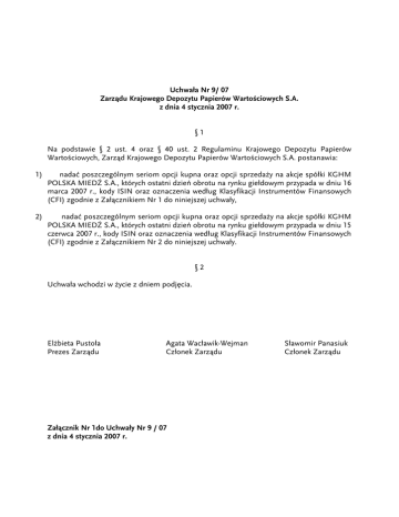 Uchwała Nr 9/ 07 Zarządu Krajowego Depozytu Papierów Wartościowych S.A. z dnia 4 stycznia 2007 r. §1 Na podstawie § 2 ust. 4 oraz § 40 ust. 2 Regulaminu Krajowego Depozytu Papierów Wartościowych, Zarząd Krajowego Depozytu Papierów Wartościowych S.A. postanawia: 1) nadać poszczególnym seriom opcji kupna oraz opcji sprzedaży na akcje spółki KGHM POLSKA MIEDŹ S.A., których ostatni dzień obrotu na rynku giełdowym przypada w dniu 16 marca 2007 r., kody ISIN oraz oznaczenia według Klasyfikacji Instrumentów Finansowych (CFI) zgodnie z Załącznikiem Nr 1 do niniejszej uchwały, 2) nadać poszczególnym seriom opcji kupna oraz opcji sprzedaży na akcje spółki KGHM POLSKA MIEDŹ S.A., których ostatni dzień obrotu na rynku giełdowym przypada w dniu 15 czerwca 2007 r., kody ISIN oraz oznaczenia według Klasyfikacji Instrumentów Finansowych (CFI) zgodnie z Załącznikiem Nr 2 do niniejszej uchwały. §2 Uchwała wchodzi w życie z dniem podjęcia. Elżbieta Pustoła Prezes Zarządu Agata Wacławik-Wejman Członek Zarządu Załącznik Nr 1do Uchwały Nr 9 / 07 z dnia 4 stycznia 2007 r. Sławomir Panasiuk Członek Zarządu kod ISIN nazwa skrócona CFI data wygaśnięcia PL0GPWO16990 PL0GPWO17006 PL0GPWO17014 PL0GPWO17022 PL0GPWO17030 PL0GPWO17048 PL0GPWO17055 PL0GPWO17063 OKGHO7046 OKGHO7048 OKGHO7050 OKGHO7055 OKGHC7048 OKGHC7050 OKGHC7055 OKGHC7060 OPESCS OPESCS OPESCS OPESCS OCESCS OCESCS OCESCS OCESCS 16 marca 2007 r. 16 marca 2007 r. 16 marca 2007 r. 16 marca 2007 r. 16 marca 2007 r. 16 marca 2007 r. 16 marca 2007 r. 16 marca 2007 r. Załącznik Nr 2 do Uchwały Nr 9 / 07 z dnia 4 stycznia 2007 r. kod ISIN nazwa skrócona CFI data wygaśnięcia PL0GPWO17071 PL0GPWO17089 PL0GPWO17097 PL0GPWO17105 PL0GPWO17113 PL0GPWO17121 PL0GPWO17139 PL0GPWO17147 OKGHR7050 OKGHR7055 OKGHR7060 OKGHR7065 OKGHF7055 OKGHF7060 OKGHF7065 OKGHF7070 15 czerwca 2007 r. 15 czerwca 2007 r. 15 czerwca 2007 r. 15 czerwca 2007 r. 15 czerwca 2007 r. 15 czerwca 2007 r. 15 czerwca 2007 r. 15 czerwca 2007 r. OPESCS OPESCS OPESCS OPESCS OCESCS OCESCS OCESCS OCESCS