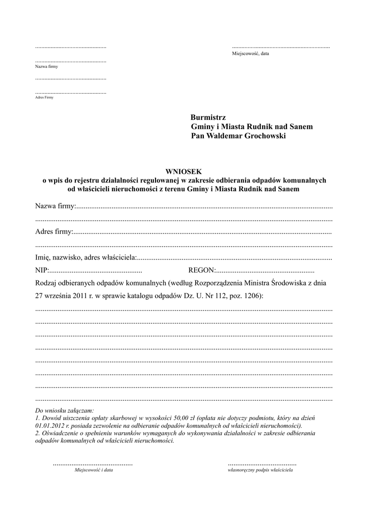 .............................................. ............................................................... Miejscowość, data .............................................. Nazwa firmy .............................................. .............................................. Adres Firmy Burmistrz Gminy i Miasta Rudnik nad Sanem Pan Waldemar Grochowski WNIOSEK o wpis do rejestru działalności regulowanej w zakresie odbierania odpadów komunalnych od właścicieli nieruchomości z terenu Gminy i Miasta Rudnik nad Sanem Nazwa firmy:.......................................................................................................................................... ................................................................................................................................................................ Adres firmy:........................................................................................................................................... ................................................................................................................................................................ Imię, nazwisko, adres właściciela:......................................................................................................... NIP:.................................................. REGON:..................................................... Rodzaj odbieranych odpadów komunalnych (według Rozporządzenia Ministra Środowiska z dnia 27 września 2011 r. w sprawie katalogu odpadów Dz. U. Nr 112, poz. 1206): ................................................................................................................................................................ ................................................................................................................................................................ ................................................................................................................................................................ ................................................................................................................................................................ ................................................................................................................................................................ ................................................................................................................................................................ ................................................................................................................................................................ ................................................................................................................................................................ Do wniosku załączam: 1. Dowód uiszczenia opłaty skarbowej w wysokości 50,00 zł (opłata nie dotyczy podmiotu, który na dzień 01.01.2012 r. posiada zezwolenie na odbieranie odpadów komunalnych od właścicieli nieruchomości). 2. Oświadczenie o spełnieniu warunków wymaganych do wykonywania działalności w zakresie odbierania odpadów komunalnych od właścicieli nieruchomości. ........................................... Miejscowość i data ..................................... własnoręczny podpis właściciela