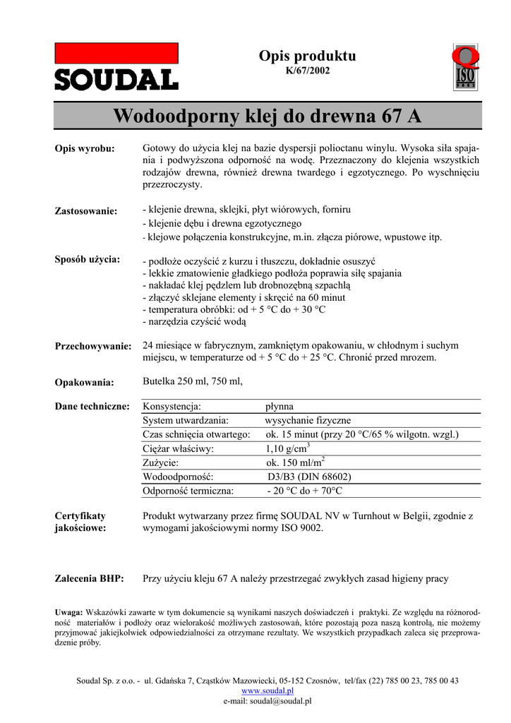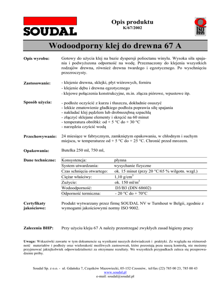 Opis produktu K/67/2002 Wodoodporny klej do drewna 67 A Opis wyrobu: Gotowy do użycia klej na bazie dyspersji polioctanu winylu. Wysoka siła spajania i podwyższona odporność na wodę. Przeznaczony do klejenia wszystkich rodzajów drewna, również drewna twardego i egzotycznego. Po wyschnięciu przezroczysty. Zastosowanie: - klejenie drewna, sklejki, płyt wiórowych, forniru - klejenie dębu i drewna egzotycznego - klejowe połączenia konstrukcyjne, m.in. złącza piórowe, wpustowe itp. Sposób użycia: - podłoże oczyścić z kurzu i tłuszczu, dokładnie osuszyć - lekkie zmatowienie gładkiego podłoża poprawia siłę spajania - nakładać klej pędzlem lub drobnozębną szpachlą - złączyć sklejane elementy i skręcić na 60 minut - temperatura obróbki: od + 5 °C do + 30 °C - narzędzia czyścić wodą Przechowywanie: 24 miesiące w fabrycznym, zamkniętym opakowaniu, w chłodnym i suchym miejscu, w temperaturze od + 5 °C do + 25 °C. Chronić przed mrozem. Opakowania: Butelka 250 ml, 750 ml, Dane techniczne: Konsystencja: System utwardzania: Czas schnięcia otwartego: Ciężar właściwy: Zużycie: Wodoodporność: Odporność termiczna: Certyfikaty jakościowe: Produkt wytwarzany przez firmę SOUDAL NV w Turnhout w Belgii, zgodnie z wymogami jakościowymi normy ISO 9002. Zalecenia BHP: Przy użyciu kleju 67 A należy przestrzegać zwykłych zasad higieny pracy płynna wysychanie fizyczne ok. 15 minut (przy 20 °C/65 % wilgotn. wzgl.) 1,10 g/cm3 ok. 150 ml/m2 D3/B3 (DIN 68602) - 20 °C do + 70°C Uwaga: Wskazówki zawarte w tym dokumencie są wynikami naszych doświadczeń i praktyki. Ze względu na różnorodność materiałów i podłoży oraz wielorakość możliwych zastosowań, które pozostają poza naszą kontrolą, nie możemy przyjmować jakiejkolwiek odpowiedzialności za otrzymane rezultaty. We wszystkich przypadkach zaleca się przeprowadzenie próby. Soudal Sp. z o.o. - ul. Gdańska 7, Cząstków Mazowiecki, 05-152 Czosnów, tel/fax (22) 785 00 23, 785 00 43 www.soudal.pl e-mail: [email protected]