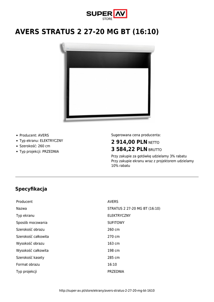 AVERS STRATUS 2 27-20 MG BT (16:10) Producent: AVERS Typ ekranu: ELEKTRYCZNY Szerokość: 260 cm Typ projekcji: PRZEDNIA Sugerowana cena producenta: 2 914,00 PLN NETTO 3 584,22 PLN BRUTTO Przy zakupie za gotówkę udzielamy 3% rabatu Przy zakupie ekranu wraz z projektorem udzielamy 10% rabatu Specyfikacja Producent AVERS Nazwa STRATUS 2 27-20 MG BT (16:10) Typ ekranu ELEKTRYCZNY Sposób mocowania SUFITOWY Szerokość obrazu 260 cm Szerokość całkowita 270 cm Wysokość obrazu 163 cm Wysokość całkowita 198 cm Szerokość kasety 285 cm Format obrazu 16:10 Typ projekcji PRZEDNIA http://super-av.pl/store/ekrany/avers-stratus-2-27-20-mg-bt-1610 Powierzchnia projekcyjna MATT GREY Przekątna obrazu 307cm (121cali) Waga 13.70 kg Przenośny NIE Przybliżony czas realizacji 7-10 DNI ROBOCZYCH Informacje Ekran projekcyjny z napędem elektrycznym który może być zainstalowany w sposób ukryty (np. w suficie podwieszonym) lub widoczny w pomieszczeniach o wielkości dostosowanej do jego wymiarów. W zależności od potrzeb ekran może być stosowany do projekcji prezentacyjnych lub filmowych. Obudowa ekranu wykonana jest z profili aluminiowych w kolorze białym. Na przedniej i tylnej ścianie obudowy znajdują się paski dekoracyjne w kolorze białym, na życzenie klienta ich barwa może być zmieniona. Tkanina projekcyjna wysuwana jest z otworu zasłanianego klapką uchylającą się automatycznie na czas rozwinięcia ekranu. Po zwinięciu ekranu klapka zamyka szczelnie otwór w obudowie i chroni powierzchnię projekcyjną zabrudzeniem. Wyprowadzenie tkaniny z przodu kasety gwarantuje zachowanie przestrzeni pomiędzy ścianą i rozwiniętą tkaniną projekcyjną umożliwiającej instalację innych urządzeń. „Niewidzialne” uchwyty ścienno/sufitowe oraz szyny montażowe umieszczone na całej długości obudowy tworzą elastyczny i prosty w obsłudze system instalacji. Dedykowany zestaw adaptacyjny (In-ceiling kit) umożliwia estetyczną i nieskomplikowaną ukrytą instalację ekranu np. w suficie podwieszonym. Napęd ekranu zapewnia silnik elektryczny z funkcją automatycznego zatrzymywania zwijania/rozwijania, która zapewnia długi czas eksploatacji powierzchni projekcyjnej. Ekran jest przystosowany do podłączenia do zewnętrznego systemu sterującego, może być sterowany ręcznie przełącznikiem naściennym. Jako wyposażenie dodatkowe dostępny jest wbudowany system zdalnego sterowania, jego instalacja jest możliwa jedynie podczas produkcji ekranu. Ekran objęty jest 2-letnią gwarancją realizowaną w trybie (drzwi do drzwi). W zestawie z ekranem dostarczane są akcesoria instalacyjne oraz naścienny przełącznik sterujący (pilot zdalnego sterowania). Super AV al. Jana Pawła II 32 43 - 100 Tychy tel: 32 217 01 12 http://super-av.pl/store/ekrany/avers-stratus-2-27-20-mg-bt-1610