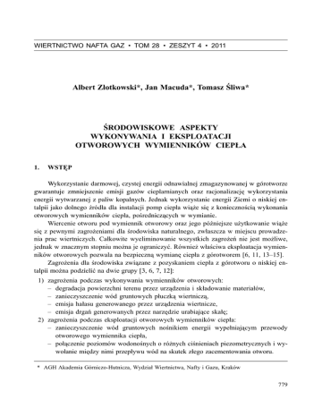 WIERTNICTWO NAFTA GAZ TOM 28 ZESZYT 4 2011 Albert Z³otkowski*, Jan Macuda*, Tomasz liwa* RODOWISKOWE ASPEKTY WYKONYWANIA I EKSPLOATACJI OTWOROWYCH WYMIENNIKÓW CIEP£A 1. WSTÊP Wykorzystanie darmowej, czystej energii odnawialnej zmagazynowanej w górotworze gwarantuje zmniejszenie emisji gazów cieplarnianych oraz racjonalizacjê wykorzystania energii wytwarzanej z paliw kopalnych. Jednak wykorzystanie energii Ziemi o niskiej entalpii jako dolnego ród³a dla instalacji pomp ciep³a wi¹¿e siê z koniecznoci¹ wykonania otworowych wymienników ciep³a, porednicz¹cych w wymianie. Wiercenie otworu pod wymiennik otworowy oraz jego póniejsze u¿ytkowanie wi¹¿e siê z pewnymi zagro¿eniami dla rodowiska naturalnego, zw³aszcza w miejscu prowadzenia prac wiertniczych. Ca³kowite wyeliminowanie wszystkich zagro¿eñ nie jest mo¿liwe, jednak w znacznym stopniu mo¿na je ograniczyæ. Równie¿ w³aciwa eksploatacja wymienników otworowych pozwala na bezpieczn¹ wymianê ciep³a z górotworem [6, 11, 1315]. Zagro¿enia dla rodowiska zwi¹zane z pozyskaniem ciep³a z górotworu o niskiej entalpii mo¿na podzieliæ na dwie grupy [3, 6, 7, 12]: 1) zagro¿enia podczas wykonywania wymienników otworowych: degradacja powierzchni terenu przez urz¹dzenia i sk³adowanie materia³ów, zanieczyszczenie wód gruntowych p³uczk¹ wiertnicz¹, emisja ha³asu generowanego przez urz¹dzenia wiertnicze, emisja drgañ generowanych przez narzêdzie urabiaj¹ce ska³ê; 2) zagro¿enia podczas eksploatacji otworowych wymienników ciep³a: zanieczyszczenie wód gruntowych nonikiem energii wype³niaj¹cym przewody otworowego wymiennika ciep³a, po³¹czenie poziomów wodononych o ró¿nych cinieniach piezometrycznych i wywo³anie miêdzy nimi przep³ywu wód na skutek z³ego zacementowania otworu. * AGH Akademia Górniczo-Hutnicza, Wydzia³ Wiertnictwa, Nafty i Gazu, Kraków 779 Wymienione zagro¿enia wystêpuj¹ce podczas wykonywania otworowych wymienników ciep³a (rys. 1) s¹ nierozerwalnie zwi¹zane z prowadzeniem prac wiertniczych i nie ma mo¿liwoci ca³kowitego ich wyeliminowania. Niebezpieczeñstwom w czasie eksploatacji mo¿na zapobiegaæ m.in. przez odpowiednie i staranne wykonanie otworowych wymienników ciep³a. Rys. 1. Wykonywanie otworowego wymiennika ciep³a otwór AGH LG2 2. ZAGRO¯ENIA WYSTÊPUJ¥CE PODCZAS WYKONYWANIA OTWOROWYCH WYMIENNIKÓW CIEP£A Wykonanie instalacji technicznej dostarczaj¹cej do pomp ciep³a energiê o niskiej entalpii pochodz¹c¹ z górotworu wymaga odwiercenia otworów, do których zostanie zapuszczona armatura otworowych wymienników ciep³a i nastêpnie skonsolidowana z górotworem przy u¿yciu zaczynu uszczelniaj¹cego [16, 17]. Specyfika prac wiertniczych zwi¹zanych z wykonaniem otworowych wymienników ciep³a o typowej g³êbokoci (do 150 m) wymaga u¿ycia wiertnicy (najczêciej zamontowanej na podwoziu samochodu ciê¿arowego) umo¿liwiaj¹cej odwiercenie otworu metod¹ obrotow¹ z u¿yciem p³uczki wiertniczej przygotowanej na bazie wody lub p³uczki powietrznej oraz dodatkowych urz¹dzeñ umo¿liwiaj¹cych cementacjê otworu. Wykonanie takiego otworu zwi¹zane jest z emisj¹ do rodowiska ha³asu, generowanego przez silniki napêdowe wiertnicy, o wielkoci 80÷92 dB, co znacznie przekracza dopuszczalne normy w odniesieniu do terenów zabudowy mieszkalnej wynosz¹ce w porze dziennej 55 dB i w porze nocnej 45 dB. Problem emisji ha³asu podczas 780 prowadzenia tego rodzaju prac wiertniczych jest bardzo istotny z uwagi na fakt, ¿e wiêkszoæ otworowych wymienników ciep³a wykonuje siê w s¹siedztwie budynków w gêstej miejskiej zabudowie, a konieczna do celów grzewczych d³ugoæ wymienników otworowych (przy redniej g³êbokoci otworów 100÷150 m) wykonywanych przy budynku mieszkalnym wymaga kilkudniowej pracy wiertnicy. Szczególne zagro¿enie ha³asem, w zwi¹zku z wykonywaniem takich otworów wystêpuje podczas prowadzenia prac wiertniczych metod¹ udarow¹ z wykorzystaniem m³otków wg³êbnych napêdzanych sprê¿onym powietrzem. Poziom ha³asu emitowanego do rodowiska przekracza w takich przypadkach 90 dB. Kolejnym zagro¿eniem dla rodowiska, wystêpuj¹cym zw³aszcza podczas przewiercania ska³ twardych, jest emisja wibracji, zwi¹zana z prac¹ narzêdzia na dnie otworu. Problem ten jest szczególnie istotny przy wykonywaniu otworów metod¹ udarow¹ z wykorzystaniem m³otków wg³êbnych. Ograniczenie wibracji w takich przypadkach mo¿na uzyskaæ m.in. dziêki zmianie techniki i technologii wiercenia [4, 8]. Wykonanie otworów do celów grzewczych zwi¹zane jest równie¿ z degradacj¹ gleb i gruntów na terenie prowadzonych prac. Wiertnice wykorzystywane do dr¹¿enia tego rodzaju otworów (na podwoziu ko³owym lub g¹siennicowym) wymagaj¹ zajêcia odpowiednio du¿ej powierzchni terenu, zw³aszcza ¿e ze wzglêdów technologicznych wiercone otwory nie powinny byæ rozmieszczone blisko siebie. Ponadto otworowe wymienniki ciep³a bardzo czêsto sytuowane s¹ na terenach ju¿ zagospodarowanych, co wymaga od wykonawcy prac wiertniczych nale¿ytej dba³oci o ograniczenie degradacji powierzchni terenu do obszaru niezbêdnego do ich wykonania. Takie rozwi¹zanie redukuje równie¿ wielkoæ zajmowanego terenu, a przede wszystkim koszty zwi¹zane z jego rekultywacj¹ [3, 6, 7, 13] (rys. 2). a) b) Rys. 2. Miejsce wykonania wymienników otworowych przed zakoñczeniem (a) i po zakoñczeniu prac (b) 781 Teren, na którym przewidziane jest magazynowanie materia³ów u¿ywanych do wykonania instalacji oraz postawienie osprzêtu wiertniczego i elementów obiegu p³uczkowego, powinien byæ tak zabezpieczony, aby nie dochodzi³o do degradacji gleb i gruntów w wyniku rozlania lub rozsypania siê substancji toksycznych stosowanych w procesie wiercenia i do budowy instalacji grzewczej. U¿ycie p³uczki do wiercenia wymaga nale¿ytej starannoci zw³aszcza podczas obs³ugi armatury p³uczkowej, w tym zwrócenia szczególnej uwagi na stan szczelnoci po³¹czeñ (rys. 3). R