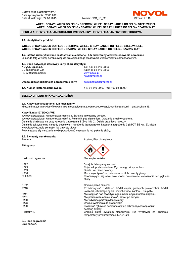 KARTA CHARAKTERYSTYKI Data sporządzenia: 02.03.2011 Data aktualizacji : 27.08.2015 Numer: SDS_10_02 Strona: 1 z 10 WHEEL SPRAY LAKIER DO FELG - SREBRNY, WHEEL SPRAY LAKIER DO FELG - STEELWHEEL, WHEEL SPRAY LAKIER DO FELG - CZARNY, WHEEL SPRAY LAKIER DO FELG – CZARNY MAT. SEKCJA 1: IDENTYFIKACJA SUBSTANCJI/MIESZANINY I IDENTYFIKACJA PRZEDSIĘBIORSTWA 1.1. Identyfikator produktu WHEEL SPRAY LAKIER DO FELG - SREBRNY, WHEEL SPRAY LAKIER DO FELG - STEELWHEEL , WHEEL SPRAY LAKIER DO FELG - CZARNY, WHEEL SPRAY LAKIER DO FELG – CZARNY MAT. 1.2. Istotne zidentyfikowane zastosowania substancji lub mieszaniny oraz zastosowania odradzane Lakier do felg w wersji aerozolowej do profesjonalnego stosowania w lakiernictwie samochodowym. 1.3. Dane dotyczące dostawcy karty charakterystyki NOVOL Sp. z o.o. Tel: +48 61 810-98-00 Ul. Żabikowska 7/9 Fax:+48 61 810-98-09 PL 62-052 Komorniki www.novol.pl [email protected] Osoba odpowiedzialna za opracowanie karty [email protected] 1.4. Numer telefonu alarmowego +48 61 810-99-09 (od 7.00 do 15.00) SEKCJA 2: IDENTYFIKACJA ZAGROŻEŃ 2.1. Klasyfikacja substancji lub mieszaniny Mieszanina została sklasyfikowana jako niebezpieczna zgodnie z obowiązującymi przepisami – patrz sekcja 15. Klasyfikacja 1272/2008/WE: Wyroby aerozolowe, kategoria zagrożenia 1. Skrajnie łatwopalny aerozol. Wyroby aerozolowe, kategorie zagrożeń 1. Pojemnik pod ciśnieniem: Ogrzanie grozi wybuchem. Działanie drażniące na oczy kategoria zagrożenia 2 (Eye Irrit. 2). Działa drażniąco na oczy. Działanie toksyczne na narządy docelowe – narażenie jednorazowe, kategoria zagrożenia 3 (STOT SE kat. 3). Może wywoływać uczucie senności lub zawroty głowy Powtarzające się narażenie może powodować wysuszanie lub pękanie skóry. 2.2. Elementy oznakowania: Zawiera Aceton, Eter dimetylowy Piktogramy: Hasło ostrzegawcze: Niebezpieczeństwo H222 H229 H319 H336 EUH066 Skrajnie łatwopalny aerozol. Pojemnik pod ciśnieniem: Ogrzanie grozi wybuchem. Działa drażniąco na oczy. Może wywoływać uczucie senności lub zawroty głowy. Powtarzające się narażenie może powodować wysuszanie lub pękanie skóry. P102 P210 Chronić przed dziećmi. Przechowywać z dala od źródeł ciepła, gorących powierzchni, źródeł iskrzenia, otwartego ognia i innych źródeł zapłonu. Nie palić. Nie rozpylać nad otwartym ogniem lub innym źródłem zapłonu. Nie przekłuwać ani nie spalać, nawet po zużyciu. Nie wdychać par/rozpylonej cieczy. Unikać uwolnienia do środowiska Stosować rękawice ochronne/odzież ochronną/ochronę oczu/ ochronę twarzy. Chronić przed światłem słonecznym. Nie wystawiać na działanie temperatury przekraczającej 50°C/122°F. P211 P251 P260 P273 P280 P410+P412 2.3. Inne zagrożenia Brak danych. KARTA CHARAKTERYSTYKI Data sporządzenia: 02.03.2011 Data aktualizacji : 27.08.2015 Numer: SDS_10_02 Strona: 2 z 10 WHEEL SPRAY LAKIER DO FELG - SREBRNY, WHEEL SPRAY LAKIER DO FELG - STEELWHEEL, WHEEL SPRAY LAKIER DO FELG - CZARNY, WHEEL SPRAY LAKIER DO FELG – CZARNY MAT. SEKCJA 3: SKŁAD/INFORMACJA O SKŁADNIKACH 3.1. Substancje Nie dotyczy. 3.2. Mieszaniny WHEEL SPRAY LAKIER DO FELG-SREBRNY WHEEL SPRAY LAKIER DO FELG-STEELWHEEL WHEEL SPRAY LAKIER DO FELG - CZARNY WHEEL SPRAY LAKIER DO FELG – CZARNY MAT Identyfikator produktu Nazwa substancji Numery identyfikacyjne Klasyfikacja i oznakowanie Stężenie [% wag.] Aceton WE: 200-662-2 CAS: 67-64-1 Nr Indeksu: 606-001-00-8 Nr rejestracji: 012119471330-49-XXXX Flam. Liq. 2; H225; Eye Irrit.2; H319; STOT SE 3, H336 EUH066 25-50 Eter dimetylowy WE: 204-065-8 CAS: 115-10-6 Nr Indeksu: 603-019-00-8 Nr rejestracji: 012119472128-37-XXXX Flam. Gas. 1; H220; Press. Gas.H280 20-25 Octan butylu WE: 204-658-1 CAS: 123-86-4 Nr Indeksu: 607-025-00-1 Nr rejestracji: 012119485493-29-XXXX Flam. Liq. 3; H226; STOT SE 3; H336 EUH066 5-10 Propan WE: 200-827-9 CAS: 74-98-6 Nr Indeksu: 601-003-00-5 Nr rejestracji: 012119486944-21-XXXX Flam. Gas. 1; H220; Press. Gas.H280 5-10 Butan WE: 203-448-7 CAS: 106-97-8 Nr Indeksu: 601-004-00-0 Nr rejestracji: 012119474691-32-XXXX Flam. Gas. 1; H220; Press. Gas.H280 5-10 Izobutan WE: 200-857-2 CAS: 75-28-5 Nr Indeksu: 601-004-00-0 Nr rejestracji: 012119485395-27-XXXX Flam. Gas. 1; H220; Press. Gas.H280 5-10 Octan 1-metoksy –2propylu WE: 203-603-9 CAS: 108-65-6 Nr Indeksu: 607-195-00-7 Nr rejestracji: 012119475791-29-XXXX Flam. Liq. 3; H226 5-10 Glin, proszek stabilizowany WE: 231-072-3 CAS: 7429-90-5 Nr Indeksu: 013-002-00-1 Nr rejestracji: 012119529243-45-XXXX Uwaga T Flam. Sol. 1; H228; 0-5 KARTA CHARAKTERYSTYKI Data sporządzenia: 02.03.2011 Data aktualizacji : 27.08.2015 Numer: SDS_10_02 Strona: 3 z 10 WHEEL SPRAY LAKIER DO FELG - SREBRNY, WHEEL SPRAY LAKIER DO FELG - STEELWHEEL, WHEEL SPRAY LAKIER DO FELG - CZARNY, WHEEL SPRAY LAKIER DO FELG – CZARNY MAT. SEKCJA 3: SKŁAD/INFORMACJA O SKŁADNIKACH Nazwa substancji Numery identyfikacyjne Klasyfikacja i oznakowanie Stężenie [% wag.] Ksylen WE: 215-535-7 CAS: 1330-20-7 Nr Indeksu: 601-022-00-9 Nr rejestracji: 012119488216-32-XXXX Flam. Liq. 3; H226; Acute Tox. 4; H332 Acute Tox. 4; H312 Skin Irrit.2; H315 1-2,5 Nitroceluloza (zawartość azotu <12,6%) WE: --CAS: 9004-70-0 Nr Indeksu: --Nr rejestracji: -- Flam. Sol. 1; H228 1-2,5 Butan-1-ol WE: 200-751-6 CAS: 71-36-3 Nr Indeksu: 603-004-00-6 Nr rejestracji: 012119484630-38-XXXX Flam. Liq. 3; H226; Acute. Tox.4; H302 STOT SE 3, H335, H336 Skin Irrit. 2; H315 Eye Dam.1; H318 0-2,5 Propan-2-ol WE: 200-661-7 CAS: 67-63-0 Nr Indeksu: 603-117-00-0 Nr rejestracji: 012119457558-25-XXXX Flam. Liq. 2; H225 Eye Irrit. 2; H319 STOT SE 3; H336 0-2,5 Pełne znaczenie zwrotów wskazujących rodzaj zagrożenia zamieszczono w sekcji 16. SEKCJA 4: ŚRODKI PIERWSZEJ POMOCY 4.1. Opis środków pierwszej pomocy: Ogólne wskazówki: Patrz sekcja 11 Karty Charakterystyki. Drogi oddechowe: Wyprowadzić poszkodowanego na świeże powietrze, zapewnić spokój, w razie braku oddechu zastosować sztuczne od