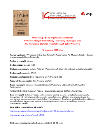 Wycieczka po Łodzi organizowana w ramach VII Forum Młodych Bibliotekarzy – warsztaty edukacyjne oraz XIV Konferencji Bibliotek Niepaństwowych Szkół Wyższych 12 września 2012 roku Nazwa wycieczki: Wycieczka do Instytutu Poligrafii i Papiernictwa PŁ (Muzeum Książki i Druku) oraz zwiedzanie Domu Papiernika Rodzaj wycieczki: piesza Godzina rozpoczęcia: 15.30 Miejsce rozpoczęcia: Instytut Poligrafii i Papiernictwa Politechniki Łódzkiej, ul. Wólczańska 223 Godzina zakończenia: 17.00 Miejsce zakończenia: Dom Papiernika, ul. Piotrkowska 282 Przewodnik/organizator: Pan Ryszard Uljański Trasa wycieczki: położony nieopodal Biblioteki Politechniki Łódzkiej Instytut Poligrafii i Papiernictwa Politechniki Łódzkiej (Muzeum Papieru i Druku) oraz przejście do Domu Papiernika. Opis wycieczki: Celem wycieczki jest obejrzenie kolekcji maszyn i urządzeń papierniczych, typograficznych i introligatorskich, zasobów specjalistycznej biblioteki oraz pracowni ręcznie czerpanego papieru, rękodzielniczej drukarni i introligatorni. Dodatkową atrakcją będzie możliwość samodzielnego wytworzenia papieru czerpanego i uczestniczenie w przebiegu procesu powstawania książki. Inne ważne informacje na stronach: http://www.muzeumwlokiennictwa.pl/o-skansenie/1/96,dom-papiernika.html http://www.inpap.p.lodz.pl/tresc/21/6/19/ Minimalna i maksymalna liczba uczestników1: 20-35 osób