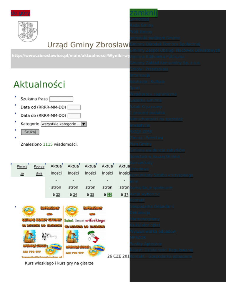zamknij do góry Samorząd Rada Gminy Wójt Gminy Jednostki podległe Gminie Gminny Ośrodek Pomocy Społecznej Urząd Gminy Zbrosławice Gminny Zespół Obsługi Placówek Oświatowych http://www.zbroslawice.pl/main/aktualnosci/Wyniki-wyborow-uzupelniajacych-do-Rady-Gmin Gminna Biblioteka Publiczna Gminny Zakład Komunalny/printpdf/st:26 Sp. z o.o. Szkoły i Przedszkola Informacje Aktualności Edukacja i Kultura Sport Współpraca zagraniczna Szukana fraza Gazetka Gminna Data od (RRRR-MM-DD) Sztab Kryzysowy 1 procent podatku Data do (RRRR-MM-DD) Nieruchomości na sprzedaż Kategorie wszystkie kategorie ... ▼ Inwestycje AKCJA ZIMA Szukaj Gmina i Sołectwa Plan Gminy Znaleziono 1115 wiadomości. Gminna ewidencja zabytków Sołectwa w naszej Gminie Komunikaty Aktua Aktua Aktua Następ Ostatni Urzędowe lności lności lności na a Komunikaty Sztabu kryzysowego - Inne - Pierws Poprze Aktua Aktua Aktua Aktua za dnia lności lności lności lności - - - - stron stron stron stron stron Konsultacje stron stron społeczne a 23 a 24 a 25 a a 27 Akcje a wyborcze 28 a 29 26 Kontakt Gospodarka Odpadami Deklaracja Harmonogramy Kalkulator opłat Wyszukiwarka odpadów MPSZOK Punkty Apteczne Rejestr Działalności Regulowanej 26 CZE 2015 Kontakt - Gospodarka odpadami Kurs włoskiego i kurs gry na gitarze kategoria: Komunikaty urzędowe Pan Mariusz Jadwidzic zaprasza na letnie kursy języka włoskiego oraz nauki gry na gitarze. 24 CZE 2015 kategoria: Piotr Domagała na STACJI DŹWIĘKU Komunikaty urzędowe Zapraszamy na ostatni już koncert spod znaku "Stacja Dźwięku".Dwa koncerty już za nami:TIME FOR FUNK >>> GALERIA GALERIA 24 CZE 2015 NOWE INDYWIDUALNE NUMERY RACHUNKÓW BANKOWYCH kategoria: Komunikaty urzędowe Szanowni Państwo, W związku z wdrażaniem systemu płatności masowych uprzejmie informuje się o nadawaniu indywidualnych numerów rachunków bankowych podatnikom podatku od nieruchomości, podatku rolnego, podatku leśnego, podatku od środków transportowych oraz opłaty za gospodarowanie odpadami komunalnymi. Od tego momentu w otrzymywanych pismach (decyzjach, upomnieniach) w pouczeniu widnieć będzie nowy INDYWIDUALNY NUMER RACHUNKU 23 CZE 2015 kategoria: Informacja o bezdomnych zwierzętach Inne Wyłapane przez rakarza bezdomne psy z terenu naszej gminy trafiają do schroniska w Miedarach przy ul. 1 Maja 76, tel. 608 021 852 Zapraszamy wszystkich chętnych i wrażliwych na los bezdomnych zwierząt do adopcji. Podajemy adres strony internetowej schroniska: http://www.schroniskowmiedarach.cba.pl/oraz stronę :http://www.schronisko-miedary.com/index.php?option=com_content&view=category&layout=blog &id=8&Itemid=7 na 22 CZE 2015 PRACA - OGŁOSZENIE kategoria: Inne PRACA DLA ABSOLWENTA/ STUDENTA SZKOŁY/UCZELNI O KIERUNKU BUDOWLANYM Urząd Gminy Zbrosławice poszukuje pracownika w ramach umowy – zlecenia w Wydziale Gospodarki Komunalnej na okres od 1 lipca do 30 września br. – przedmiotem umowy będzie pomoc w prowadzeniu zadań inwestycyjnych, realizowanych przez Wydział. Kontakt: Katarzyna Sosada 602 401 601 Jakub Kukliński 604 417 895 22 CZE 2015 kategoria: Modernizacja wodociągu w Laryszowie Komunikaty urzędowe UWAGA! W związku z modernizacją wodociągu w Laryszowie mogą wystąpić przerwy w dostawie wody. Prace rozpoczną się - 23-06-2015 Planowane zakończenie - 31-07-2015 WSZELKIE PYTANIA I ZGŁOSZENIA O BRAKACH WODY KIEROWAĆ DO: Nowak Stanisław – tel. 608-656-760 Kaim Wojciech – tel. 785-934-884 Zakład Gospodarki Komunalnej i Mieszkaniowej42-674 Zbrosławice, ul. Oświęcimska 6,oddział wodociągowy 22 CZE 2015 Albo i Nie wystąpili w cyklu Stacja Dźwięku kategoria: Komunikaty urzędowe Fantastyczny koncert w ramach Stacji Dźwięku dali nam panowie z zespołu "Albo i Nie". Zachwycili publiczność do tego stopnia, że ta - po koncercie - długo nie pozwalała zejść artystom ze sceny. Zapraszamy do obejrzenia małej galerii zdjęć z tego wydarzenia i jednocześnie zapraszamy na ostatni koncert w cyklu - w najbliższą niedzielę o godz. 20:00 na scenie w Zabytkowej Stacji Wodociągowej "Zawada" w Karchowicach, wystąpi Piotr 18 CZE 2015 Informacja MZKP o komunikacji w okresie wakacyjnym kategoria: Inne Przypomina się, że od dnia 29.06.2015r. do 31.08.2015r. autobusy linii nr 64, 85, 103, 129, 152, 153, 191, 203, 204, 205, 206, 207, 208 i 646 kursować będą wg rozkładów jazdy obowiązujących na dni robocze bez nauki szkolnej.Równocześnie zawieszone zostaje kursowanie autobusów linii nr 712, 717, 736, 737, 739, 743, 747, 748 i 791.Informujemy, że od 1.07.2015r. do 31.08.2015r. do realizacji zadań w dni robocze wozu 3 linii nr 5 18 CZE 2015 Informacja GZOPO - Zielona Szkoła kategoria: Edukacja i Kultura 12 uczniów klasy III ze Szkoły Podstawowej w Zespole Szkół w Wieszowie uczestniczyło w wyjeździe śródrocznym na tzw. zieloną szkołę. Uczniowie, w okresie od 1.06.2015r. do 14.06.2015r., przebywali nad Bałtykiem w Chłapowie realizując program profilaktyki zdrowotnej i edukacji ekologicznej w trakcie dwutygodniowego turnusu. Wyjazd dzieci był dofinansowany ze środków Wojewódzkiego Funduszu Ochrony Środowiska i Gospodarki Wodnej 18 CZE 2015 kategoria: Stacja Dźwięku - za nami i przed nami Komunikaty urzędowe Zapraszamy do przeglądania galerii z koncertu zespołu TIME FOR FUNK w ramach wydarzenia Stacja Dźwięku, który w ubiegłą sobotę odbył się w Zabytkowej Stacji Wodociągowej "Zawada" w Karchowicach.GALERIA Już w sobotę drugi koncert z tej serii. Zagra zespół ALBO I NIE.Za www.alboinie.pl:"To nie jest zwykły zespół. Rzadko spóźnia się na próby. Lubi popijać herbatę malinową z kilkoma łyżeczkami cukru w trakcie Pierws Poprze Aktua Aktua Aktua Aktua Aktua Aktua Aktua Następ Ostatni za dnia lności lności lności lności lności lności lności na a - - - - - - - stron stron stron stron stron stron stron a 23 a 24 a 25 a a 27 a 28 a 29 26