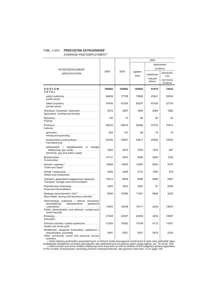 TABL. 5 (67). PRZECIÊTNE ZATRUDNIENIEa AVERAGE PAID EMPLOYMENT a 2004 stanowiska WYSZCZEGÓLNIENIE SPECIFICATION positions 2000 2003 ogó³em robotnicze total manual labour nierobotnicze non-manu al labour OGÓ£EM............................ TOTAL 196902 164962 165902 91070 74832 sektor publiczny . . . . . . . . . . . . . . . . . . . . . . . . public sector 99409 77708 75695 23641 52054 sektor prywatny . . . . . . . . . . . . . . . . . . . . . . . . private sector 97493 87254 90207 67429 22778 Rolnictwo, ³owiectwo i leœnictwo . . . . . . . . . . . . . Agriculture, hunting and forestry 5412 3697 3946 2084 1862 Rybactwo. . . . . . . . . . . . . . . . . . . . . . . . . . . . . . . Fishing 150 73 86 62 24 Przemys³ . . . . . . . . . . . . . . . . . . . . . . . . . . . . . . . Industry 68233 56633 58486 47572 10914 górnictwo . . . . . . . . . . . . . . . . . . . . . . . . . . . . . mining and quarrying 624 147 89 74 15 przetwórstwo przemys³owe . . . . . . . . . . . . . . . manufacturing 62326 53667 55617 45565 10052 5283 2819 2780 1933 847 Budownictwo . . . . . . . . . . . . . . . . . . . . . . . . . . . . Construction 10131 5633 5055 3820 1235 Handel i naprawy Ä. . . . . . . . . . . . . . . . . . . . . . . . Trade and repair Ä 14908 13455 14297 9500 4797 Hotele i restauracje . . . . . . . . . . . . . . . . . . . . . . . Hotels and restaurants 2082 2046 2115 1583 532 Transport, gospodarka magazynowa i ³¹cznoœæ . . . Transport, storage and communication 19314 8938 8586 5999 2587 Poœrednictwo finansowe . . . . . . . . . . . . . . . . . . . Financial intermediation 5952 4053 3007 67 2940 Obs³uga nieruchomoœci i firmÄ . . . . . . . . . . . . . . . Real estate, renting and business activities 8884 10496 11051 6826 4225 13933 16348 16177 2530 13647 21549 22587 22936 4239 18697 wytwarzanie i zaopatrywanie w energiê elektryczn¹, gaz, wodê . . . . . . . . . . . . . . . . . . electricity, gas and water supply Administracja publiczna i obrona narodowa; obowi¹zkowe ubezpieczenia spo³eczne i zdrowotne Ä . . . . . . . . . . . . . . . . . . . . . . . . . . . Public administration and defence; compul-sory social security Edukacja . . . . . . . . . . . . . . . . . . . . . . . . . . . . . . . Education Ochrona zdrowia i opieka spo³eczna. . . . . . . . . . 21263 15452 15159 4112 11047 Health and social work Dzia³alnoœæ us³ugowa komunalna, spo³eczna i indywidualna, pozosta³a . . . . . . . . . . . . . . . . . . 5091 5551 5001 2676 2325 Other community, social and personal service activities a Dane dotycz¹ podmiotów gospodarczych, w których liczba pracuj¹cych przekracza 9 osób oraz jednostek sfery bud¿etowej niezale¿nie od liczby pracuj¹cych; bez zatrudnionych za granic¹, patrz uwagi ogólne, ust. 12 na str. 109. a Data concern economic entities employing more 9 persons as well as entities of the budgetary sphere regardless of the number of employees; excluding persons employed abroad, see general notes,item 12 on page 109.