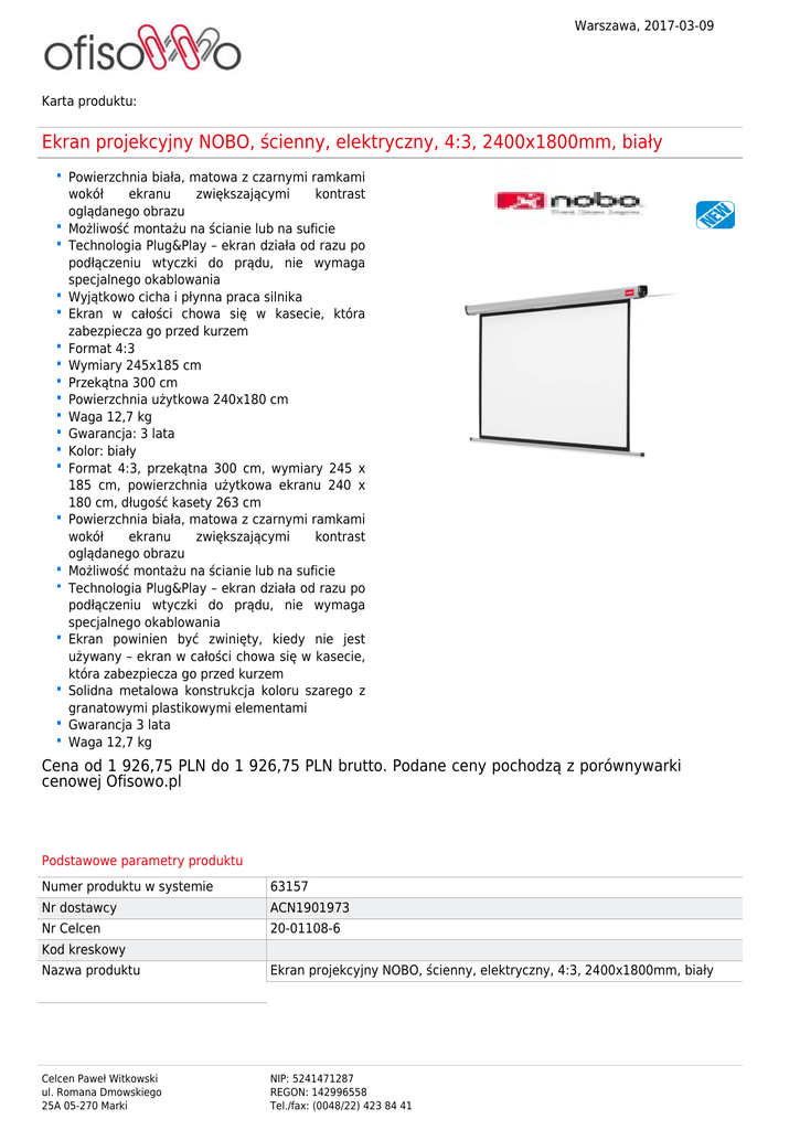 Warszawa, 2017-03-09 Karta produktu: Ekran projekcyjny NOBO, ścienny, elektryczny, 4:3, 2400x1800mm, biały Powierzchnia biała, matowa z czarnymi ramkami wokół ekranu zwiększającymi kontrast oglądanego obrazu Możliwość montażu na ścianie lub na suficie Technologia Plug&Play – ekran działa od razu po podłączeniu wtyczki do prądu, nie wymaga specjalnego okablowania Wyjątkowo cicha i płynna praca silnika Ekran w całości chowa się w kasecie, która zabezpiecza go przed kurzem Format 4:3 Wymiary 245x185 cm Przekątna 300 cm Powierzchnia użytkowa 240x180 cm Waga 12,7 kg Gwarancja: 3 lata Kolor: biały Format 4:3, przekątna 300 cm, wymiary 245 x 185 cm, powierzchnia użytkowa ekranu 240 x 180 cm, długość kasety 263 cm Powierzchnia biała, matowa z czarnymi ramkami wokół ekranu zwiększającymi kontrast oglądanego obrazu Możliwość montażu na ścianie lub na suficie Technologia Plug&Play – ekran działa od razu po podłączeniu wtyczki do prądu, nie wymaga specjalnego okablowania Ekran powinien być zwinięty, kiedy nie jest używany – ekran w całości chowa się w kasecie, która zabezpiecza go przed kurzem Solidna metalowa konstrukcja koloru szarego z granatowymi plastikowymi elementami Gwarancja 3 lata Waga 12,7 kg Cena od 1 926,75 PLN do 1 926,75 PLN brutto. Podane ceny pochodzą z porównywarki cenowej Ofisowo.pl Podstawowe parametry produktu Numer produktu w systemie 63157 Nr dostawcy ACN1901973 Nr Celcen 20-01108-6 Kod kreskowy Nazwa produktu Ekran projekcyjny NOBO, ścienny, elektryczny, 4:3, 2400x1800mm, biały Celcen Paweł Witkowski ul. Romana Dmowskiego 25A 05-270 Marki NIP: 5241471287 REGON: 142996558 Tel./fax: (0048/22) 423 84 41 Warszawa, 2017-03-09 Karta katalogowa produktu cd. Ekran projekcyjny NOBO, ścienny, elektryczny, 4:3, 2400x1800mm, biały Opis Powierzchnia biała, matowa z czarnymi ramkami wokół ekranu zwiększającymi kontrast oglądanego obrazu; możliwość montażu na ścianie lub na suficie; technologia Plug&Play – ekran działa od razu po podłączeniu wtyczki do prądu, nie wymaga specjalnego okablowania; wyjątkowo cicha i płynna praca silnika; ekran w całości chowa się w kasecie, która zabezpiecza go przed kurzem; format 4:3; wymiary 245x185 cm; przekątna 300 cm; powierzchnia użytkowa 240x180 cm; waga 12,7 kg; gwarancja: 3 lata; kolor: biały; Format 4:3, przekątna 300 cm, wymiary 245 x 185 cm, powierzchnia użytkowa ekranu 240 x 180 cm, długość kasety 263 cm; Powierzchnia biała, matowa z czarnymi ramkami wokół ekranu zwiększającymi kontrast oglądanego obrazu; Możliwość montażu na ścianie lub na suficie; Technologia Plug&Play – ekran działa od razu po podłączeniu wtyczki do prądu, nie wymaga specjalnego okablowania; Ekran powinien być zwinięty, kiedy nie jest używany – ekran w całości chowa się w kasecie, która zabezpiecza go przed kurzem; Solidna metalowa konstrukcja koloru szarego z granatowymi plastikowymi elementami; Gwarancja 3 lata; Waga 12,7 kg Kategoria Ekrany Klasa Premium Marka NOBO Kolor Kolor Biały Cecha Produkt Ekran projekcyjny Rodzaj Ścienny W ofercie od 2017-01 Typ Elektryczny Wymiary Format 4:3 Wymiary (mm) 2400x1600 Certyfikaty Hit Standard Ilość lat gwarancji 3 Nowy produkt w ofercie Nowość Celcen Paweł Witkowski ul. Romana Dmowskiego 25A 05-270 Marki NIP: 5241471287 REGON: 142996558 Tel./fax: (0048/22) 423 84 41 Warszawa, 2017-03-09 Karta katalogowa produktu cd. Ekran projekcyjny NOBO, ścienny, elektryczny, 4:3, 2400x1800mm, biały Wspólny słownik zamówień CPV 30237210-4 Serdecznie zapraszamy do współpracy zespół. Ofisowo.pl Celcen Paweł Witkowski ul. Romana Dmowskiego 25A 05-270 Marki NIP: 5241471287 REGON: 142996558 Tel./fax: (0048/22) 423 84 41
